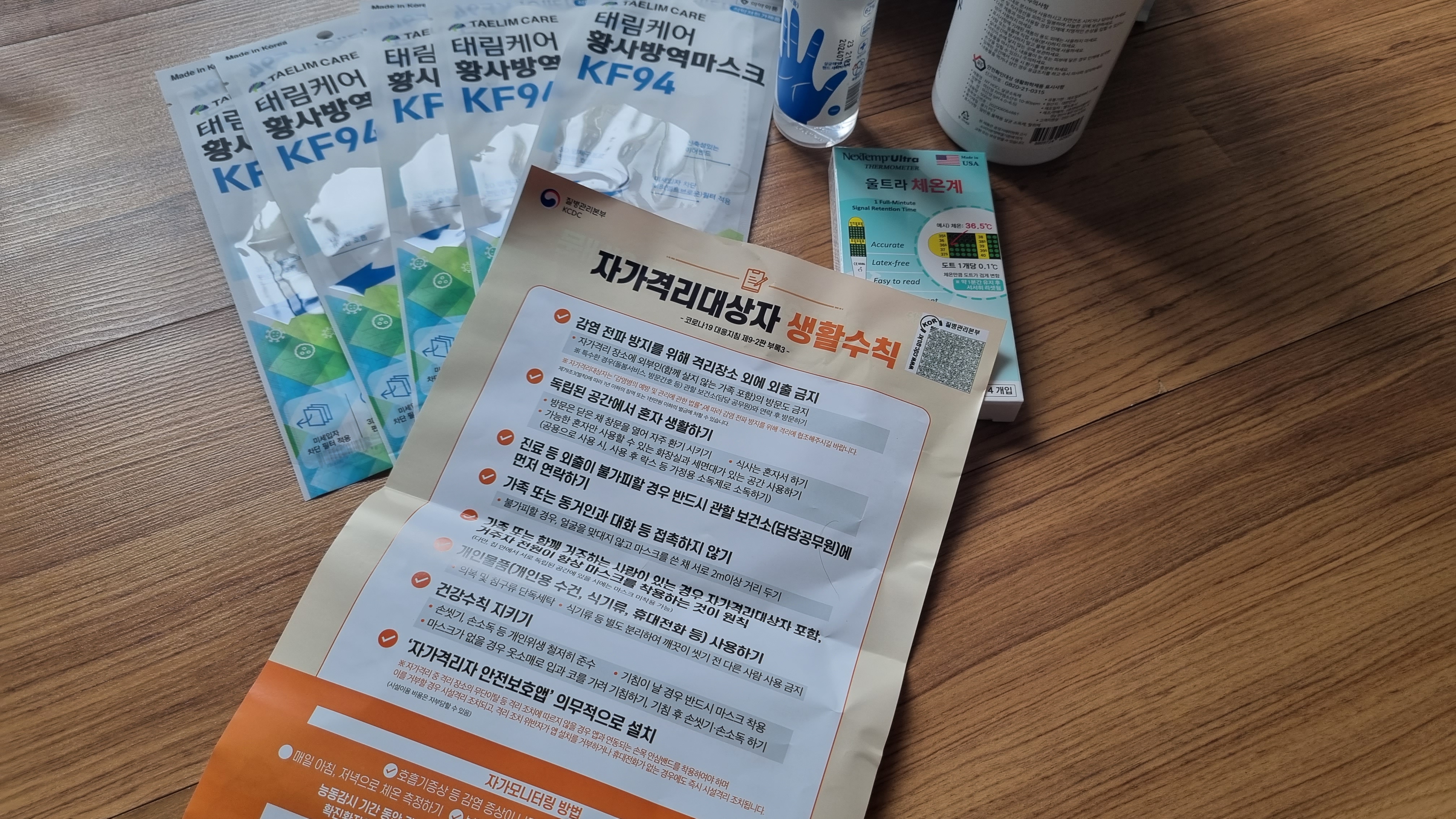 저희는 자가격리자가 2명이라 2명에 대한 위생키트가 왔어요. 하나의 쇼핑백에 KF-94 마스크 5개, 손 소독제(100g) 1개, 살균수(500ml) 1개, 일회용 체온계(4개입) 1개가 들어 있어요. 그런데 저희 자가격리 끝났어요. 자가격리 끝나고 다음날 위생키트 왔어요. 갑자기 확진자가 폭발적으로 늘어나면서 공무원도 너무 바쁜가 봐요. 불쌍해요. 다행히도 저희는 집에 위생키트에 포함된 것들이 모두 있었어요.