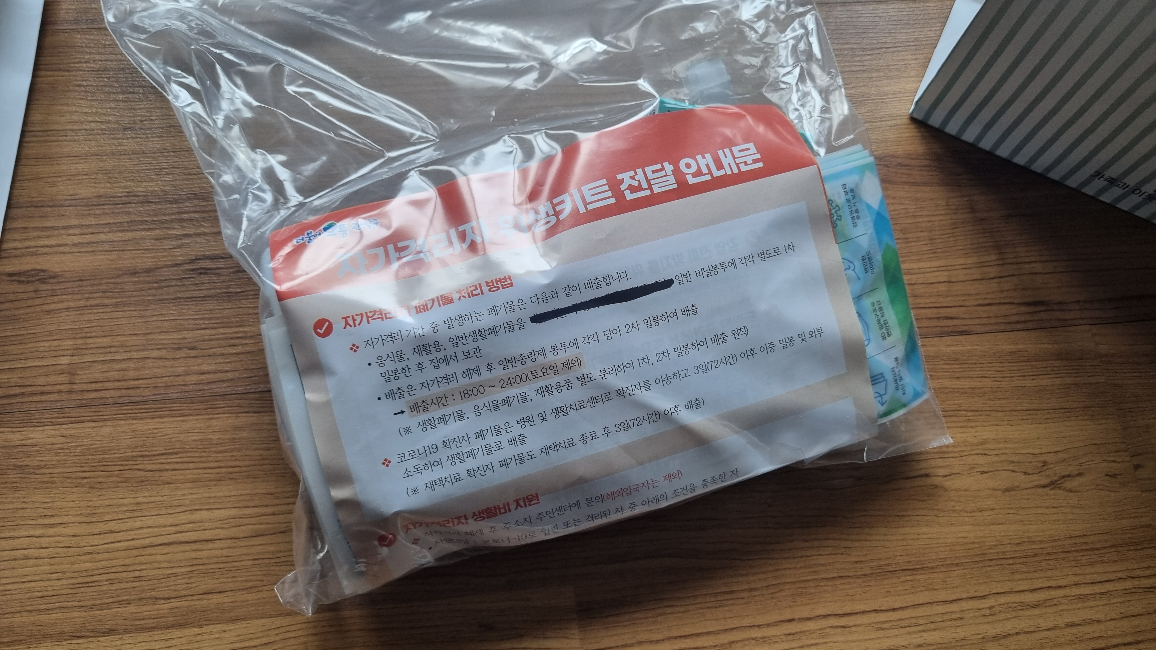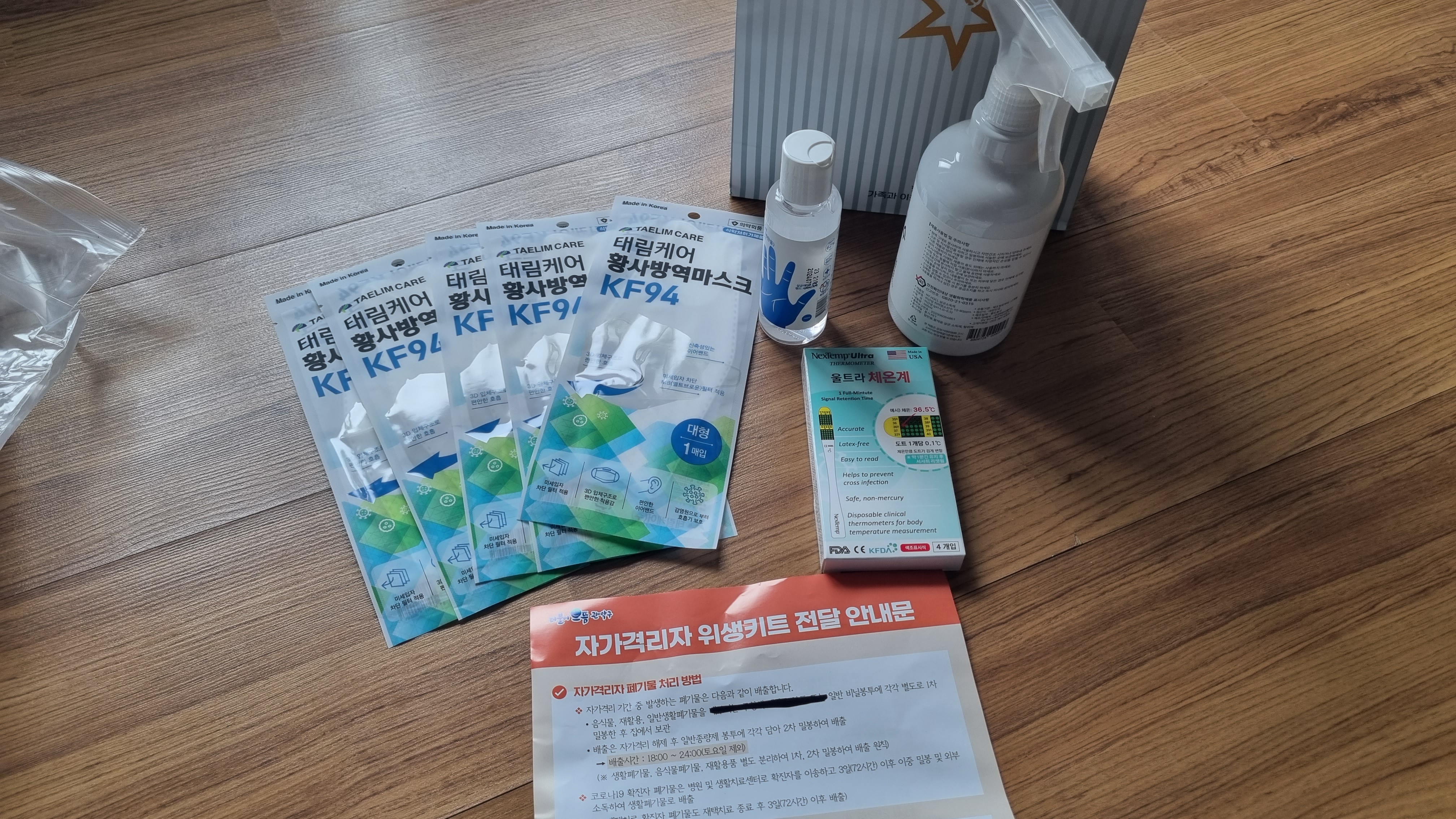 저희는 자가격리자가 2명이라 2명에 대한 위생키트가 왔어요. 하나의 쇼핑백에 KF-94 마스크 5개, 손 소독제(100g) 1개, 살균수(500ml) 1개, 일회용 체온계(4개입) 1개가 들어 있어요. 그런데 저희 자가격리 끝났어요. 자가격리 끝나고 다음날 위생키트 왔어요. 갑자기 확진자가 폭발적으로 늘어나면서 공무원도 너무 바쁜가 봐요. 불쌍해요. 다행히도 저희는 집에 위생키트에 포함된 것들이 모두 있었어요.
