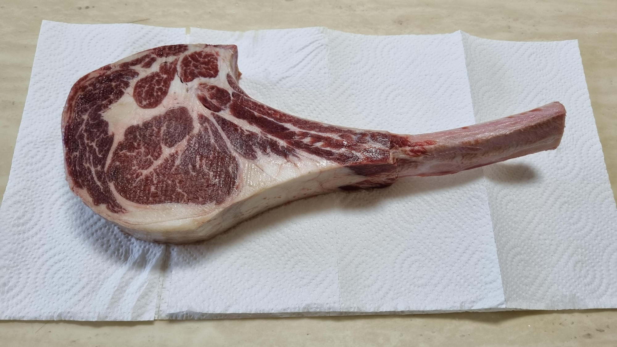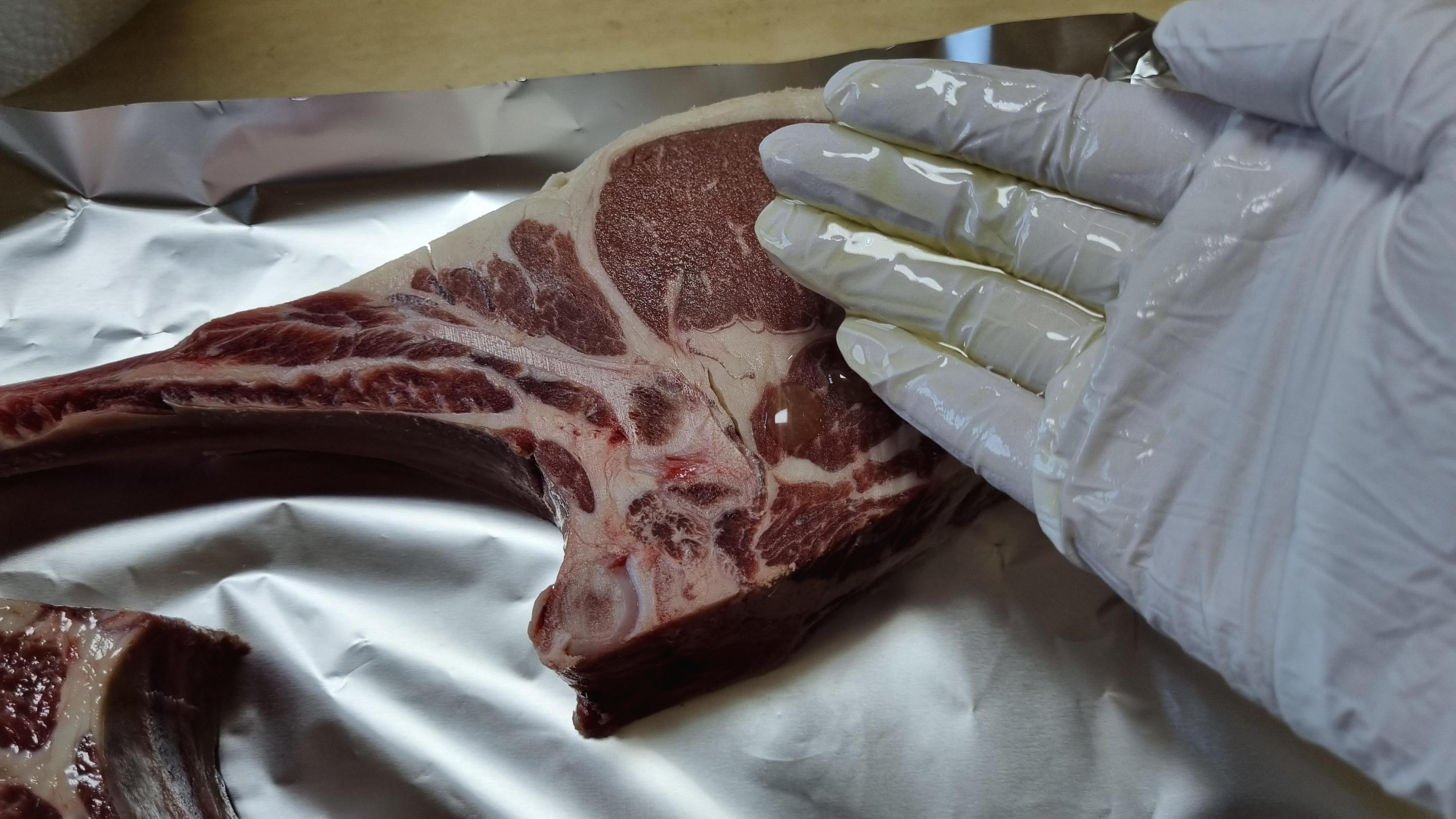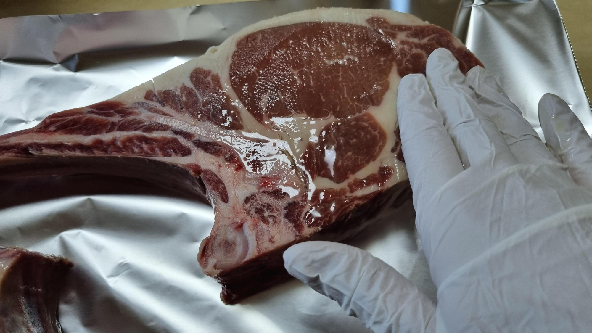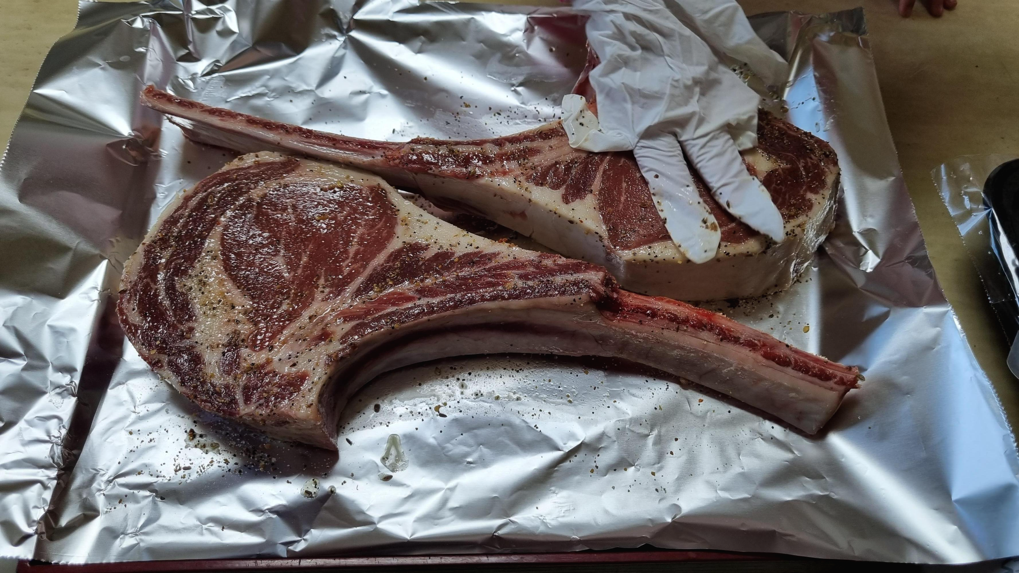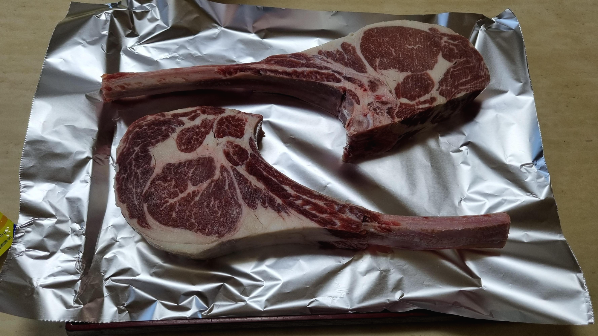 핏물을 제거하고 마리네이드를 하기 위해 호일 위에 토마호크를 올려놨어요. 950g 2개. 4인분 정도라고 했어요.