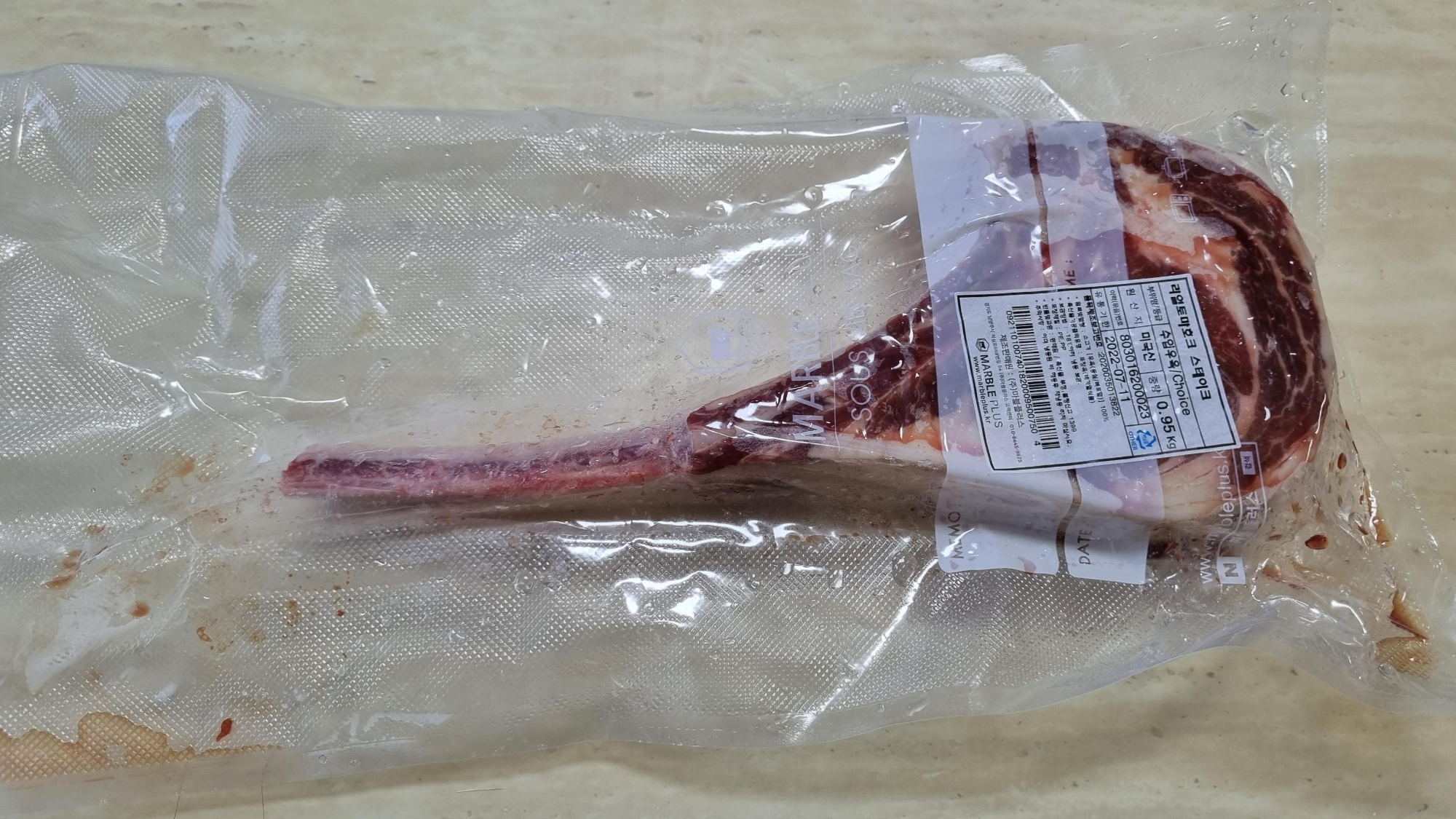 저는 상온에 충분히 해동할 시간이 없어서 진공 상태의 토마호크를 뜨거운 물에 잠시 담가 뒀어요. 30분 정도 담가 뒀더니 충분히 해동이 됐어요.