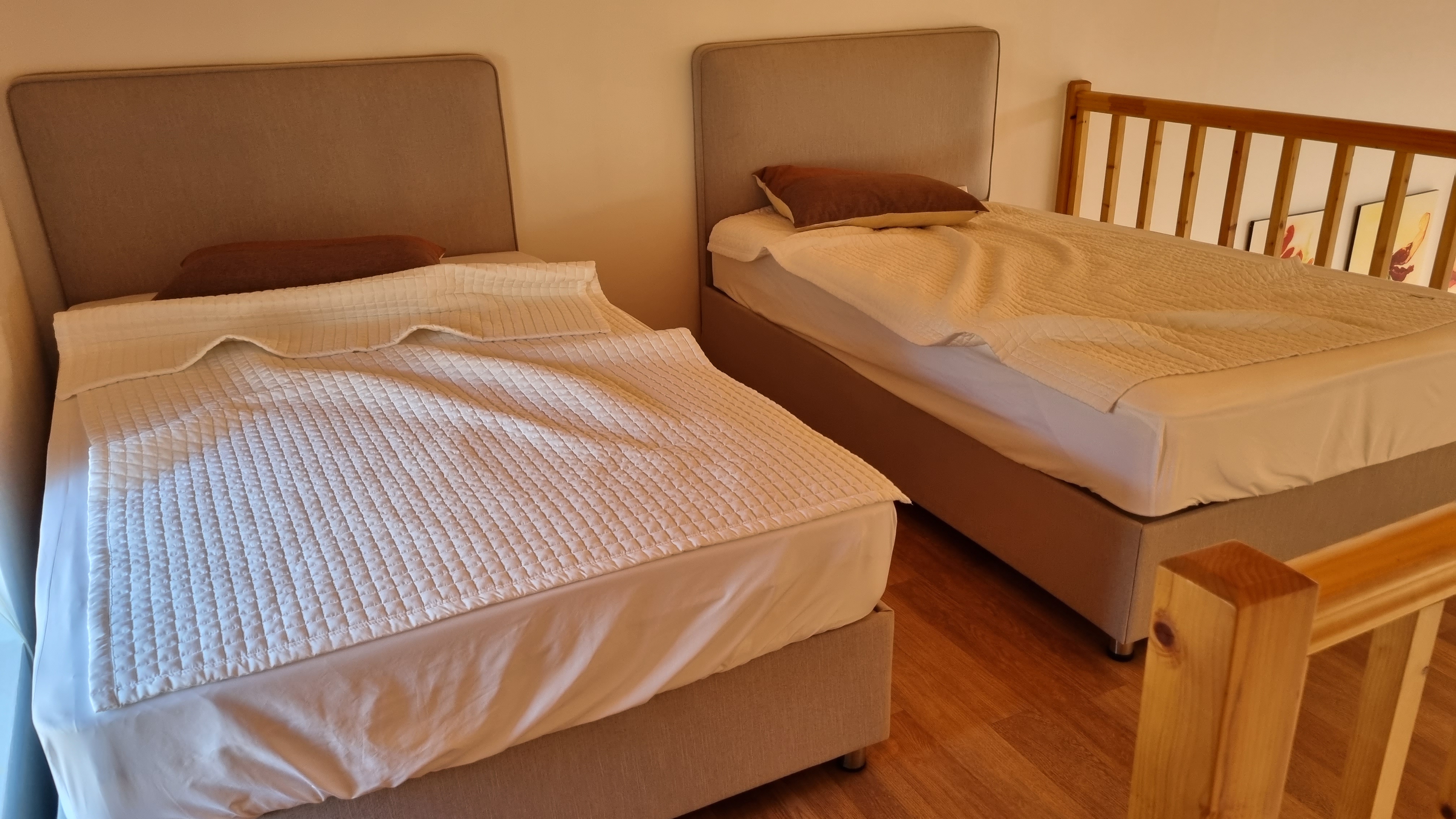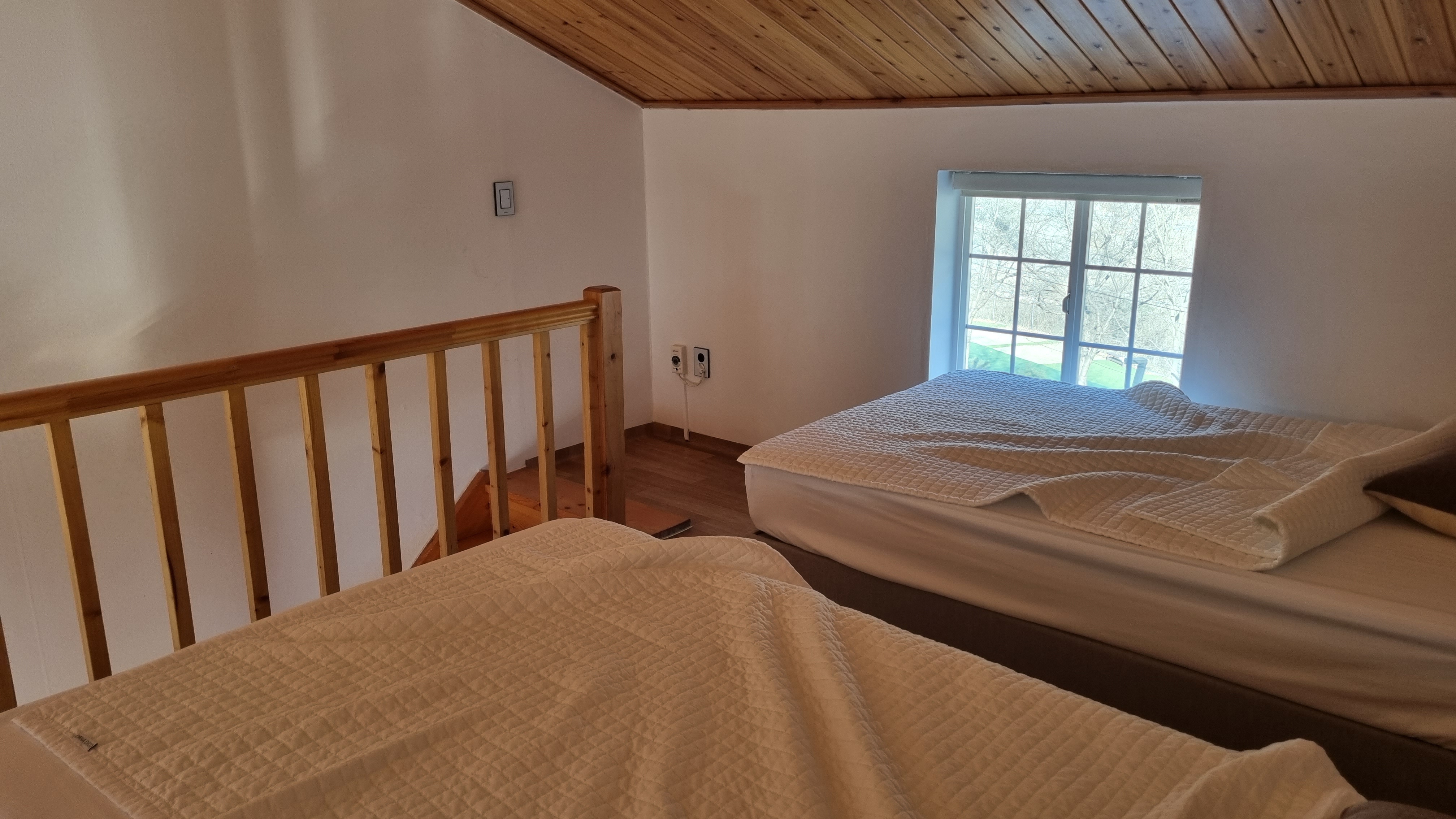 2층에는 싱글 침대가 2개 있어요. 침대가 2개나 있어서 뭘 할 수는 없고 잠만 잘 수 있어요.