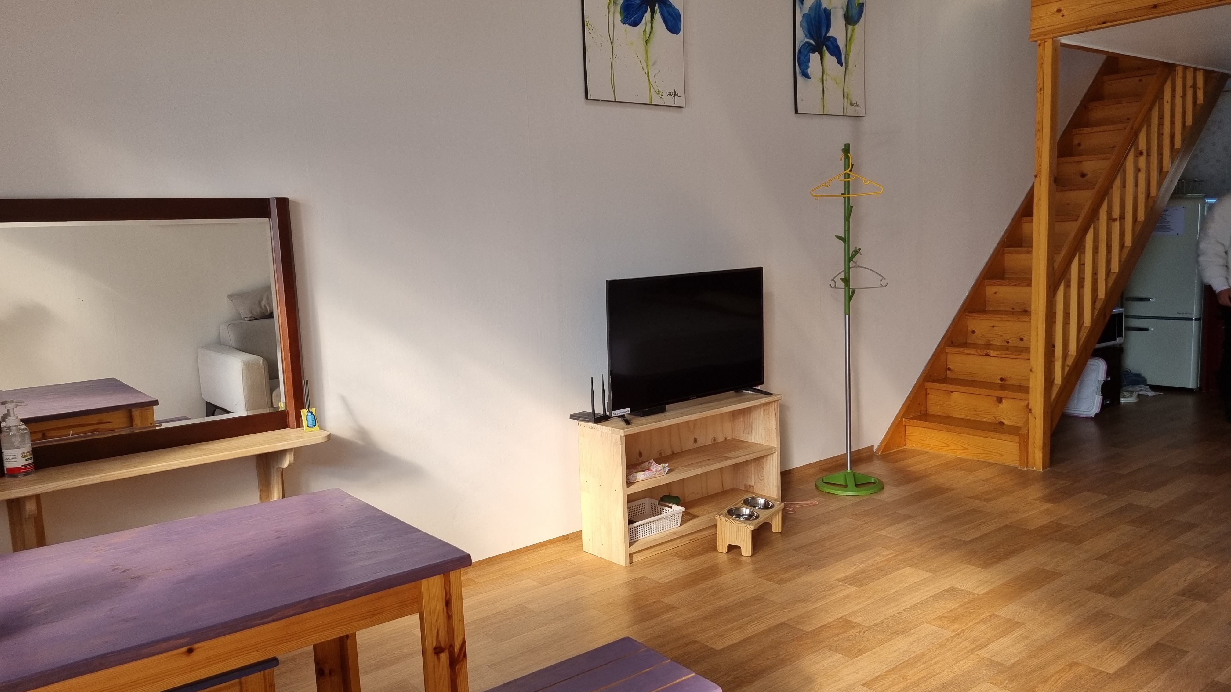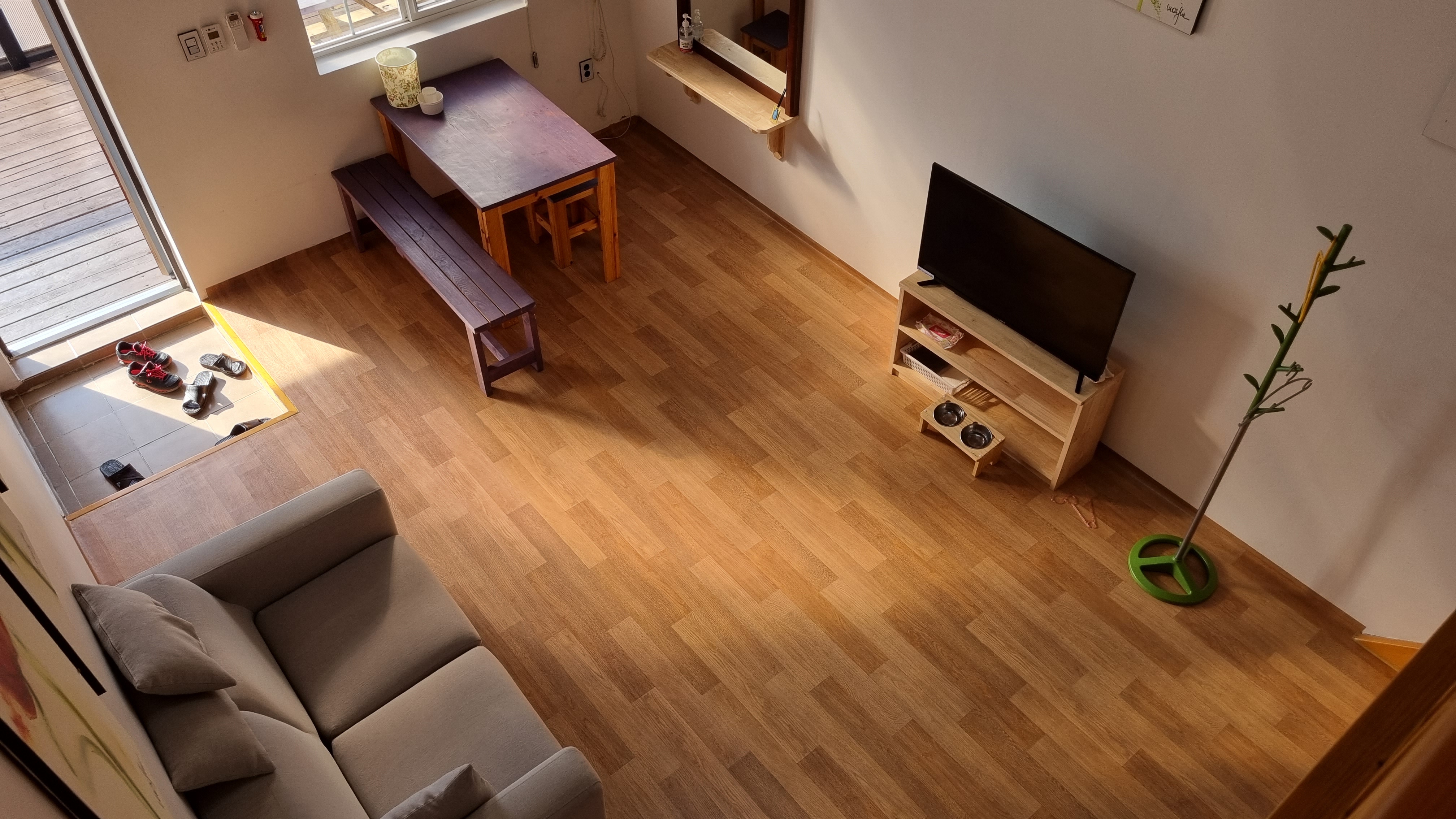 2층에서 내려다본 1층이에요. 생각보다 넓어요. 멍뭉이 밥그릇도 준비되어 있어요.