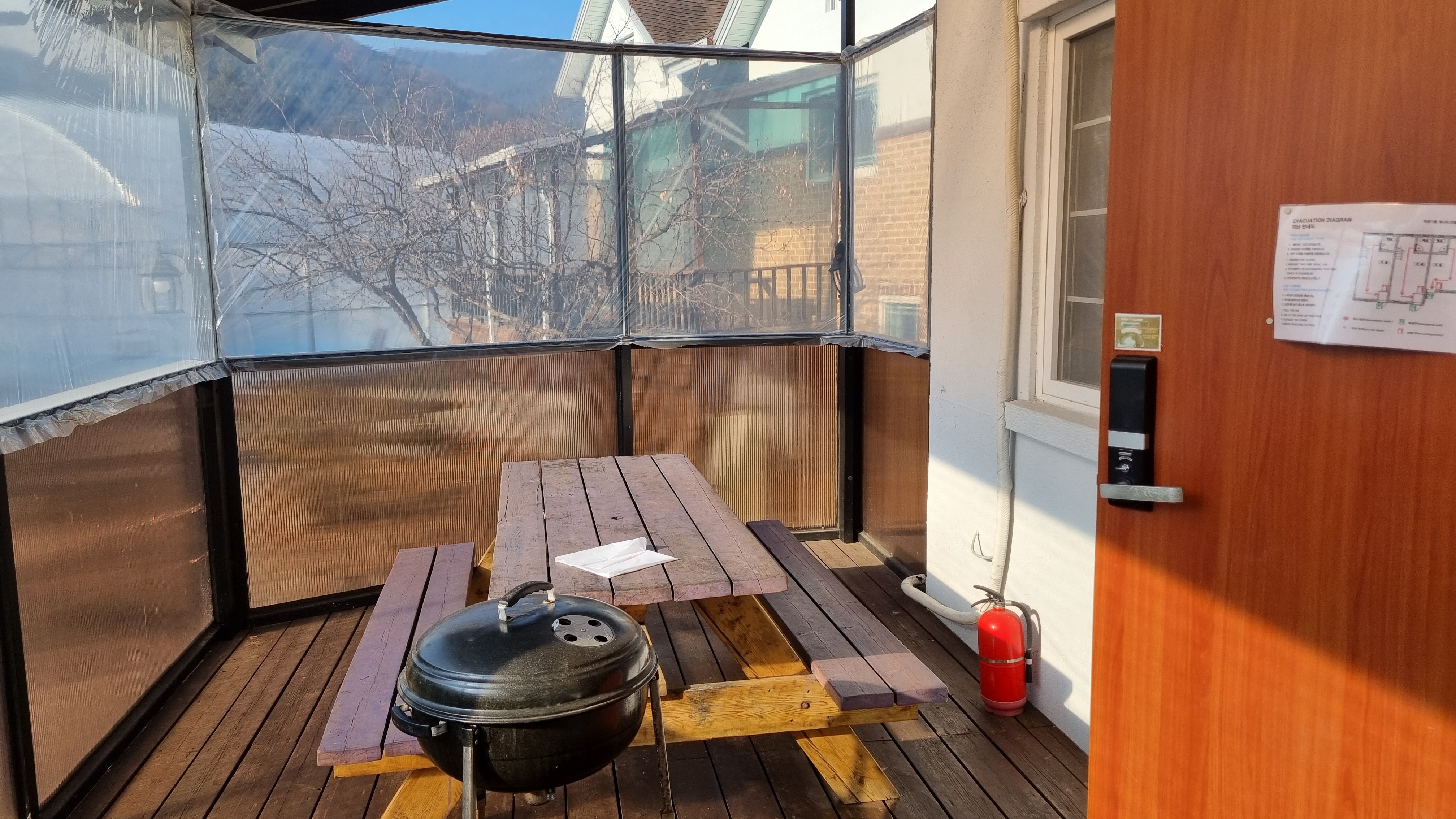 민들레 현관문 바로 앞에서 바베큐 시설이 있어요. 추운 겨울에도 바람을 막아줄 비닐이 설치돼 있어요. 하지만 그래도 추워요. 겨울이라면 패딩 필수.