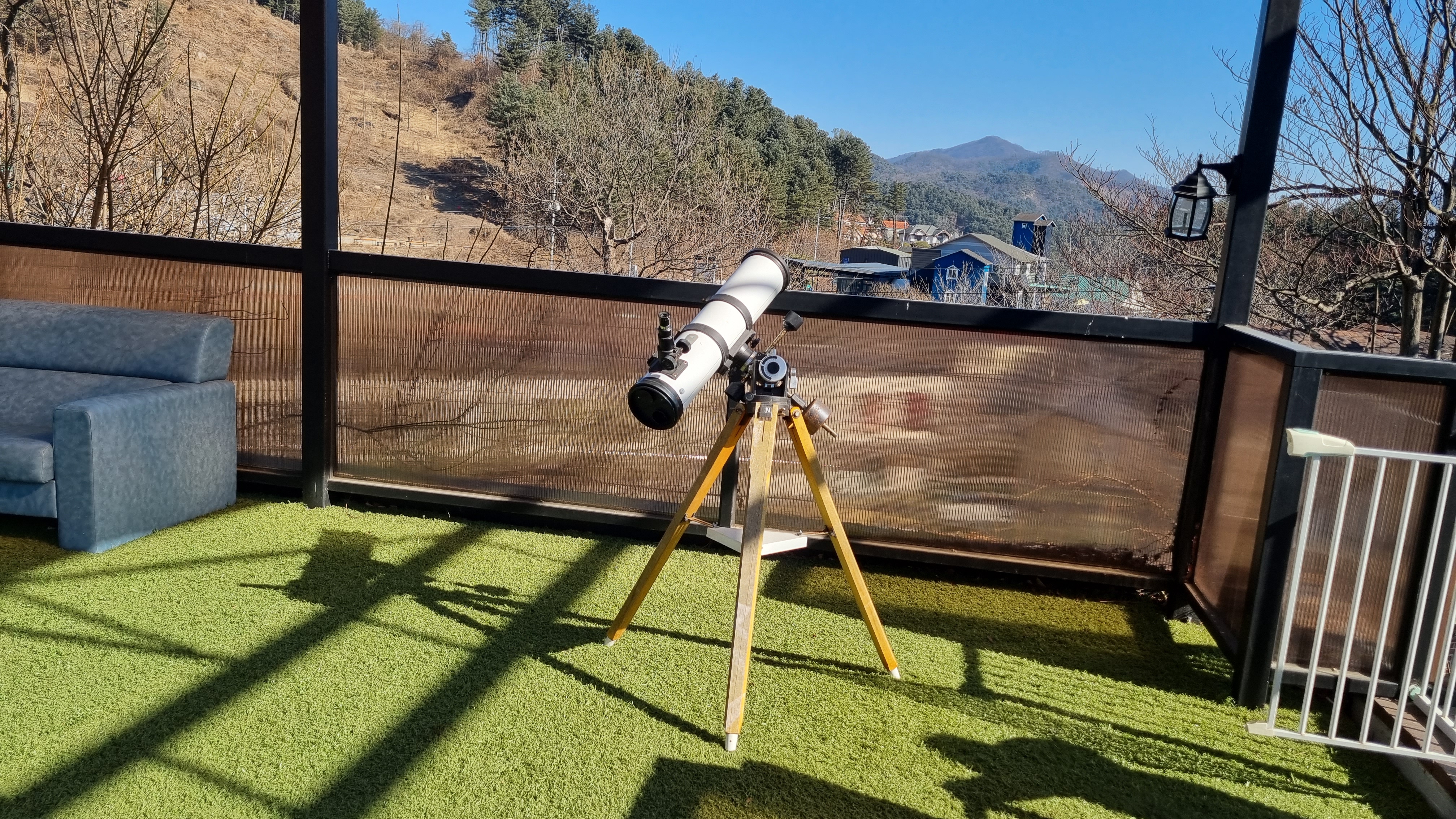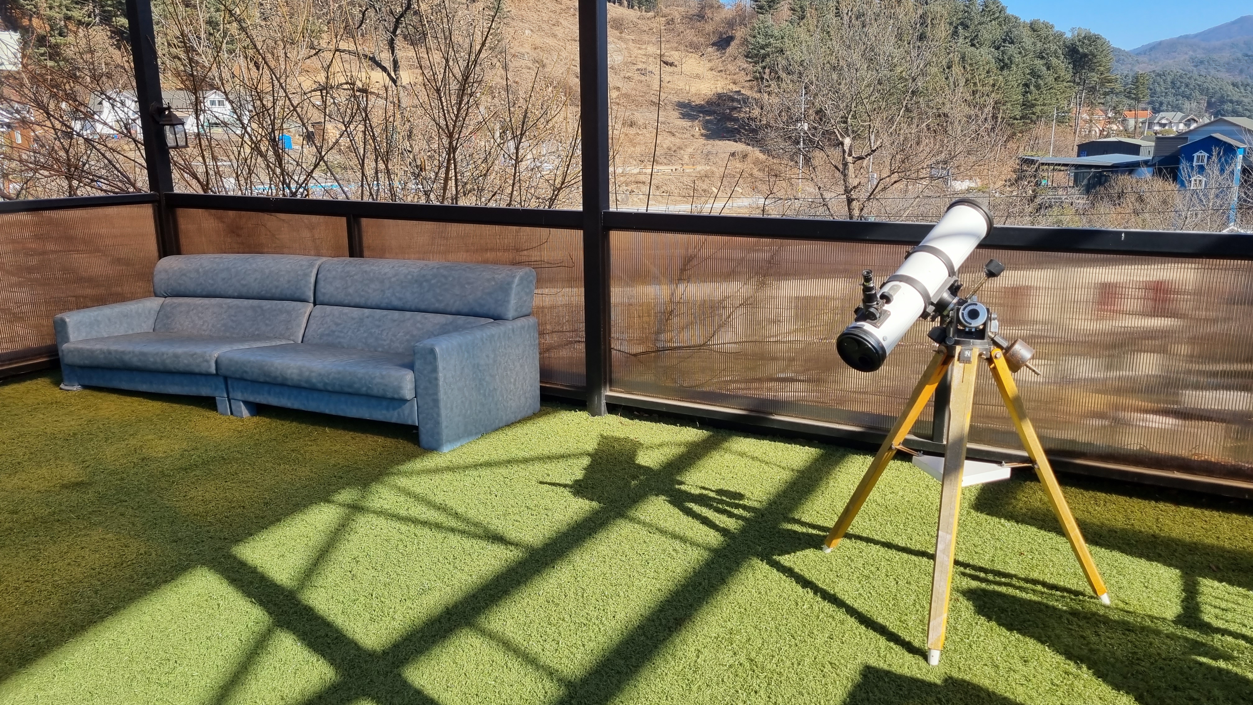 그리고 인조 잔디가 보여요. 이 인조잔디에서 강아지들과 함께 뛸 수 있어요. 그리고 위의 사진에서 보이는 처음 보는 물건은 별을 관찰하는 건가?! 잘 모르겠어요. 날씨가 워낙 추워서 밖에 오래 있기 힘들어요.