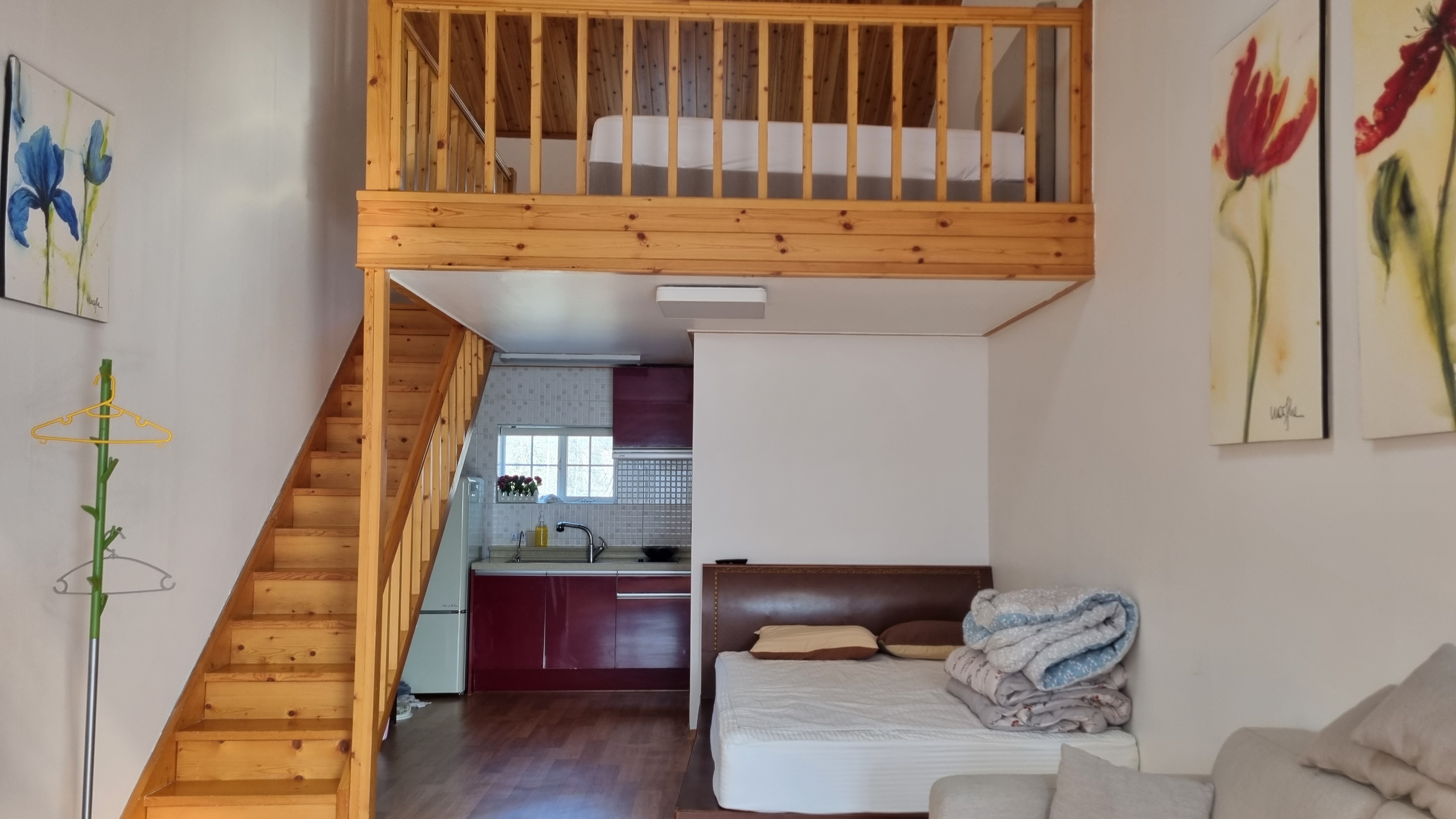 1층에 화장실과 주방이 있고 침대도 있어요. 위의 사진에서 침대 뒤로 화장실이 있어요.