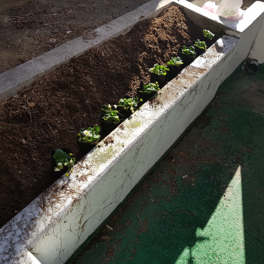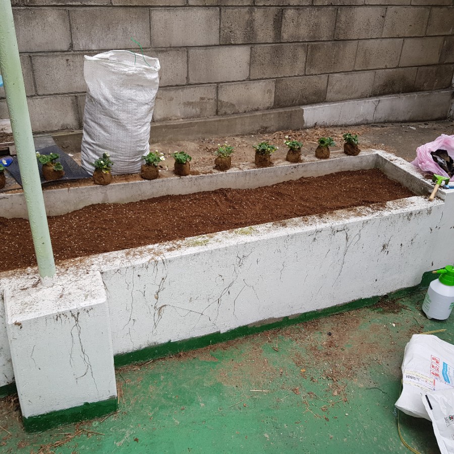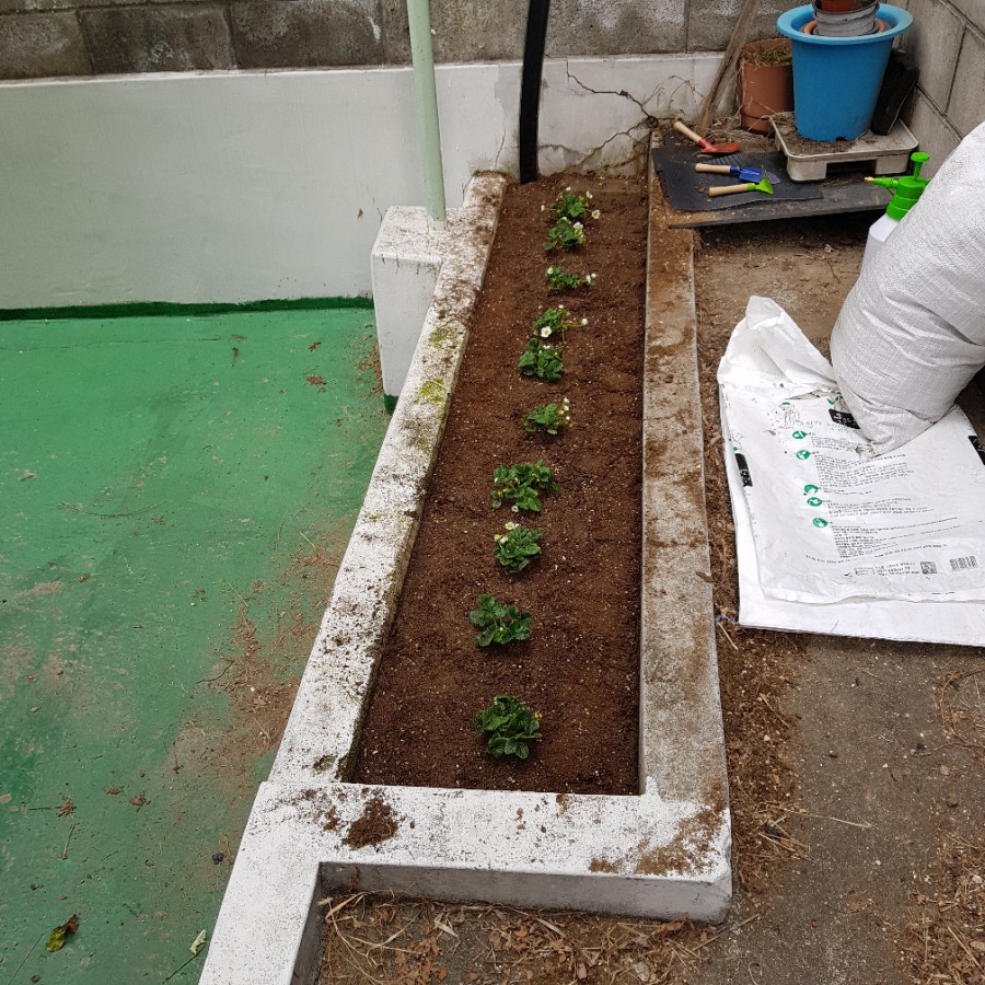 드디어 배양토가 도착했다. 돌을 치우고 풀은 걷어내고 배양토를 뿌려줬다. 그리고 정성스럽게 딸기 모종을 심었다. 10개의 모든 모종에 꽃이 피거나 꽃받침을 볼 수 있었다. 한 그루 모종에는 꽃받침이 11개나 있었다. 딸기 11개가 열릴 생각을 하니 흥분됐다. 그리고 각 모종에 물 200ml을 줬다.