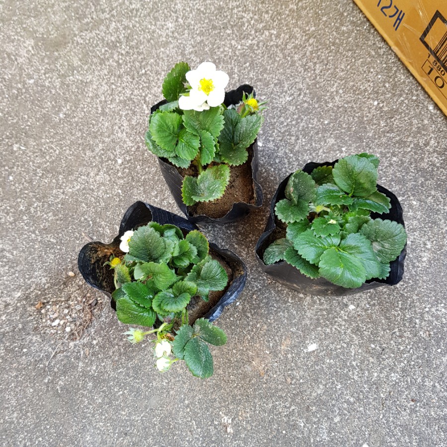 딸기 모종이 들어있는 택배 박스를 뜯었다. 3그루에서 이미 꽃이 피어 있었다. 사실 씨앗부터 키우려고 했으나 키우기 어렵다는 얘기가 있어서 딸기 모종을 구입했는데 이미 꽃이 피어 있어서 뭔가 아쉽기도 했지만 딸기 꽃을 처음 봐서 그런지 신기하기도 하고 예쁘기도 했다. 그리고 배양토가 없어서 노지에서 방치하고 말았다.