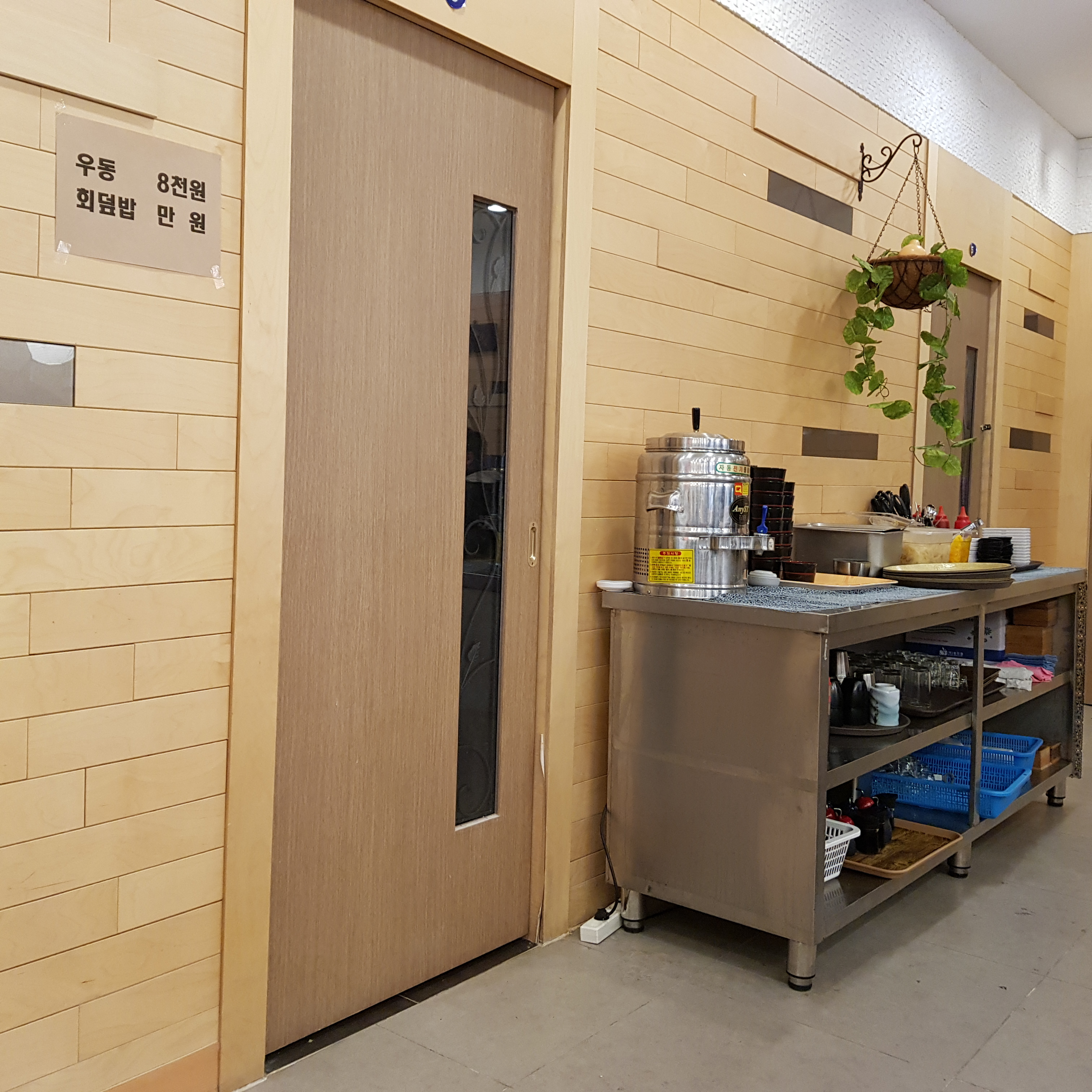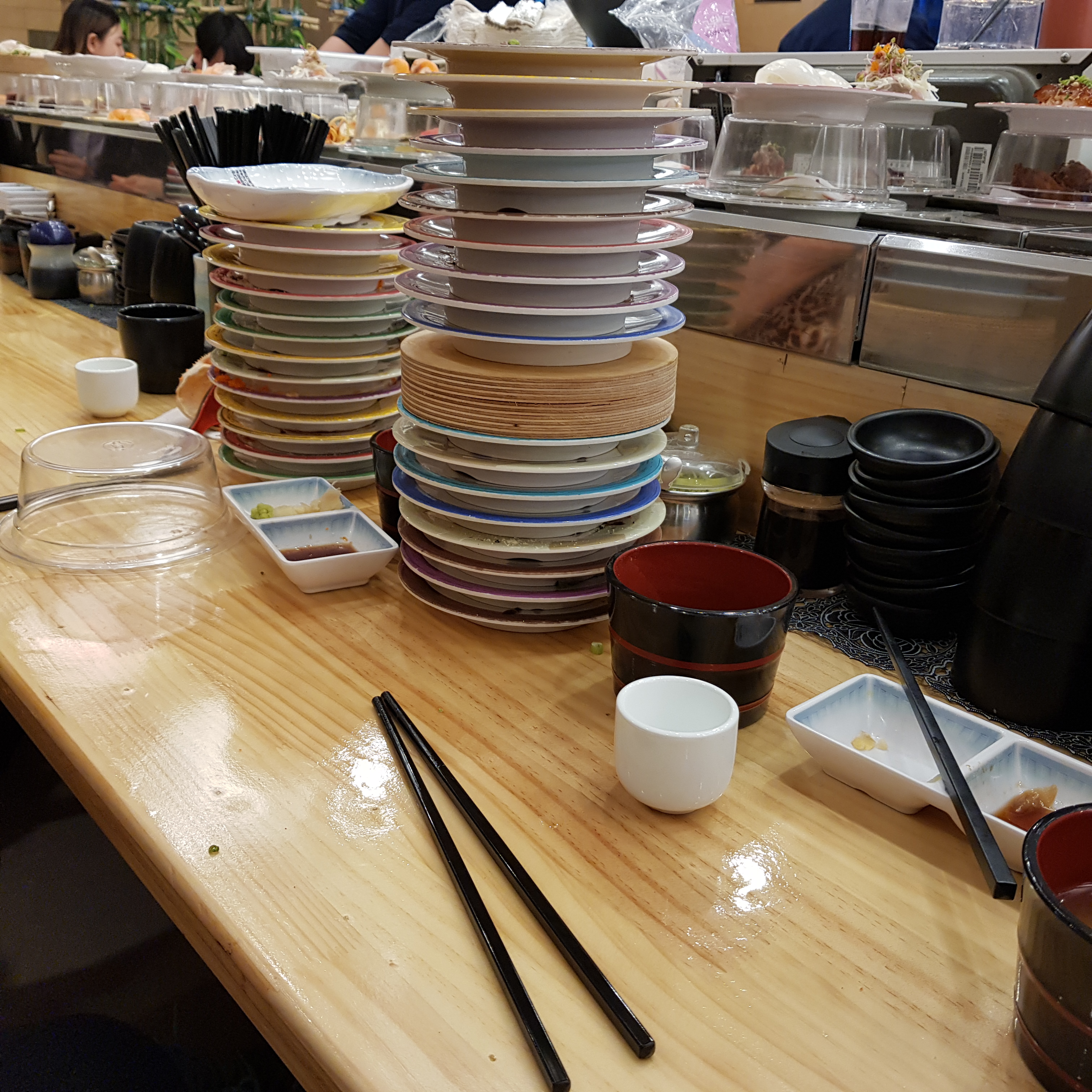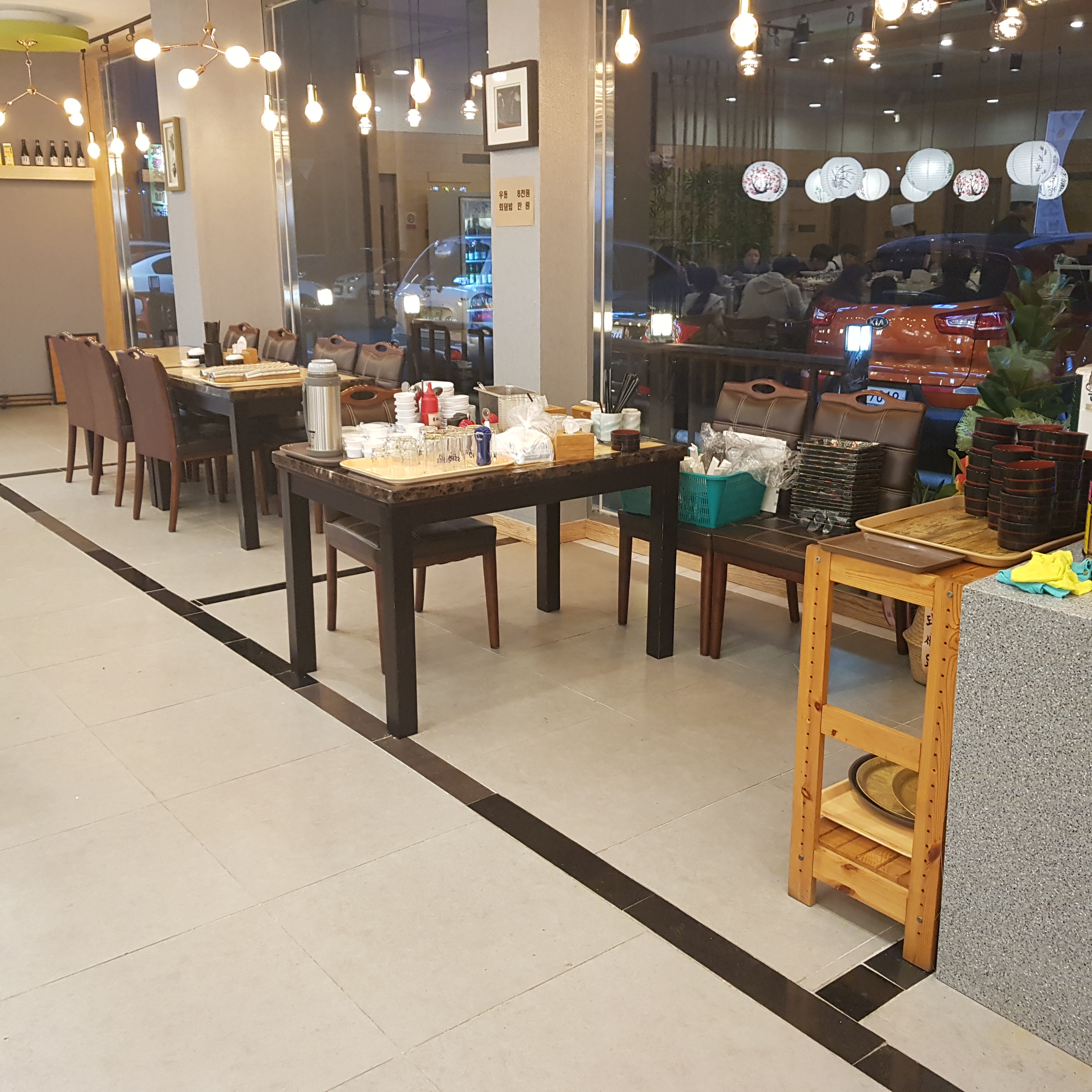 기다리면서 찍었다. 테이블은 아래 사진에서 보이는 게 전부다. 오른쪽으로 6인 식탁이 2개 정도 있기는 하지만 회전 레일이 없어 사용하지 않는 것 같았다.