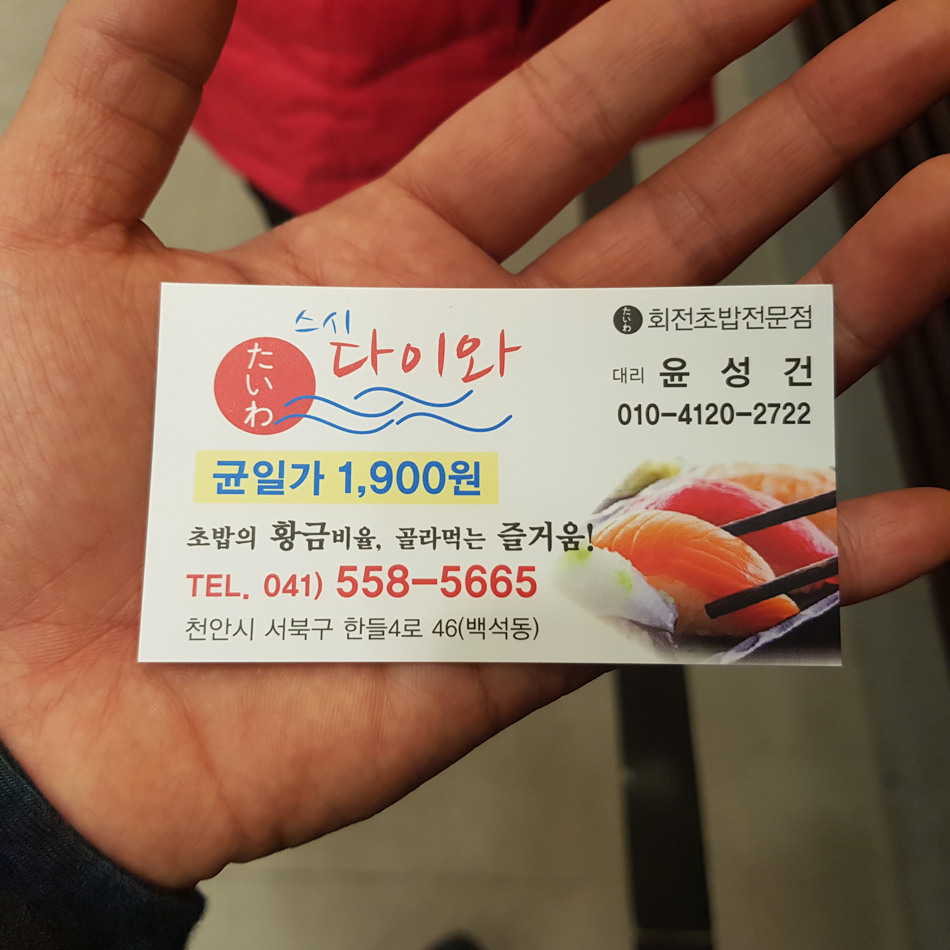 며칠 전부터 회전초밥이 먹고 싶었다가 안 먹고 싶었다가 변덕을 부렸는데 마침 천안에 회전초밥 전문점이 오픈했다는 소식을 듣고 스시 다이와에 갔다. 균일가 1900원.