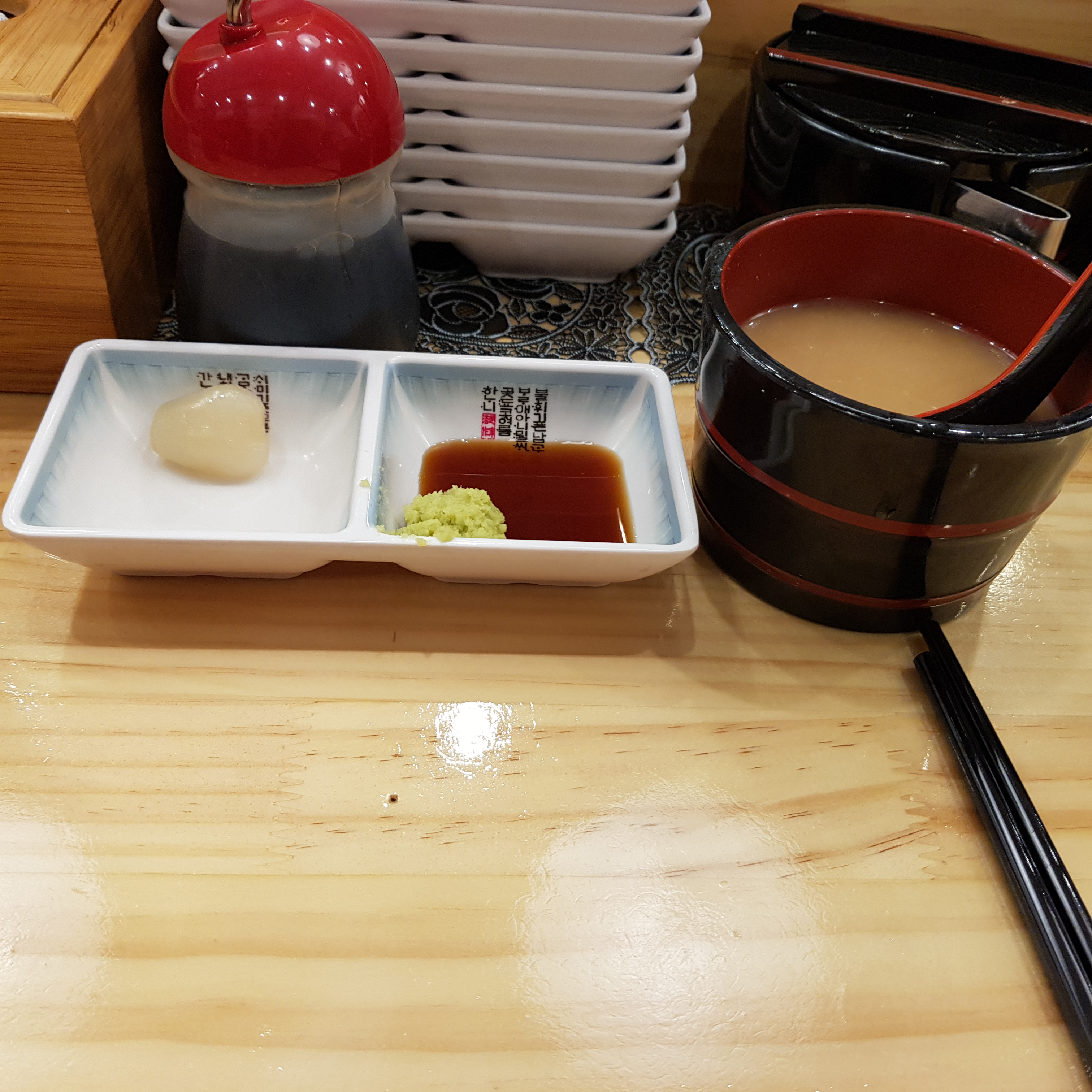 미소 장국은 직원이 갖다 주고 나머지는 눈 앞에 보이는 걸 이용하면 된다. 저 된장국이 너무 짰다. 원래 짜면 자극적이고 더 맛있게 느껴지는데 미소 장국은 별로였다.