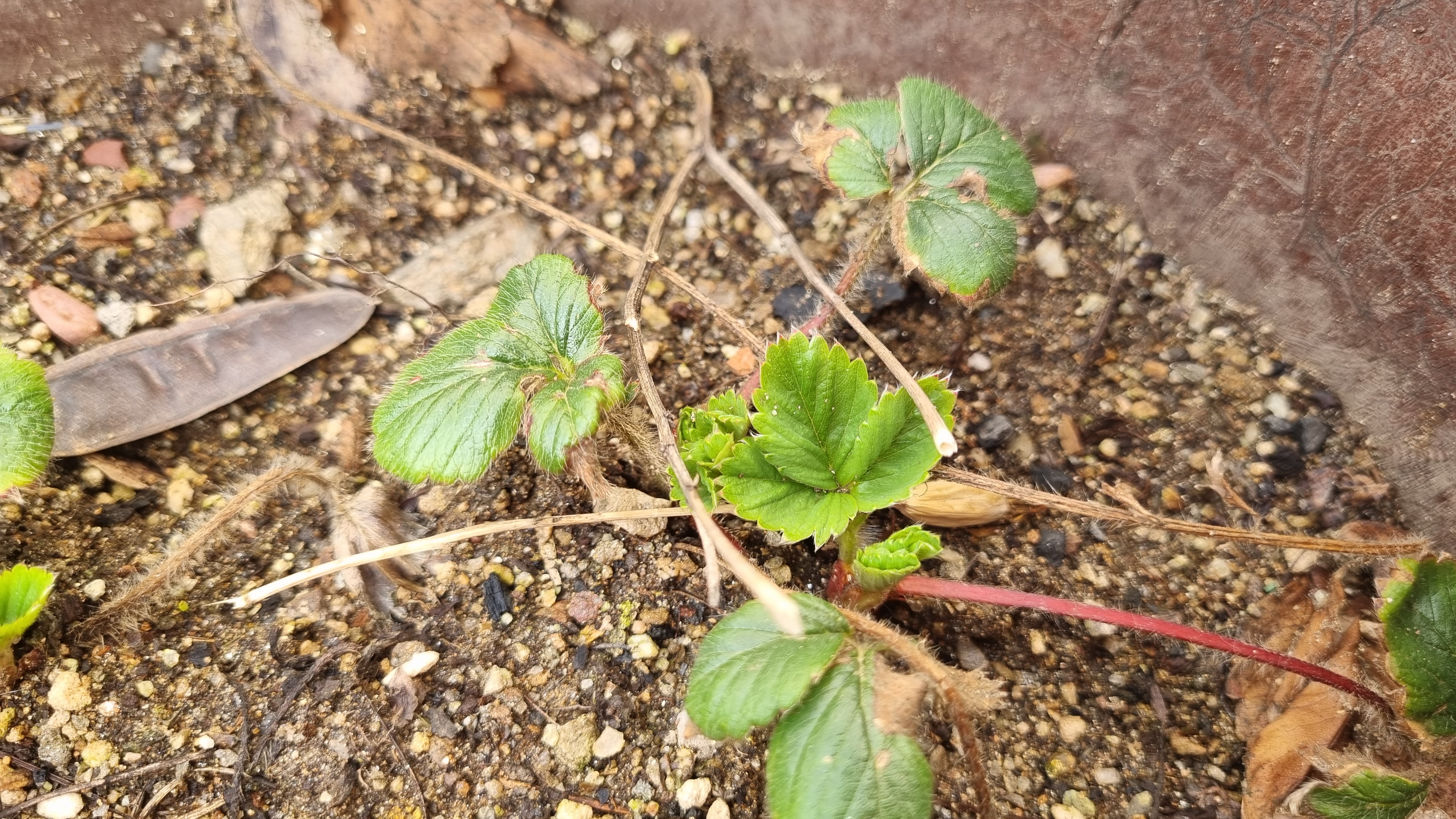 화분 딸기에서 새 딸기 잎이 자라고 있어요.