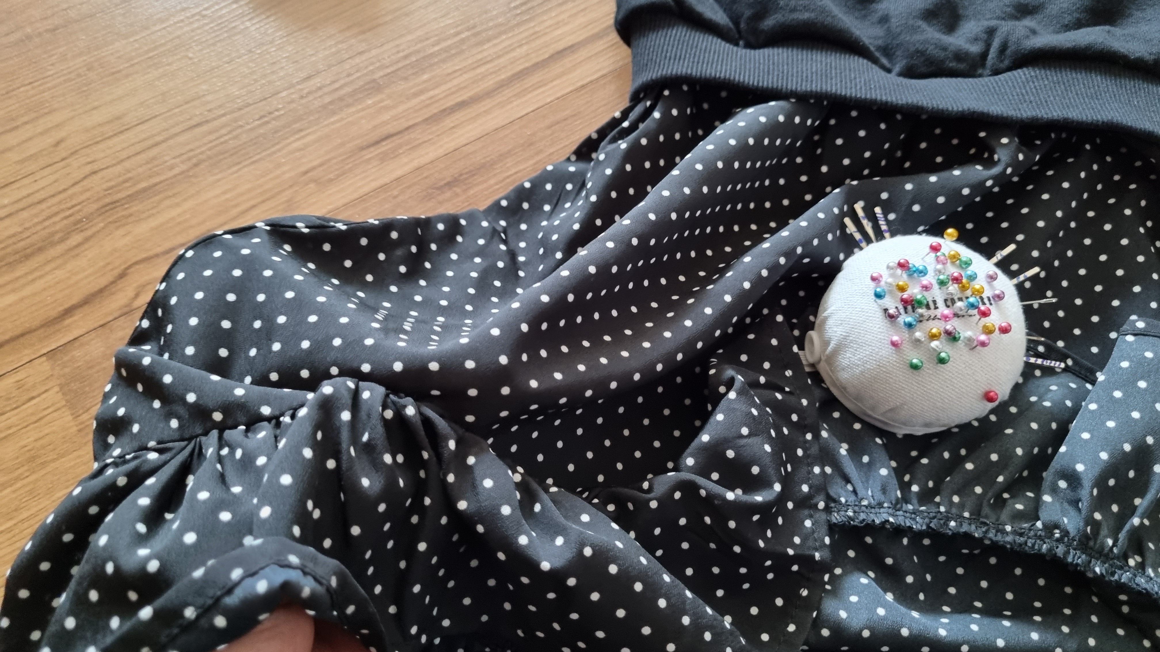긴 치맛단을 접어서 시침핀으로 고정해요.
