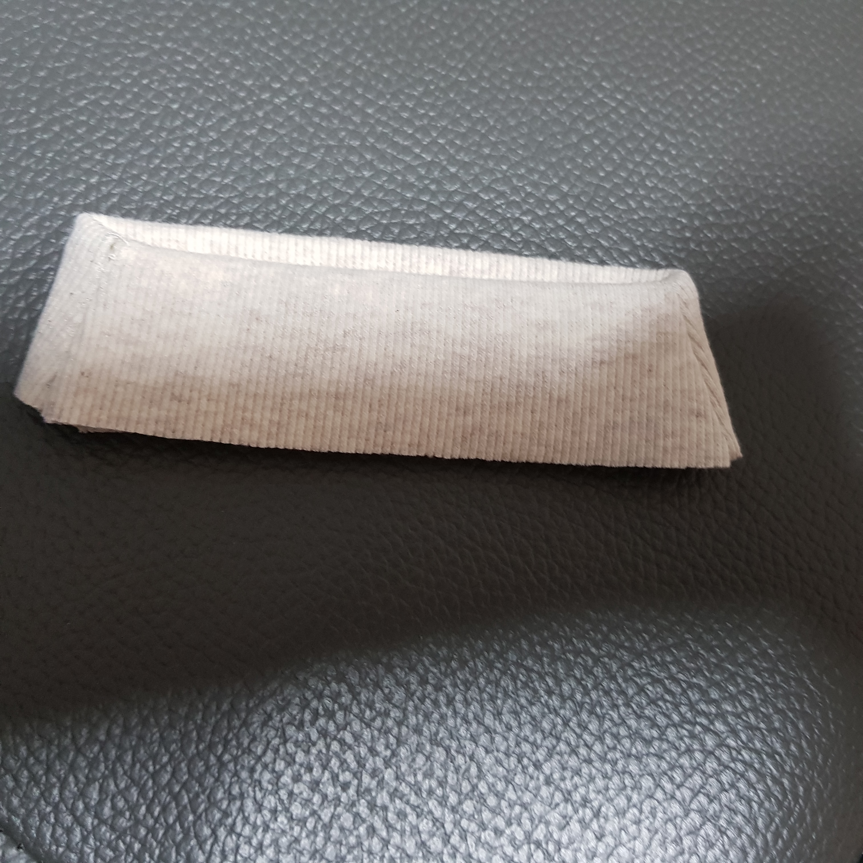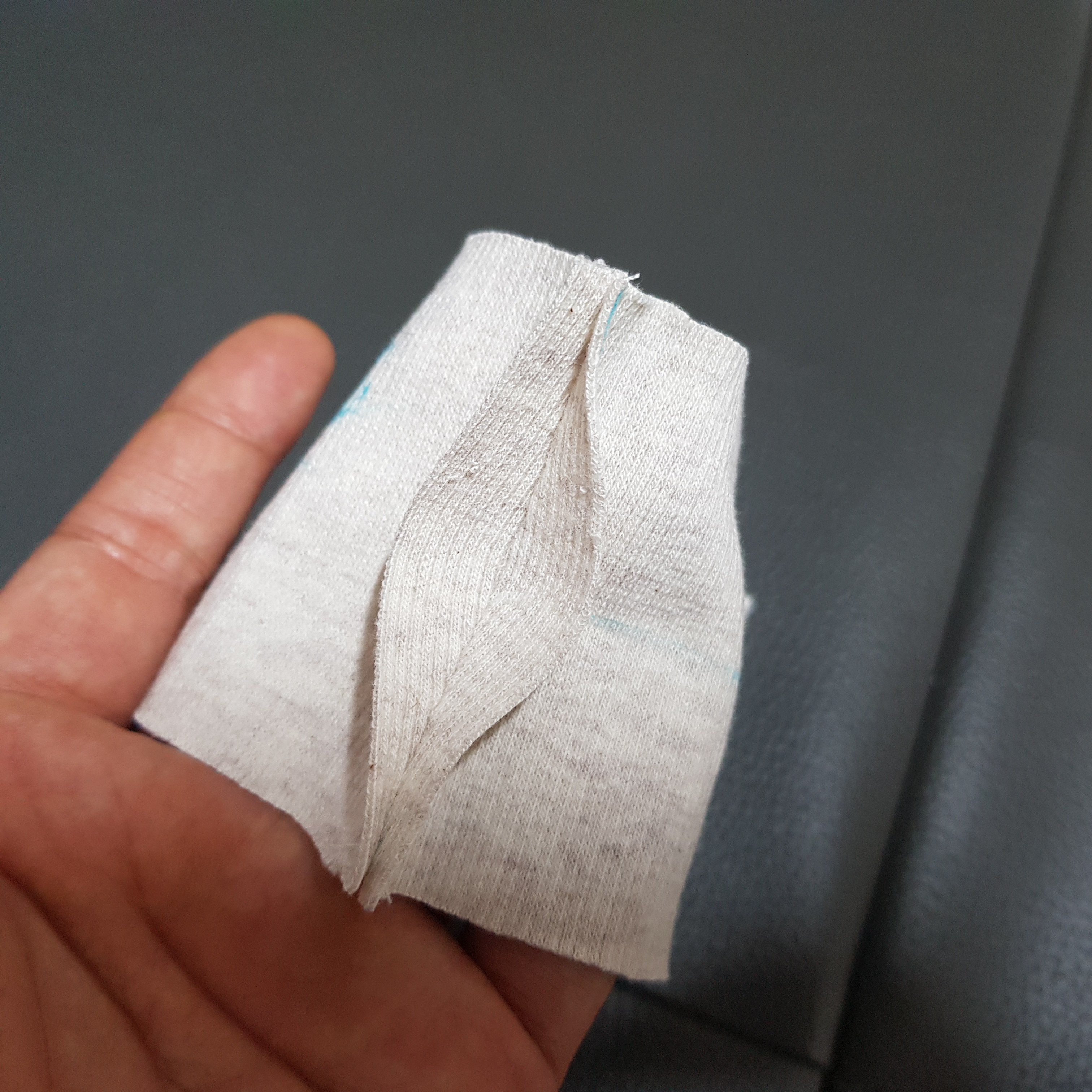 사선 절단 안 하면 가정용 재봉틀은 힘들어한다. 원단이 흔들리면서 삐뚤빼뚤 박아져서 결국 목시보리 폭이 들쑥날쑥 해 진다. 아래 사진과 같이 사선 절단하는게 재봉하기 편하다.