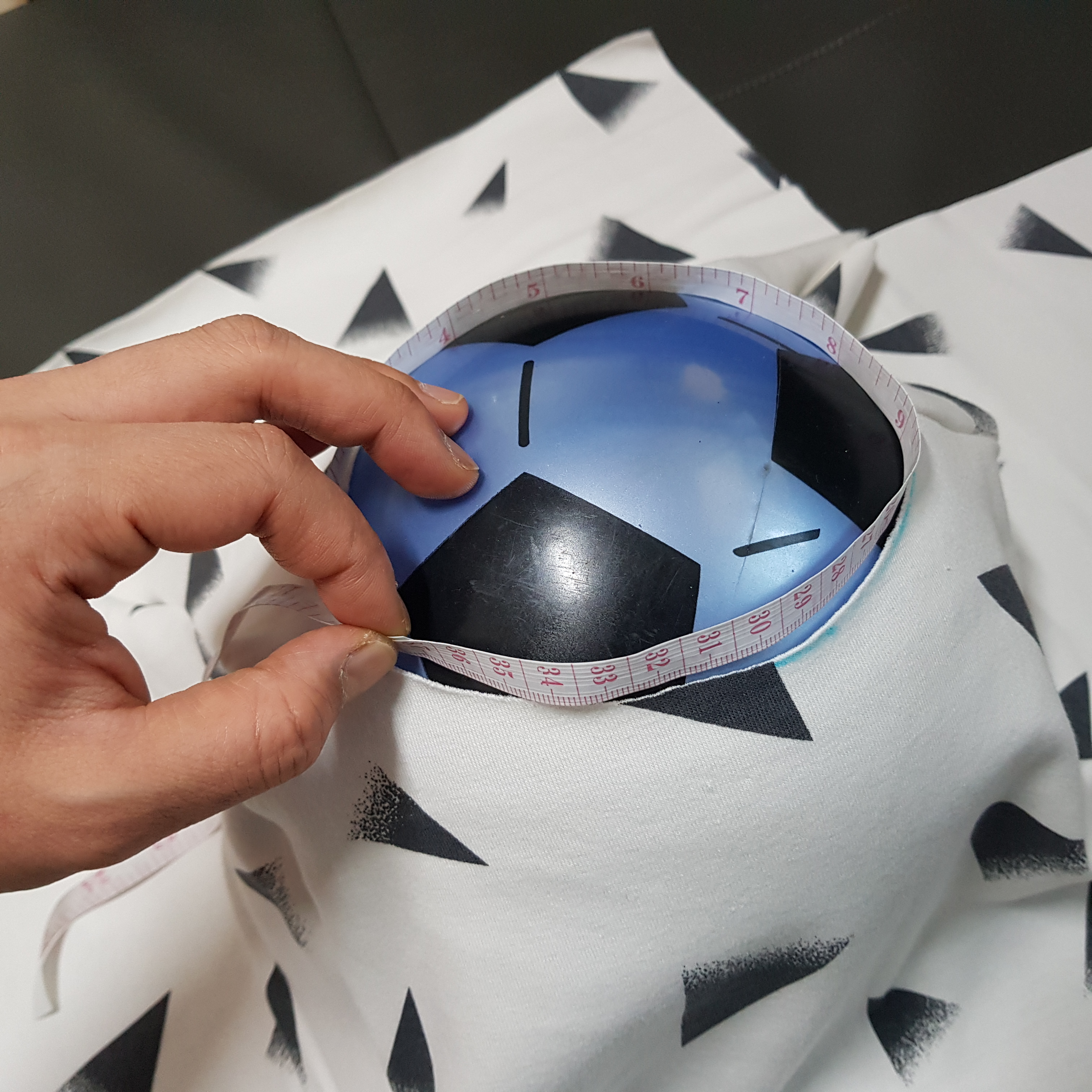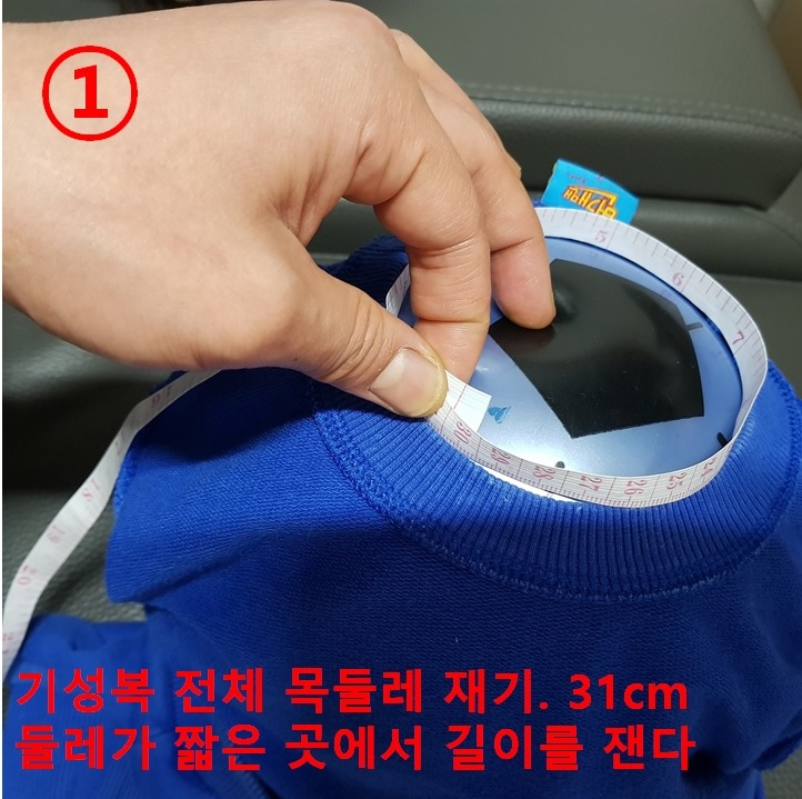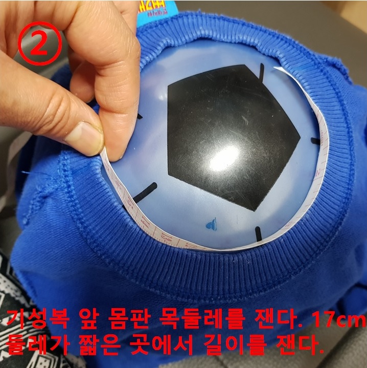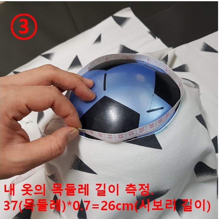 집에 굴러다니는 아들의 고무공을 이용하면 목둘레 길이 재기가 쉽다. 아래 사진과 같이 고무공을 옷 속으로 쏙 넣으면 줄자로 쉽게 목둘레를 측정할 수 있다.