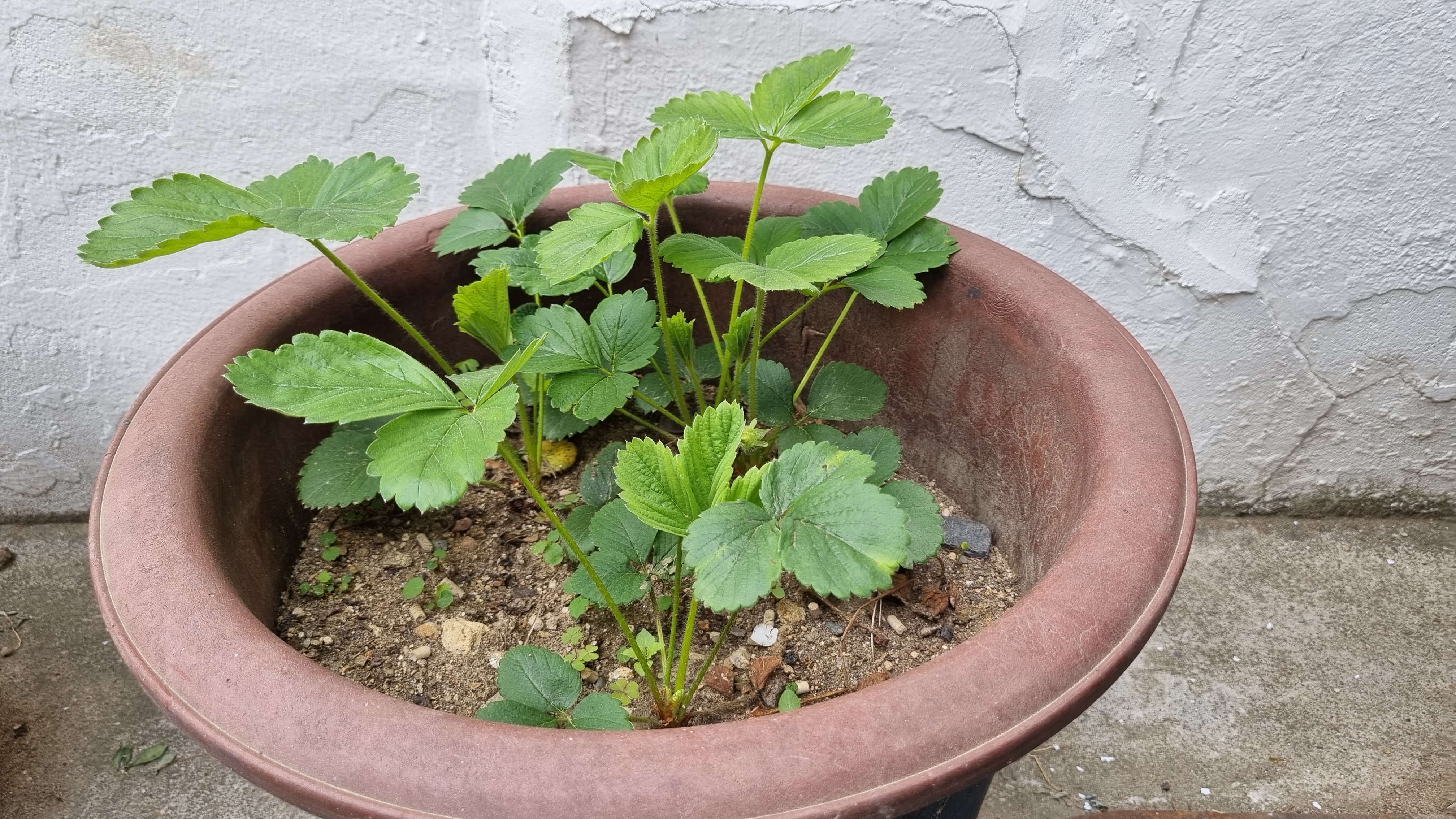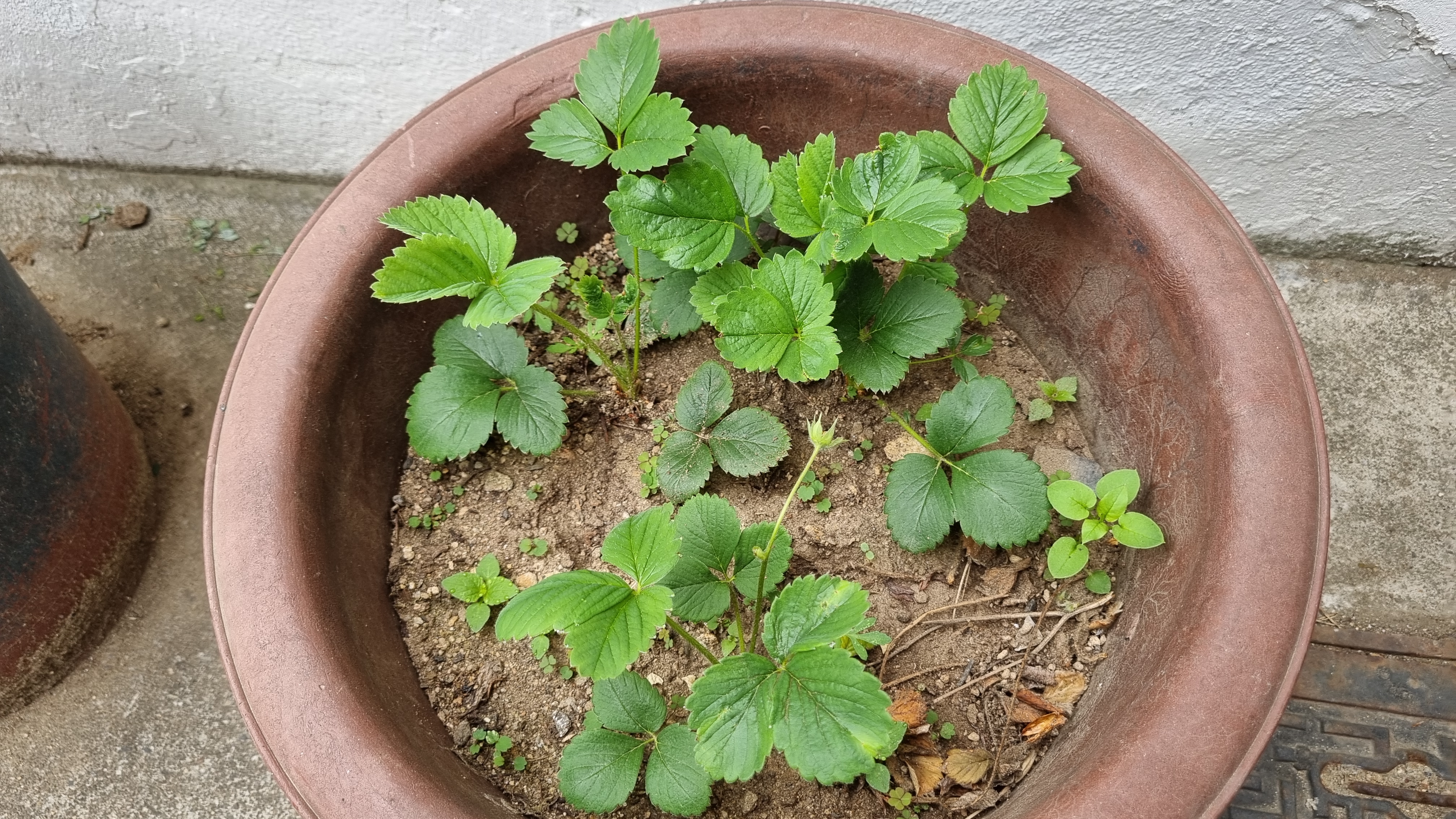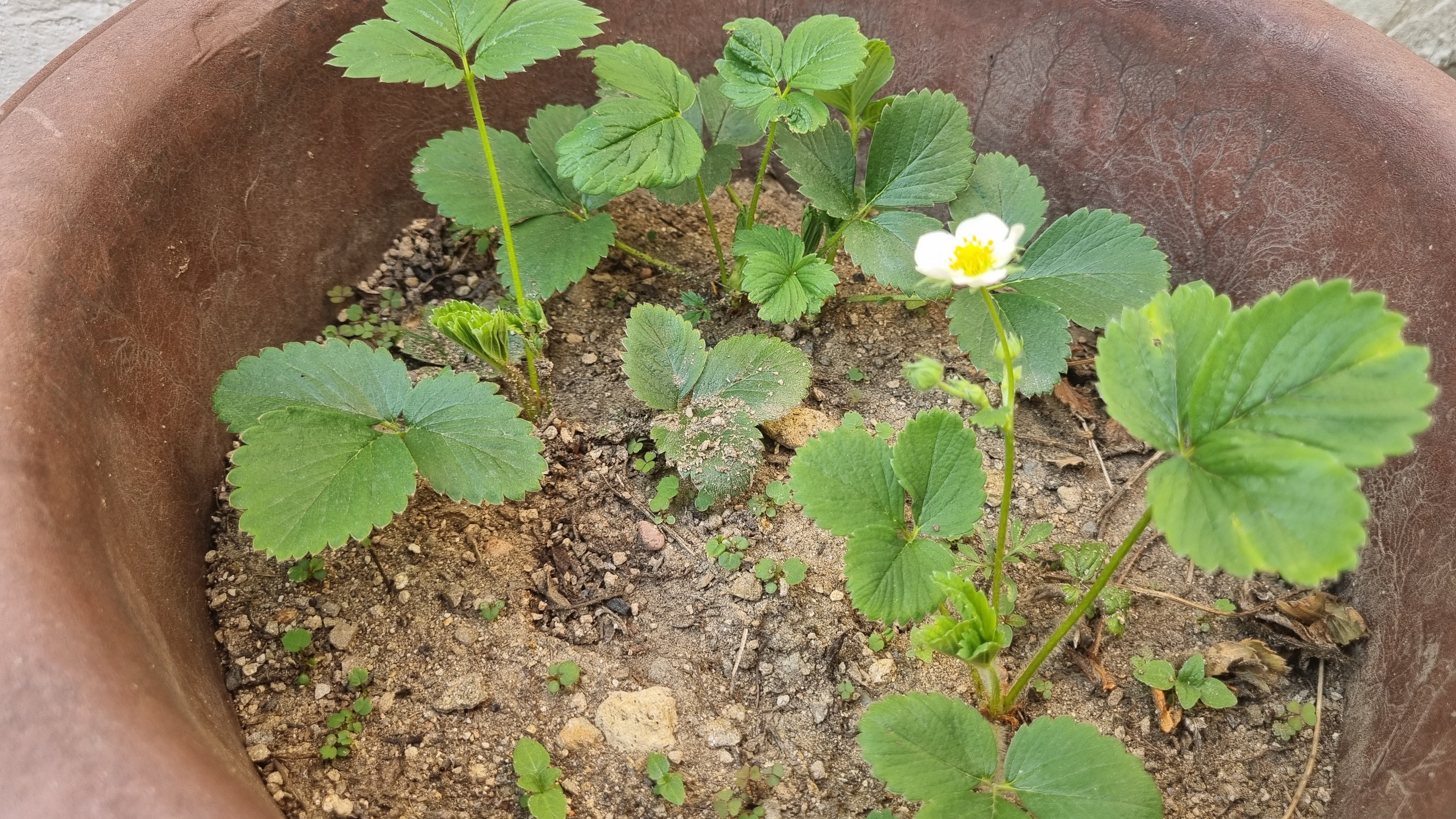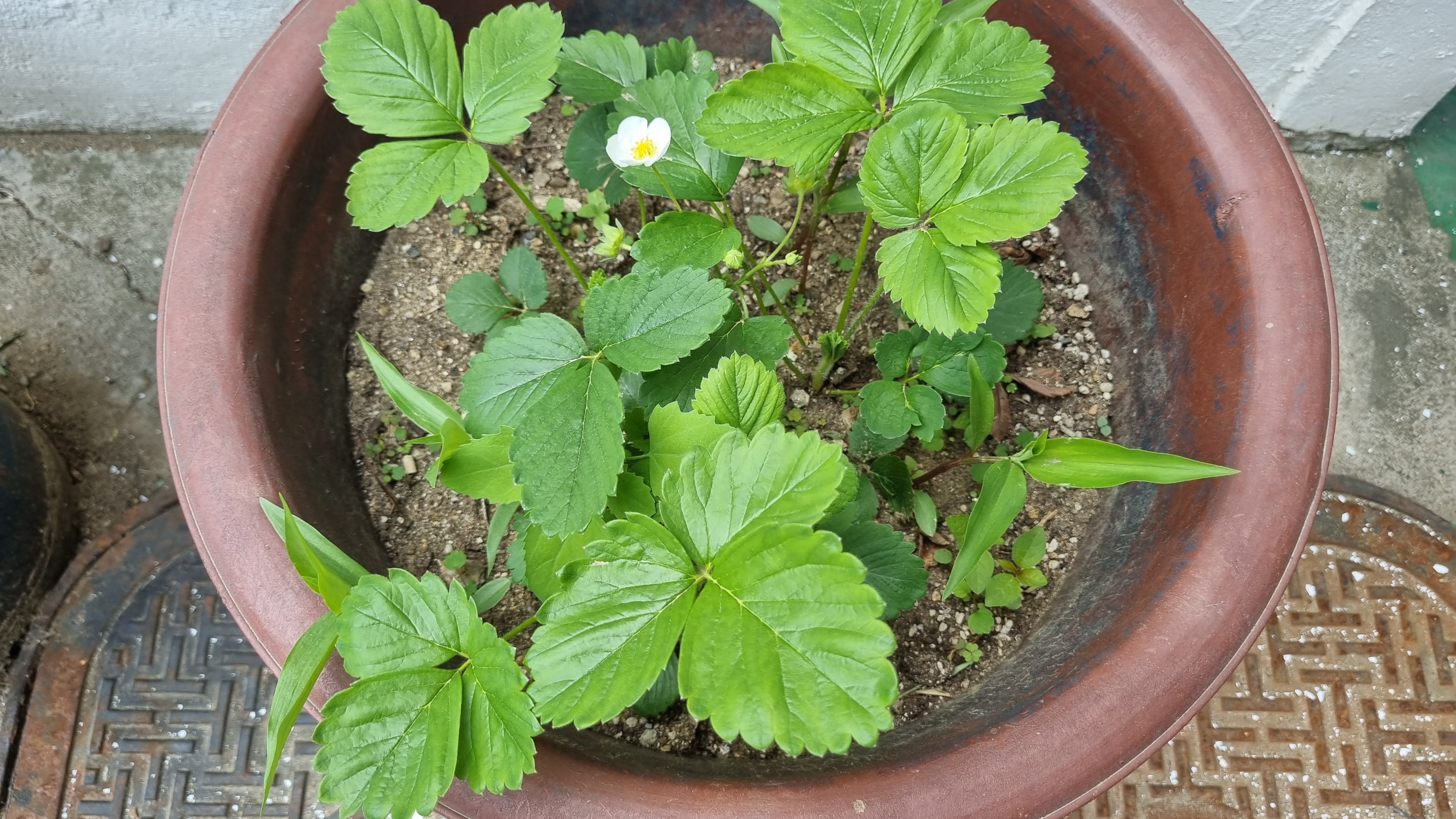 노지에서 화분에 있는 딸기들은 꽃이 피고 지기를 반복하면서 벌써 아주 작게 딸기가 생기기 시작했다.