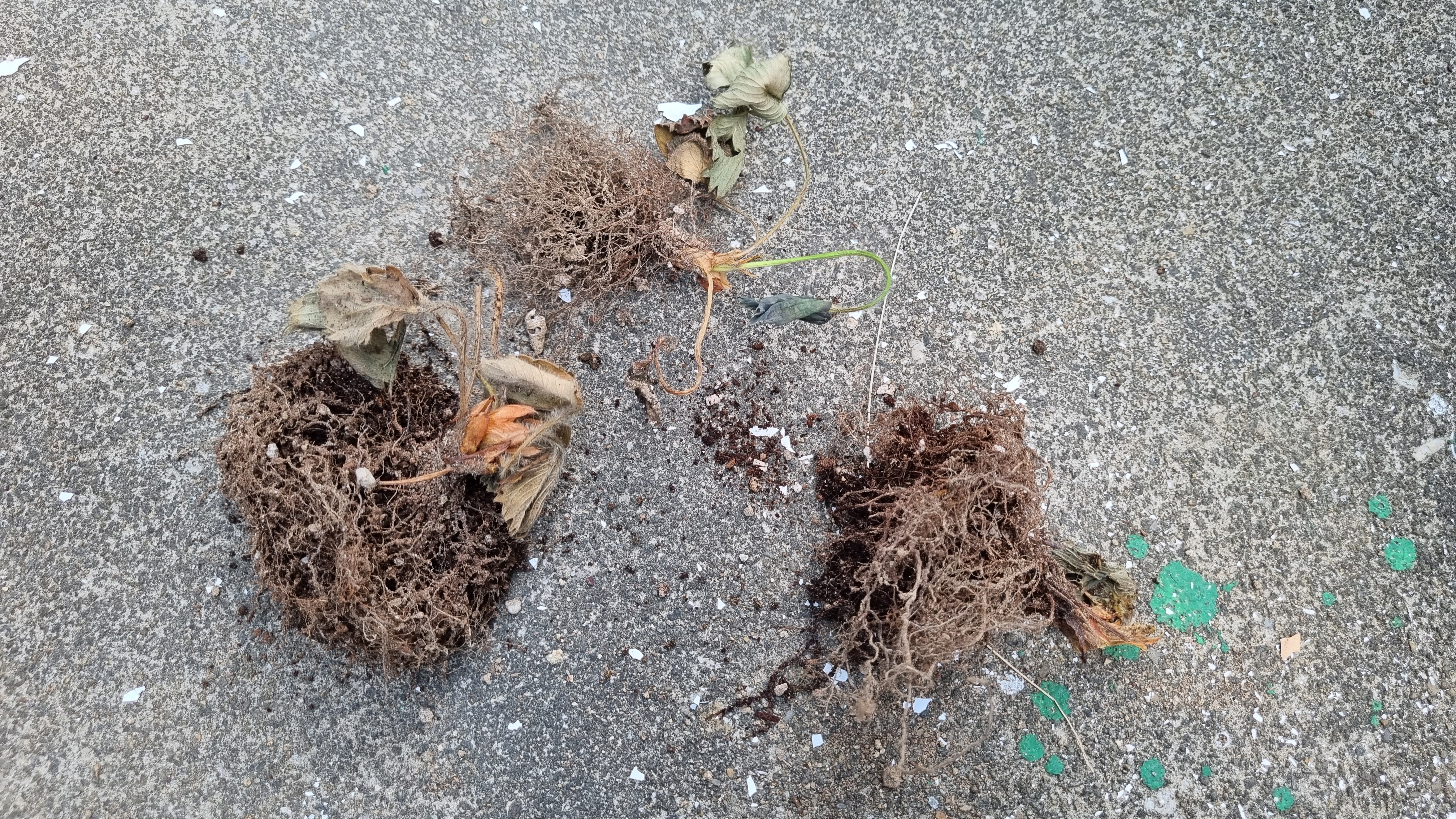 고양이 때문에 잠시 작은 화분에 옮겨둔 딸기들은 죽어 간다. 물을 많이 줘야 되는데...
