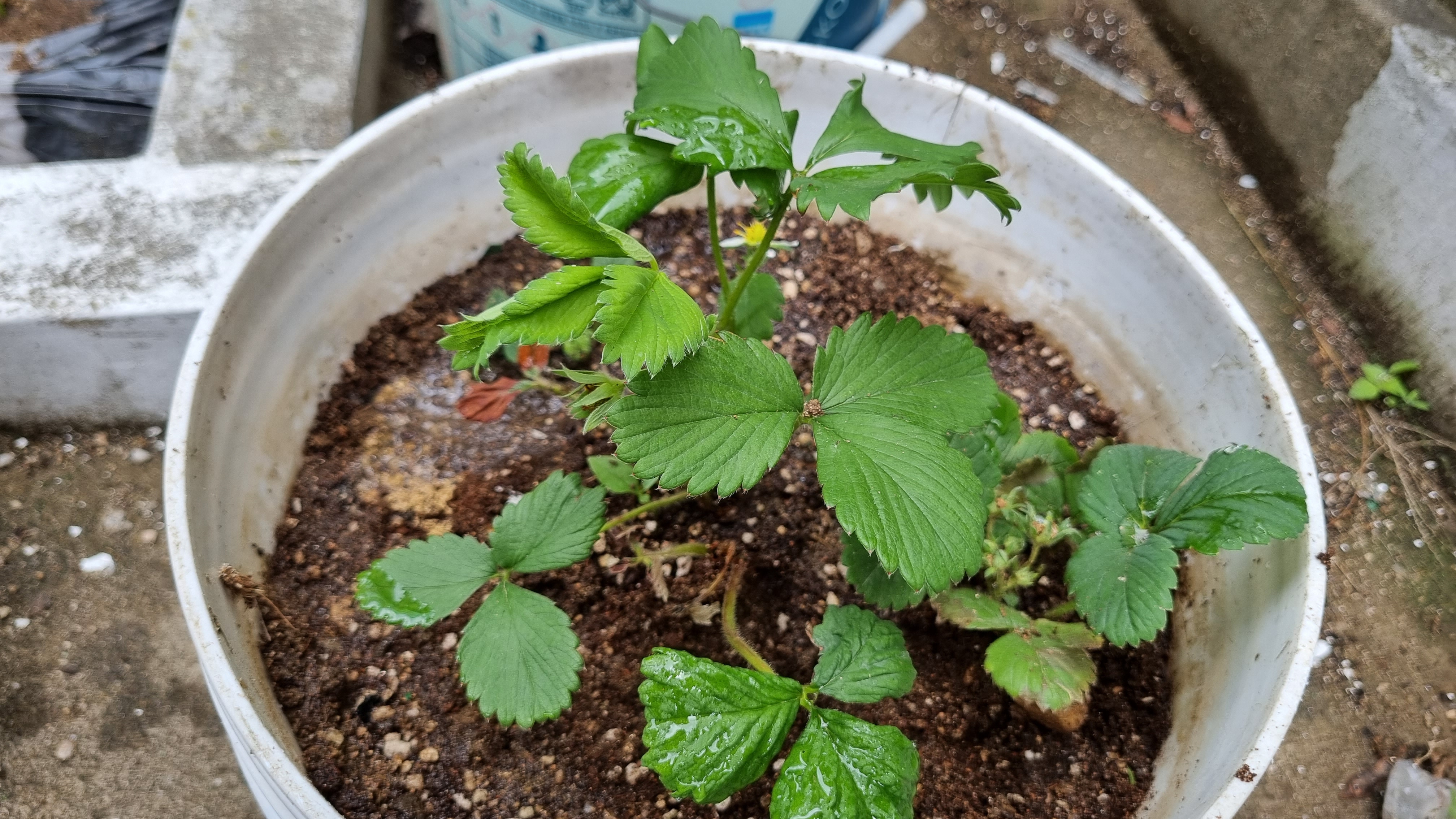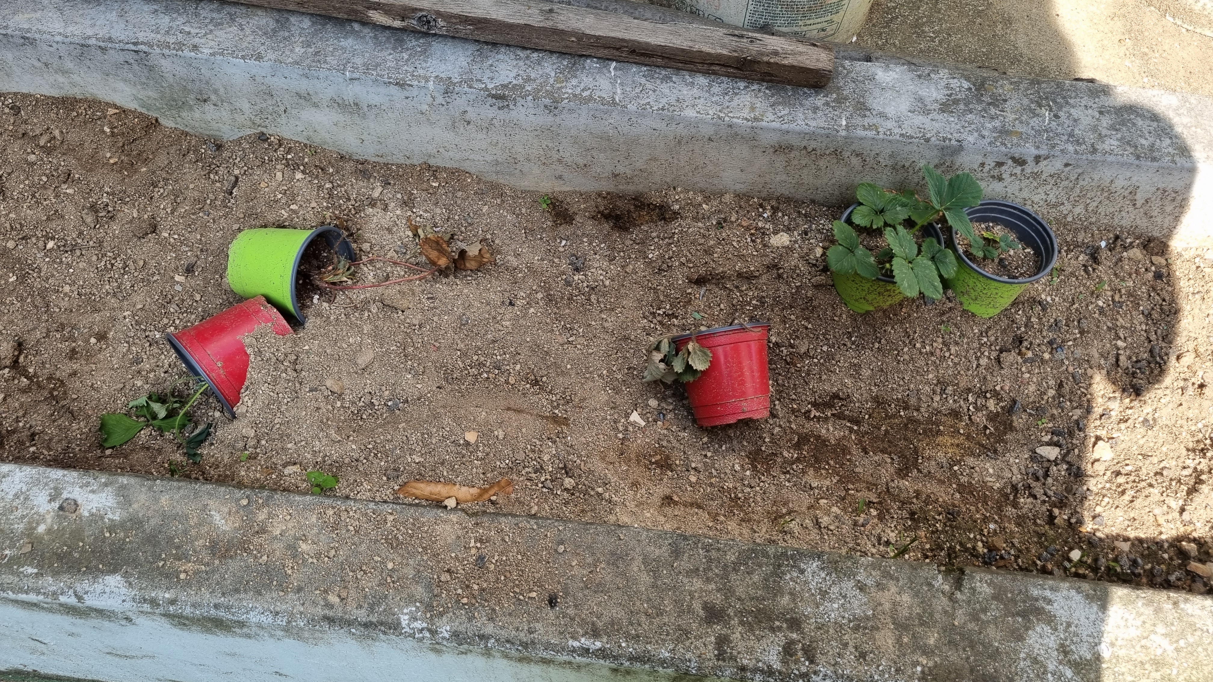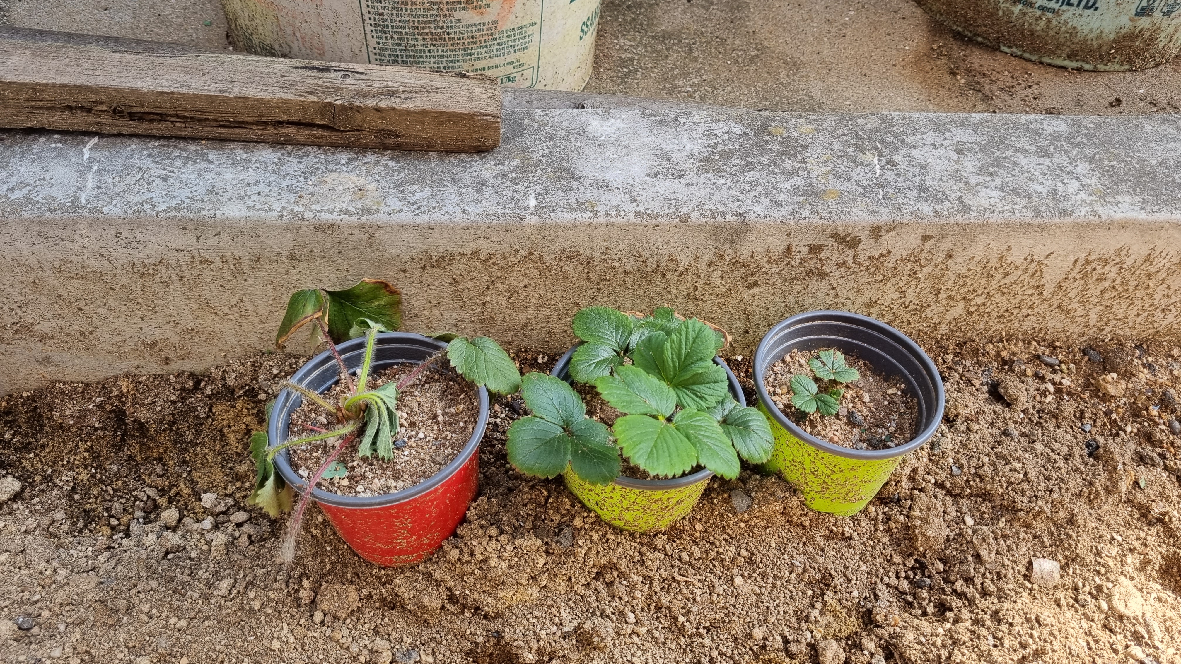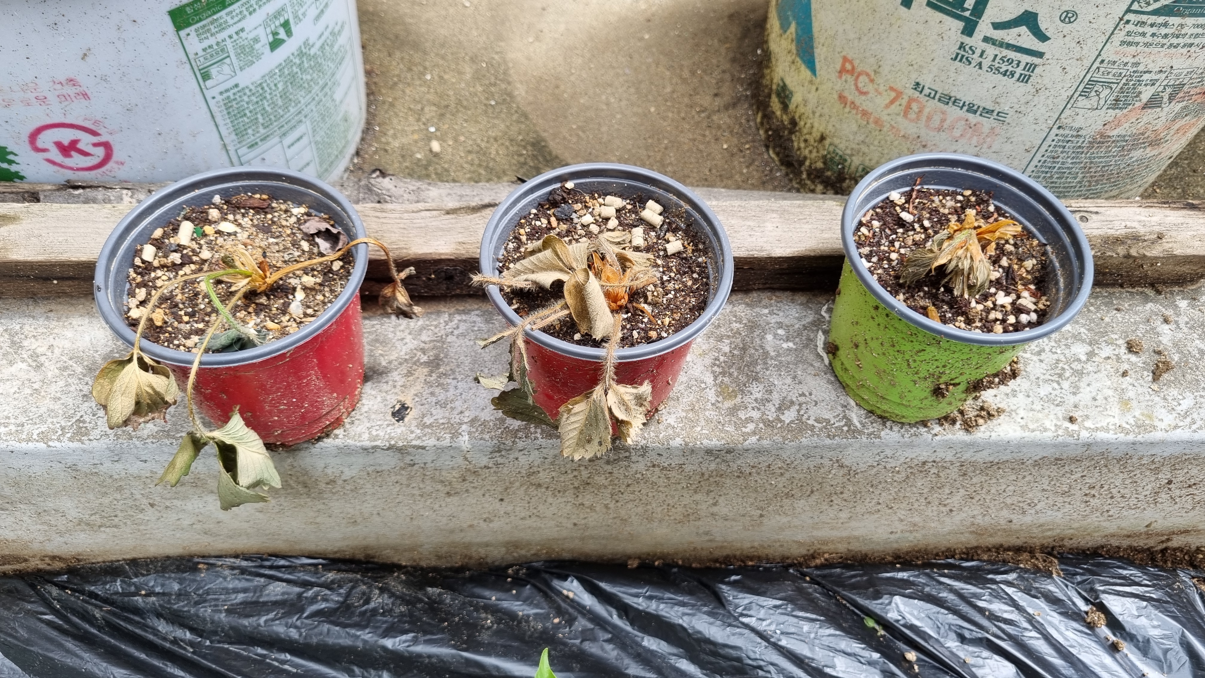 일반 딸기를 옮겨둔 3개의 화분이 처참하다.