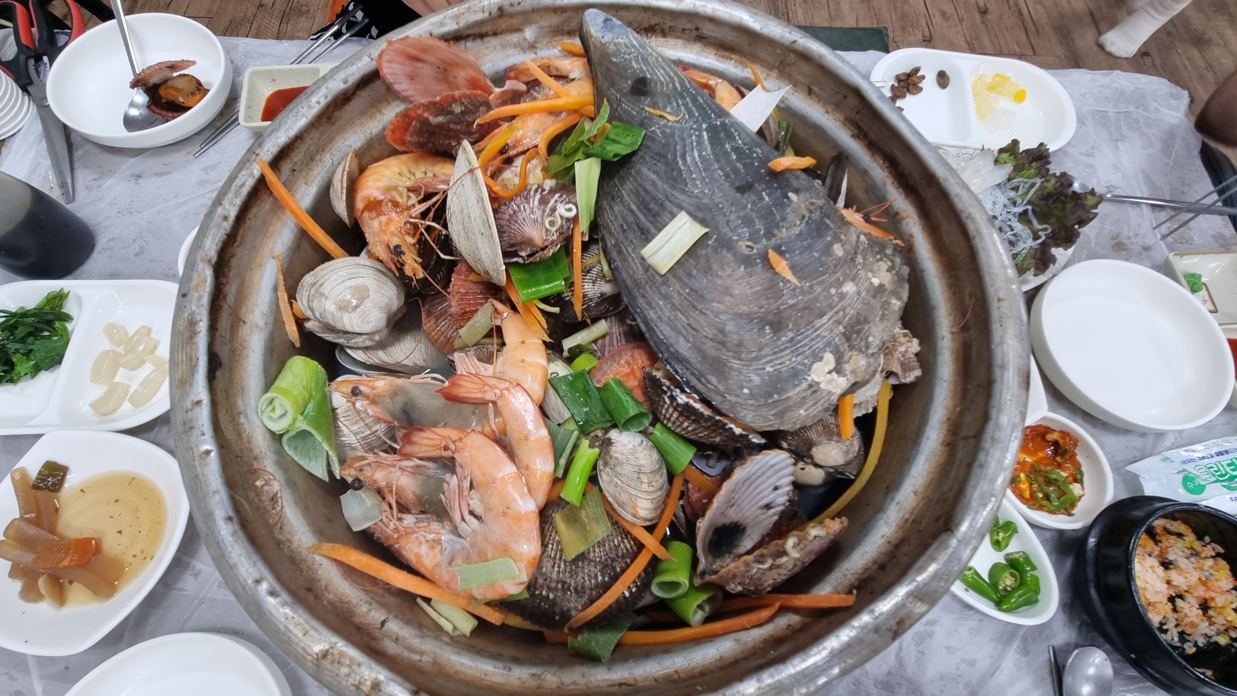 양푼의 조개찜. 대하는 냉동이지만 살이 퍽퍽하지 않고 맛이 꽤 좋았다. 제철도 아니고 기대를 하지 않아서 그런지 생각보다 매우 맛있었고 아이들도 새우를 잘 먹었다. 그리고 가리비는 작은 것보다 큰 게 훨씬 맛이 좋다. 조개들이 거의 대부분은 싱싱하고 달달하고 맛있었다.  하지만 우리는 조개를 리필하지 못했다. 이미 처음부터 제공된 조개의 양이 충분히 많았다.