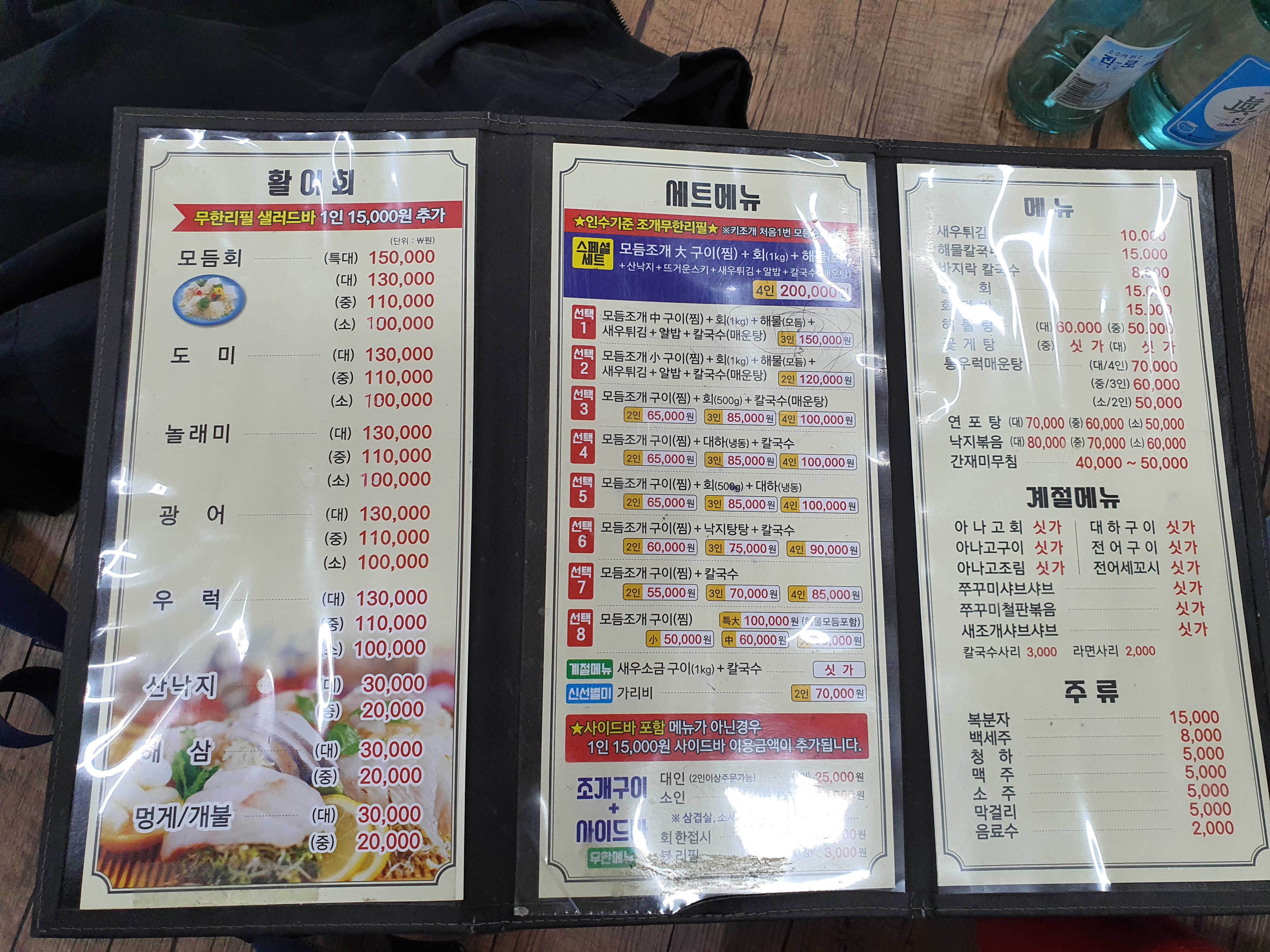 아이들에게 핸드폰을 쥐어 주고 주문을 시작해 본다. 조개구이 무한리필은 1인 25,000원이다. 무한리필을 주문하면 조개구이가 무한리필이며, 회 한 접시와 사이드바가 제공된다. 사이드바에는 소시지, 삼겹살 기타 등등이 있다. 하지만 우리는 무한리필의 필요성을 느끼지 못했다. 그래서 선택 5를 3인 주문했다. 85,000원. 하지만 우리가 주문한 메뉴에도 조개구이는 무한리필된다고 하셨다. 물론 사이드바는 이용할 수 없다.