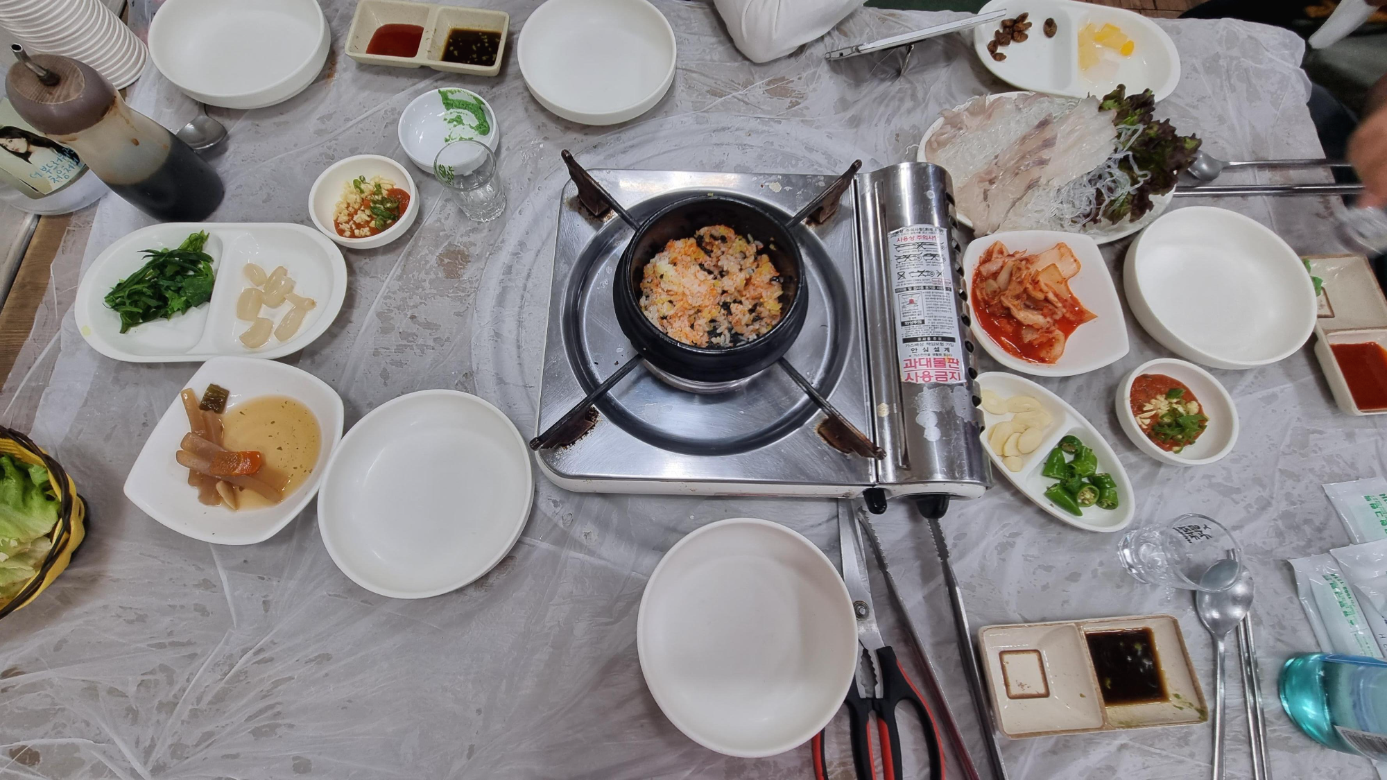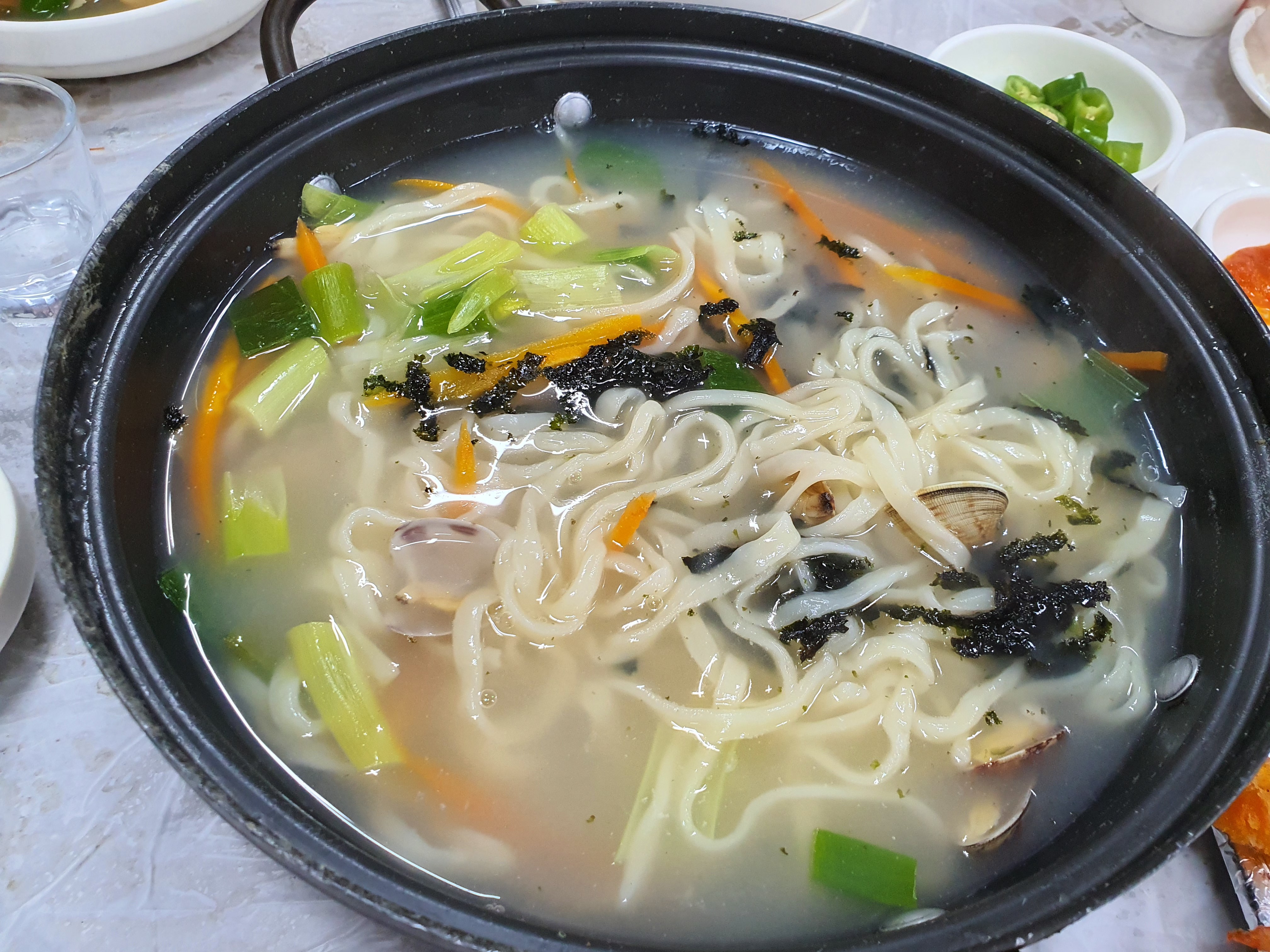 양푼의 조개찜. 대하는 냉동이지만 살이 퍽퍽하지 않고 맛이 꽤 좋았다. 제철도 아니고 기대를 하지 않아서 그런지 생각보다 매우 맛있었고 아이들도 새우를 잘 먹었다. 그리고 가리비는 작은 것보다 큰 게 훨씬 맛이 좋다. 조개들이 거의 대부분은 싱싱하고 달달하고 맛있었다. 하지만 우리는 조개를 리필하지 못했다. 이미 처음부터 제공된 조개의 양이 충분히 많았다.