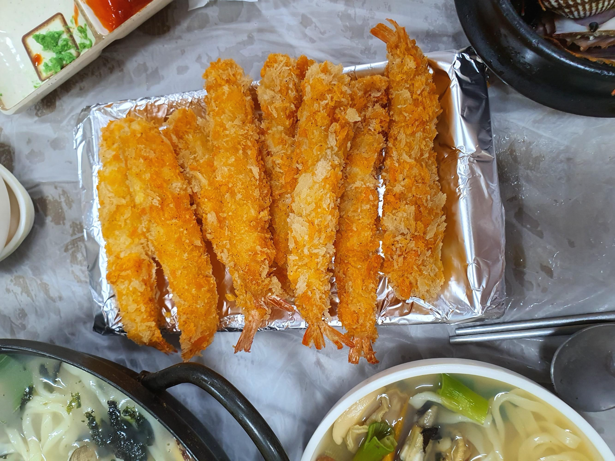 조개찜과 회를 술과 함께 먹었다. 적당히 먹고 배도 부르지만 아직 탄수화물이 들어가지 않아서 그런지 뭔가 살짝 아쉬움이 남는다. 그래서 새우튀김을 시켰다. 8마리 만원. 새우튀김을 주시면서 사장님이 "뜨거워요 조심하세요"라고 말씀하신다. 처음부터 끝까지 사장님은 친절하시다. 맛도 물론 좋다. 방금 튀겨서 나온 새우튀김이라 고소하고 맛있었다. 튀김옷이 그리 두껍지도 않고 새우맛이 잘 느껴졌다.
