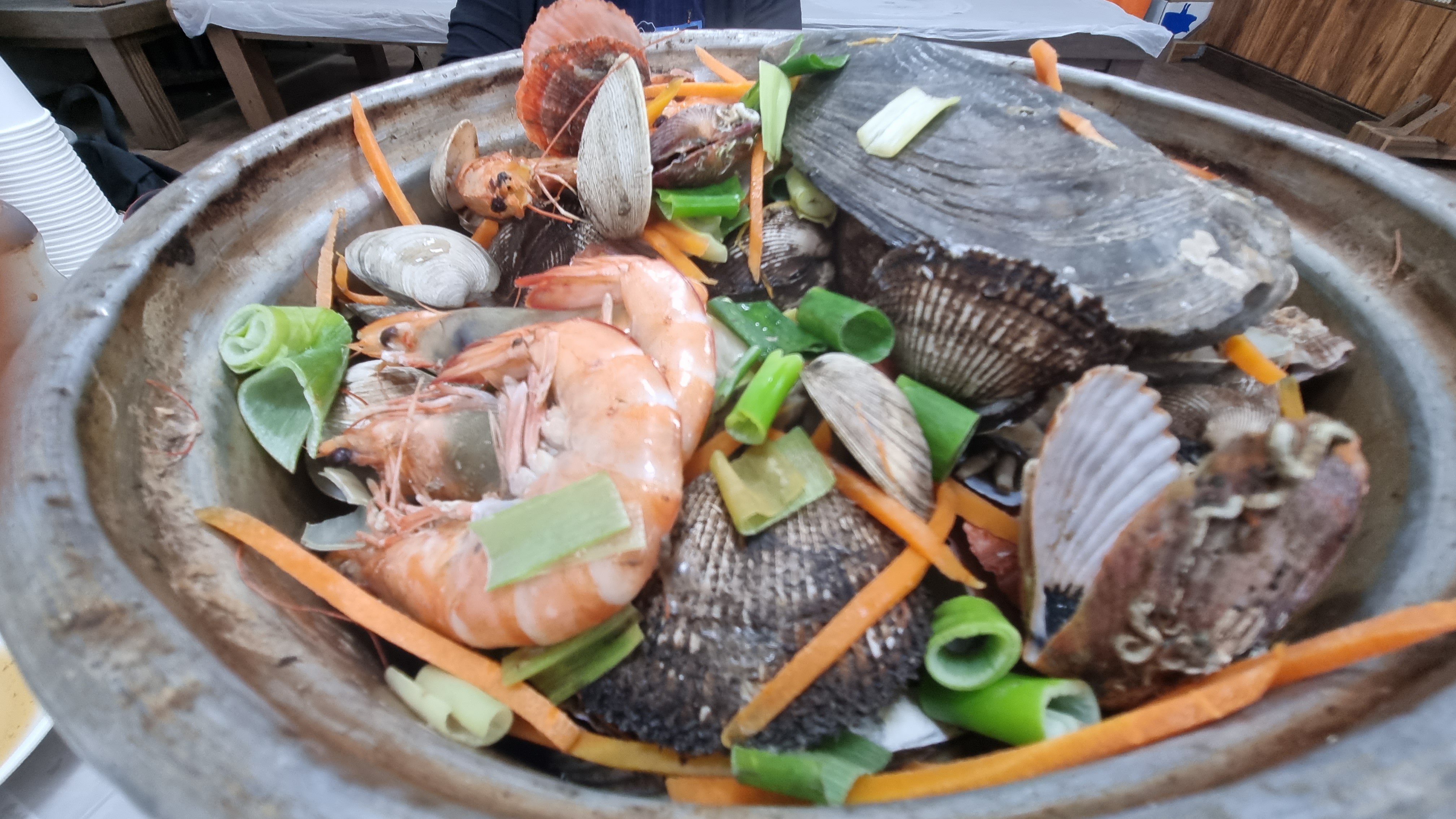 양푼의 조개찜. 대하는 냉동이지만 살이 퍽퍽하지 않고 맛이 꽤 좋았다. 제철도 아니고 기대를 하지 않아서 그런지 생각보다 매우 맛있었고 아이들도 새우를 잘 먹었다. 그리고 가리비는 작은 것보다 큰 게 훨씬 맛이 좋다. 조개들이 거의 대부분은 싱싱하고 달달하고 맛있었다. 하지만 우리는 조개를 리필하지 못했다. 이미 처음부터 제공된 조개의 양이 충분히 많았다.