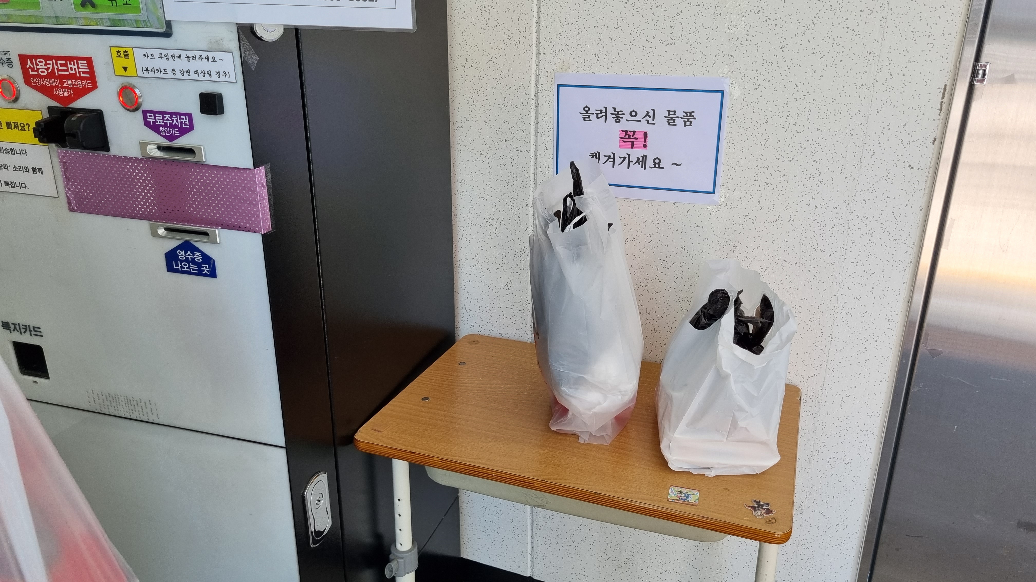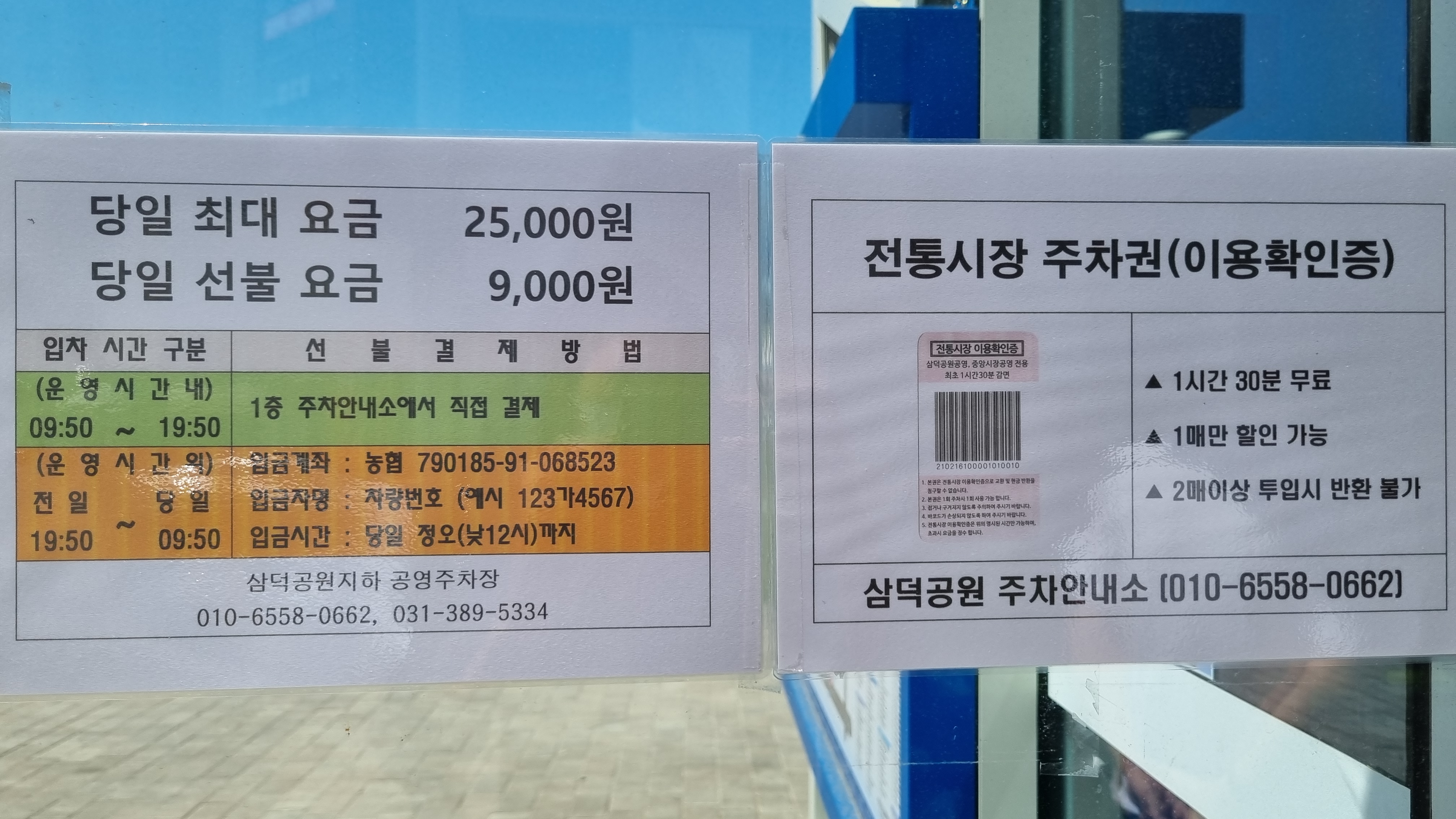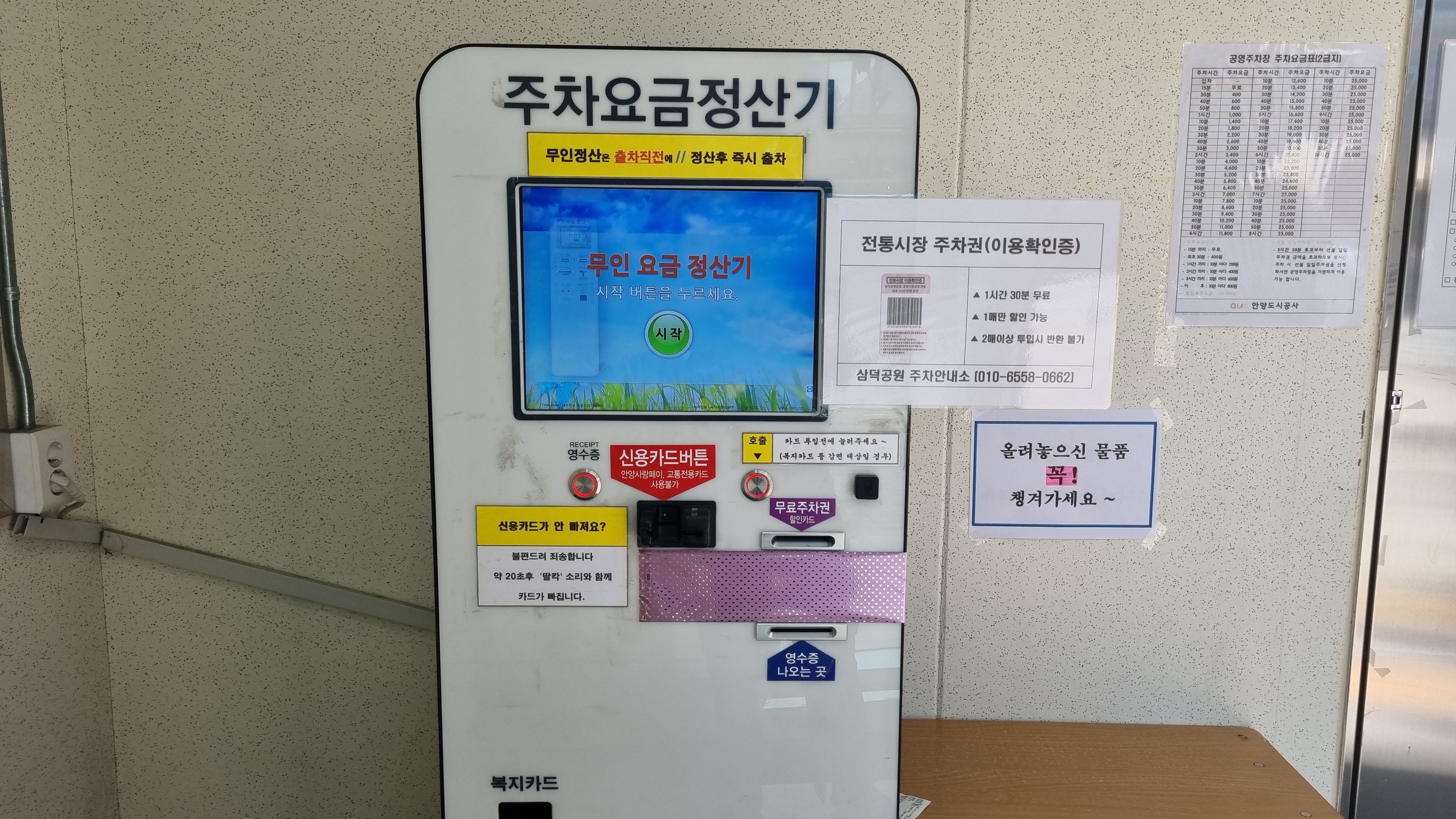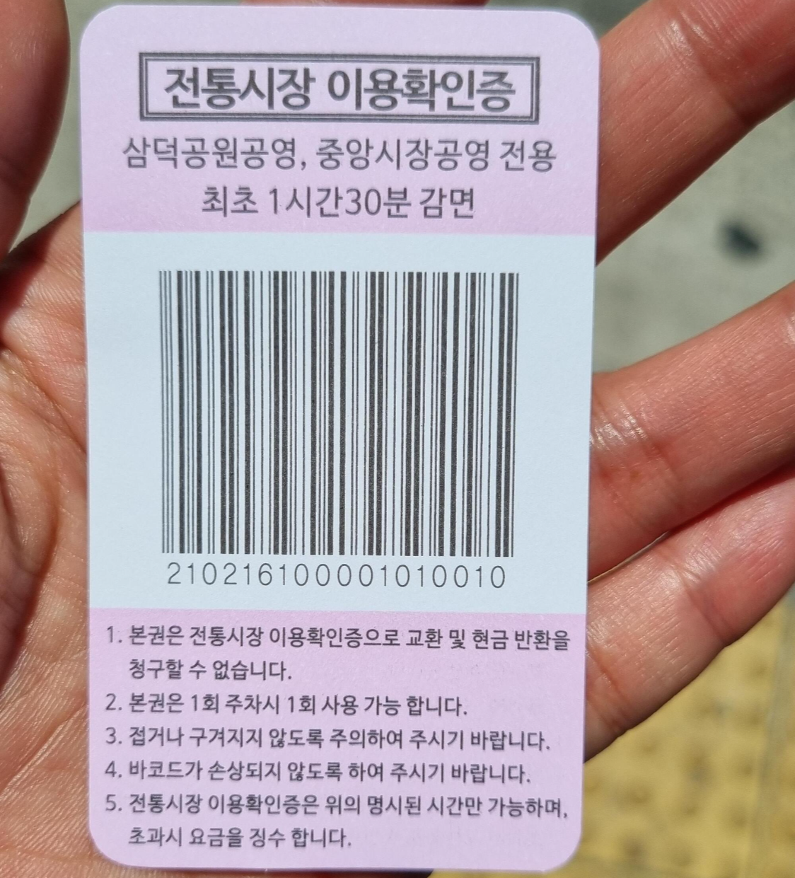 시장에서 문건을 사고 주차권을 받는다. 주차권이 있으면 최초 1시간 30분을 감면받을 수 있다. 즉, 2,200원을 할인해 준다. 내가 주차한 시간은 1시간 57분. 원래는 3,400원이지만 주차권으로 2,200원을 할인받아 주차요금 1,200원을 지불했다.