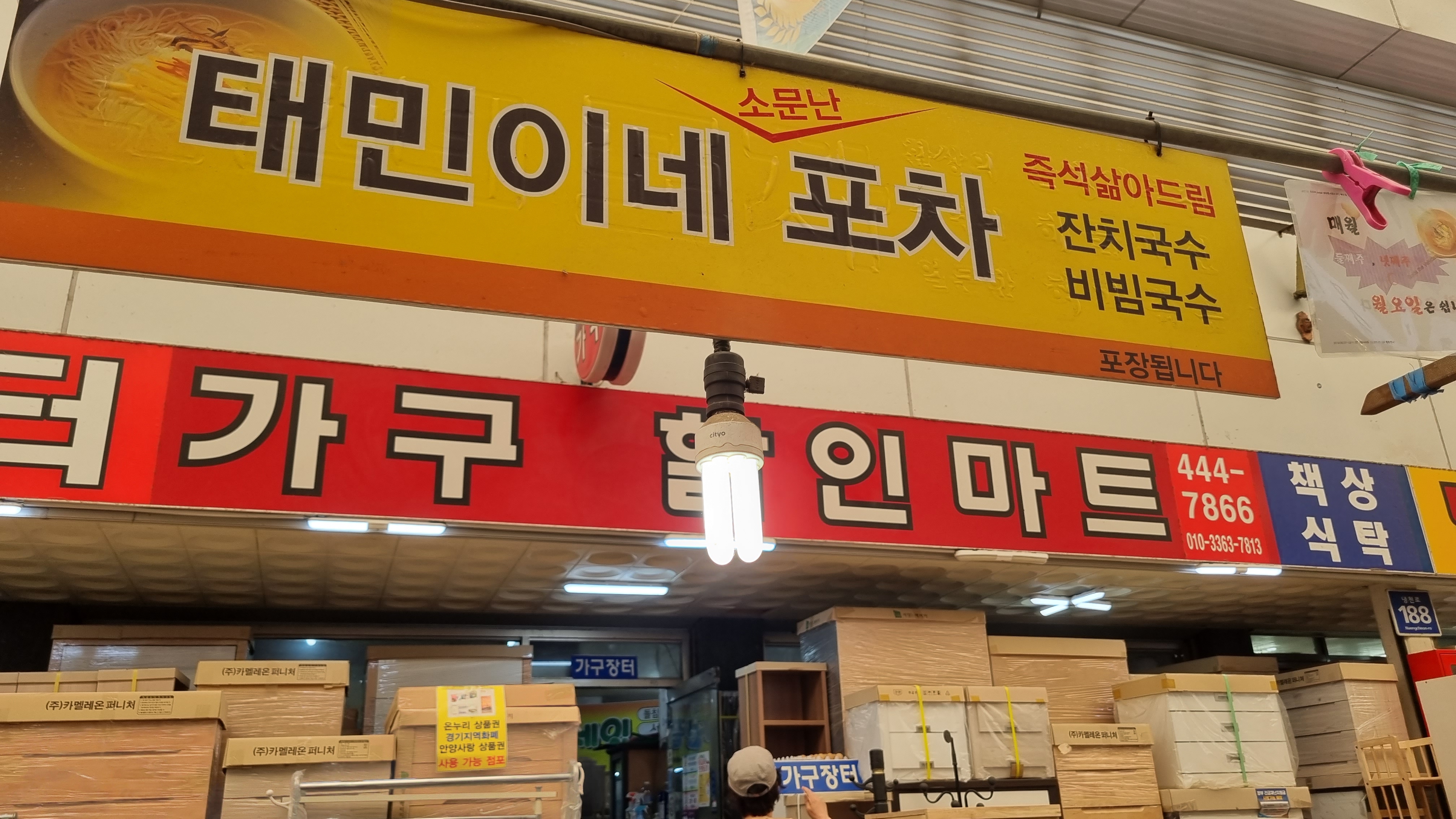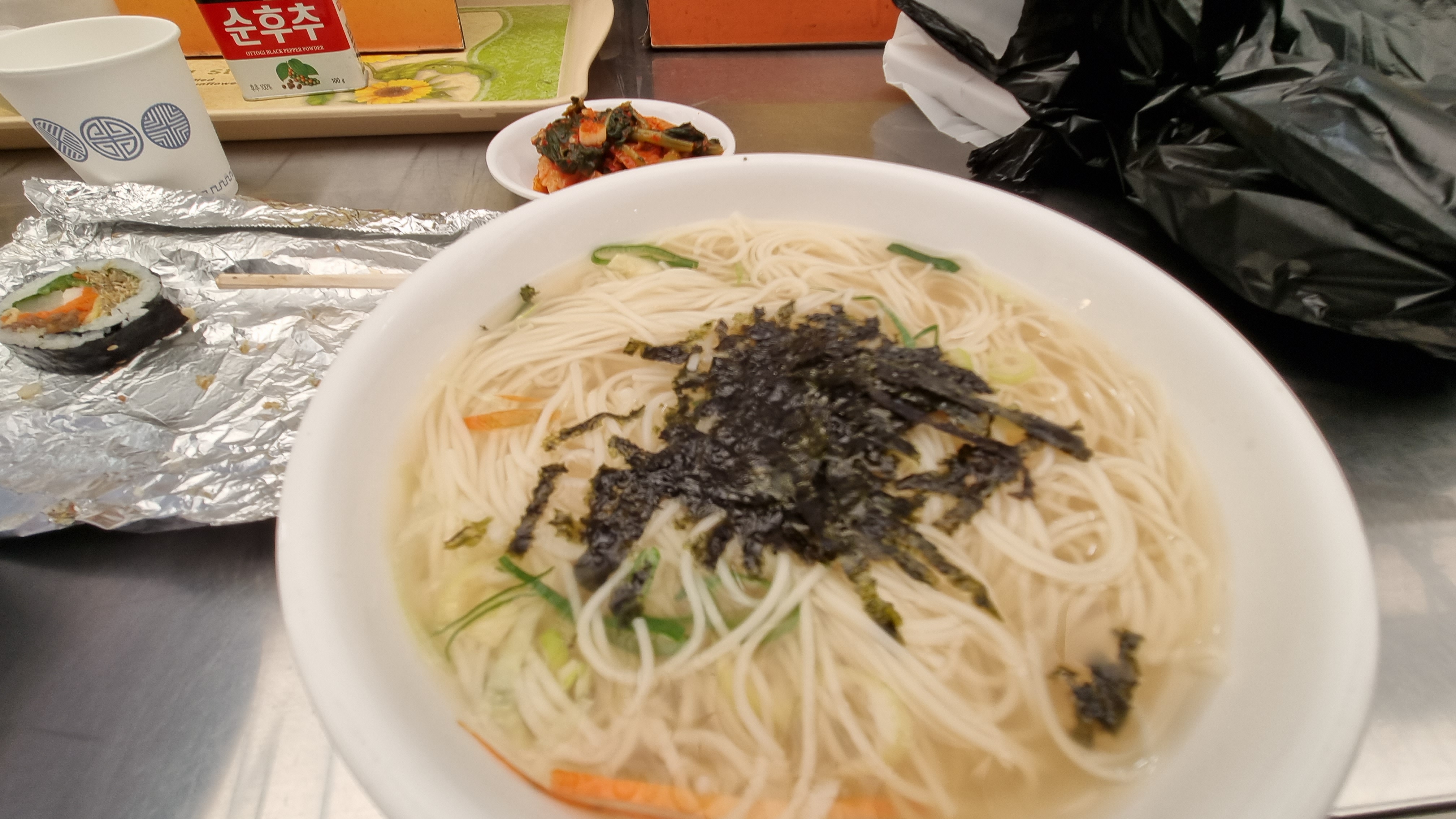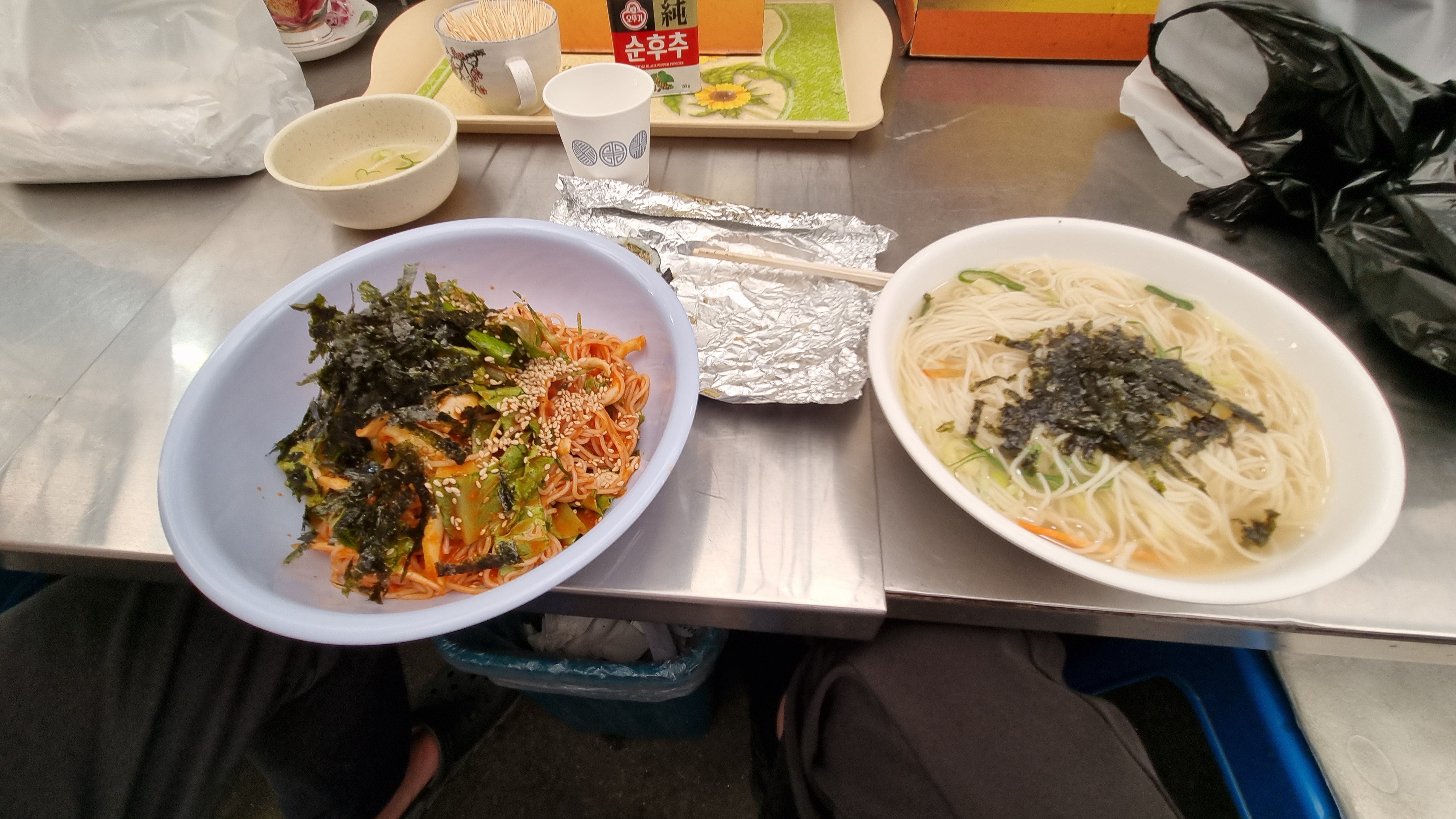 원래 분식을 먹으려고 했으나 분식집이 문을 열지 않았다. 단체로 쉬는 날인가... 배고파서 그냥 노상에 위치한 태민이네 포차에 앉았다. 역시 시장은 잔치국수지!! 잔치국수와 비빔국수를 하나씩 시켰다. 배고프다. 신례인 거 알지만 김밥을 한 줄 꺼내어 먹었다. 그러나 사장님이 국물과 같이 먹으라며 국물 먼저 주셨다. "감사합니다."