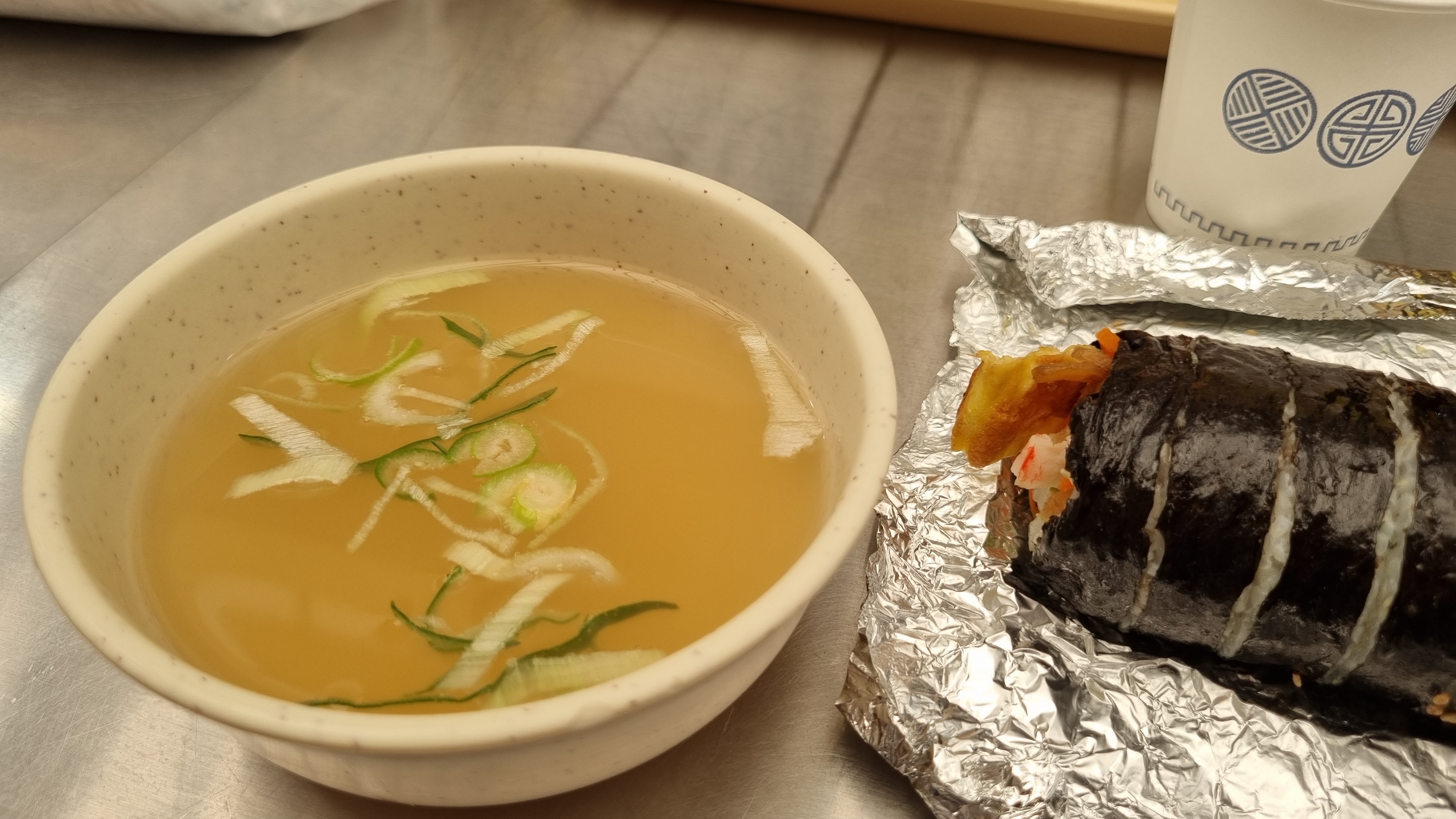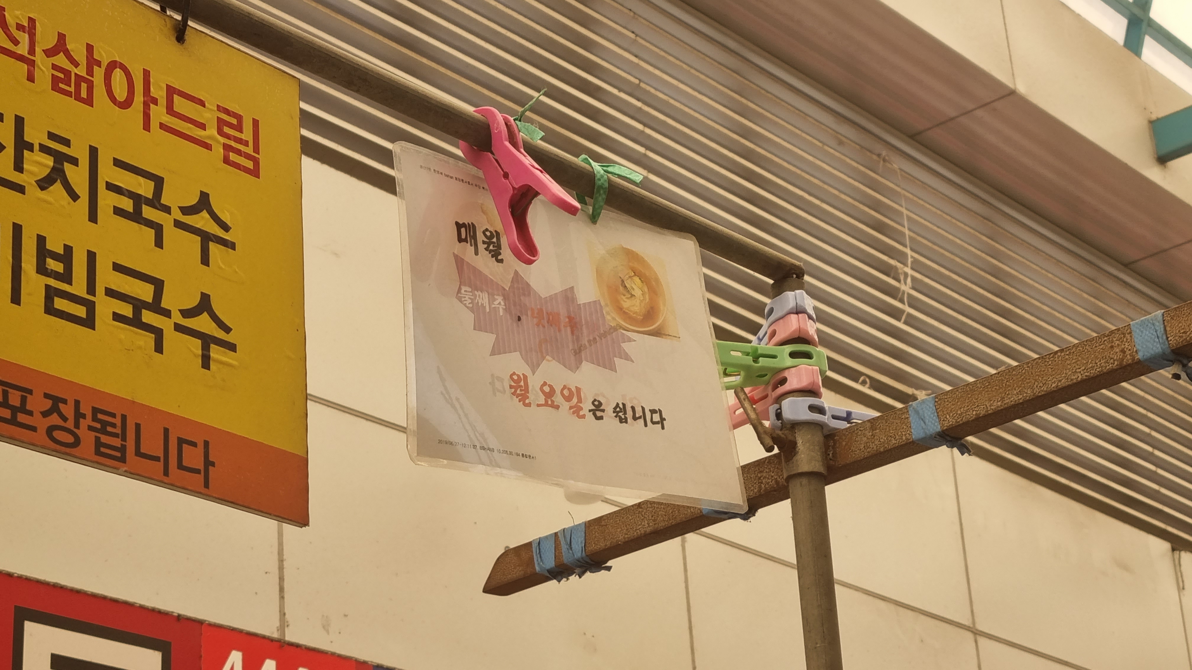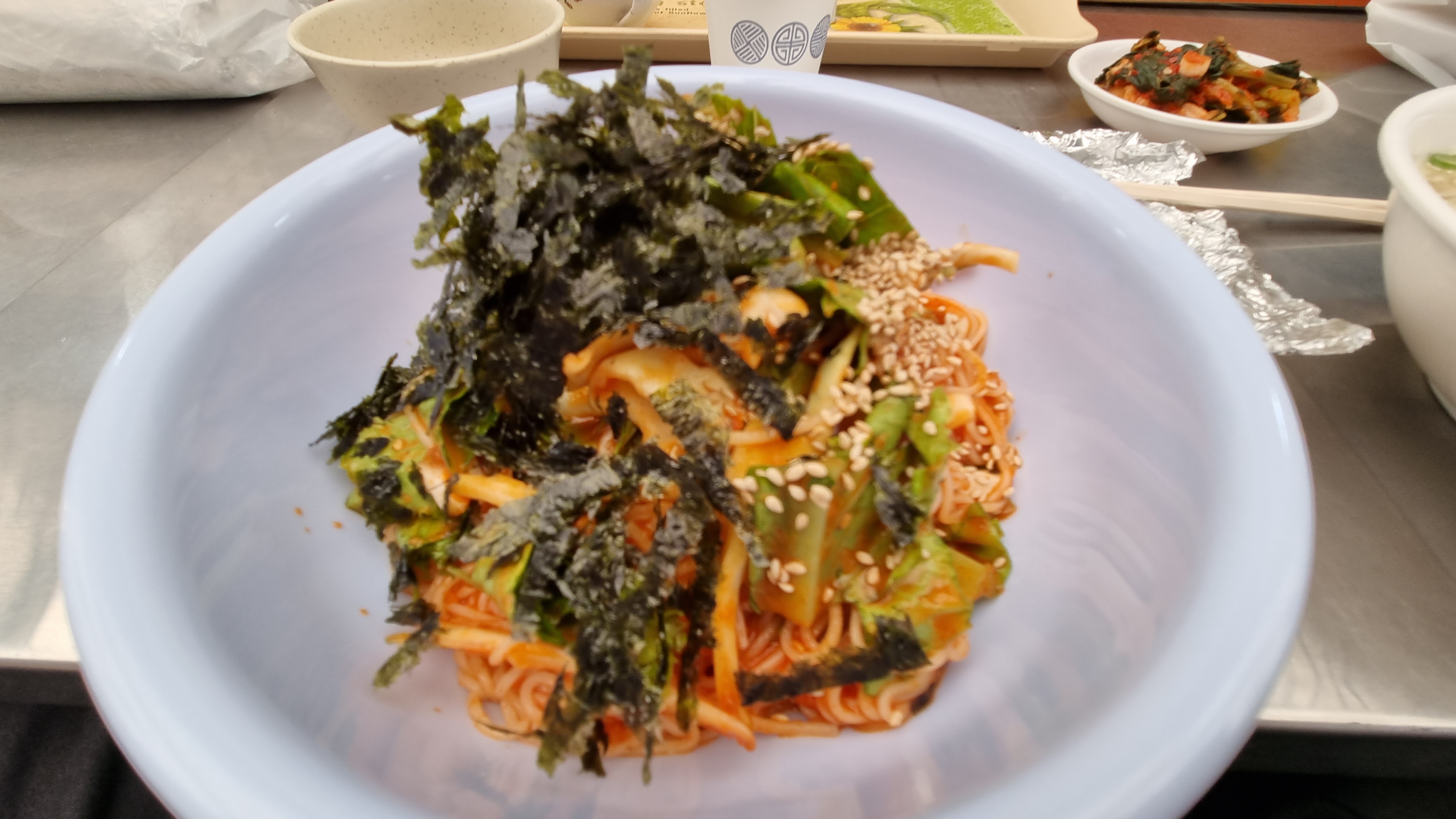 원래 분식을 먹으려고 했으나 분식집이 문을 열지 않았다. 단체로 쉬는 날인가... 배고파서 그냥 노상에 위치한 태민이네 포차에 앉았다. 역시 시장은 잔치국수지!! 잔치국수와 비빔국수를 하나씩 시켰다. 배고프다. 신례인 거 알지만 김밥을 한 줄 꺼내어 먹었다. 그러나 사장님이 국물과 같이 먹으라며 국물 먼저 주셨다. "감사합니다."