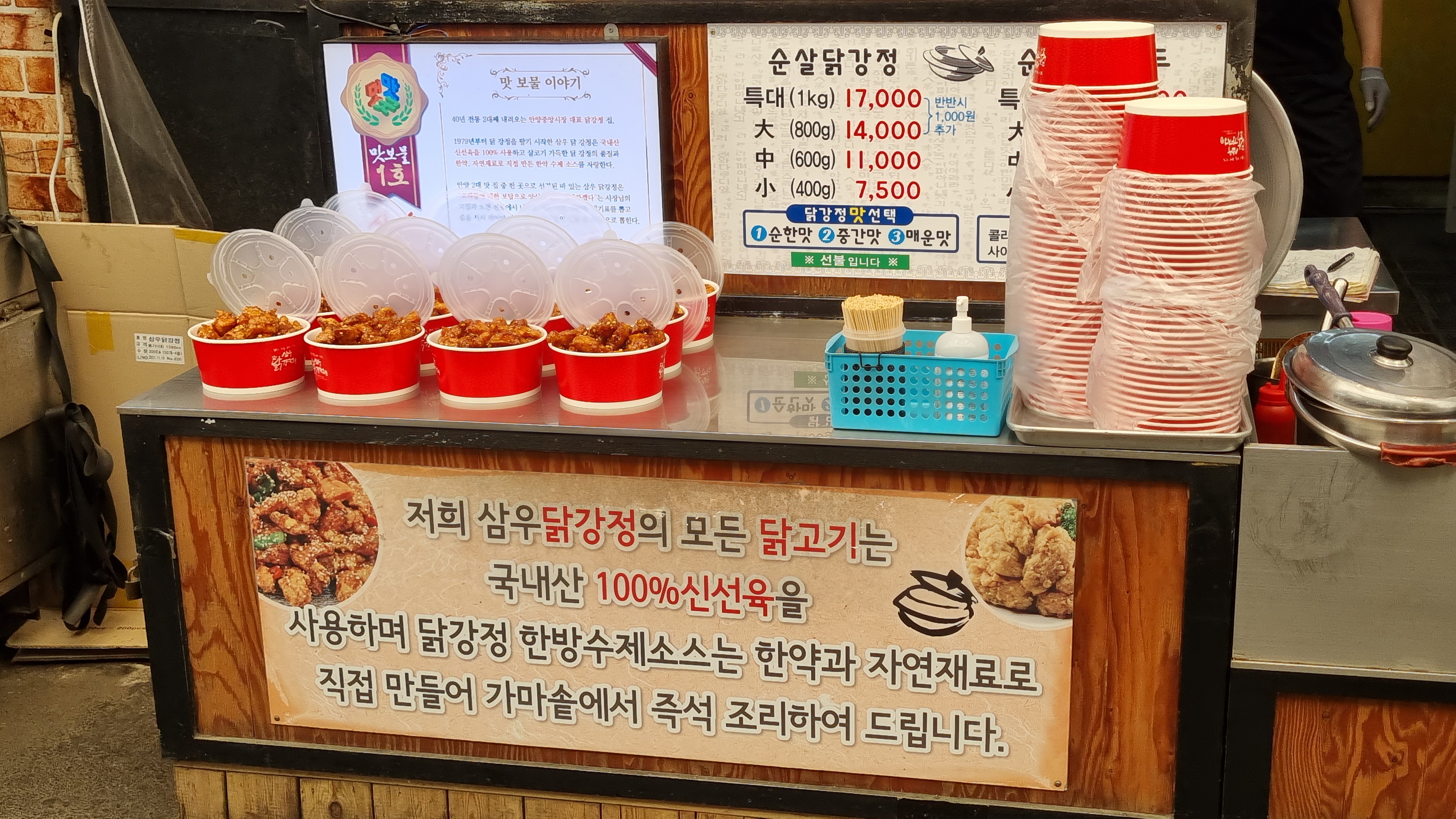 주문을 하고 뒤편에 있는 의자에 앉아서 닭강정을 먹을 수 있다. 딱 하나만 먹고 가야지!!