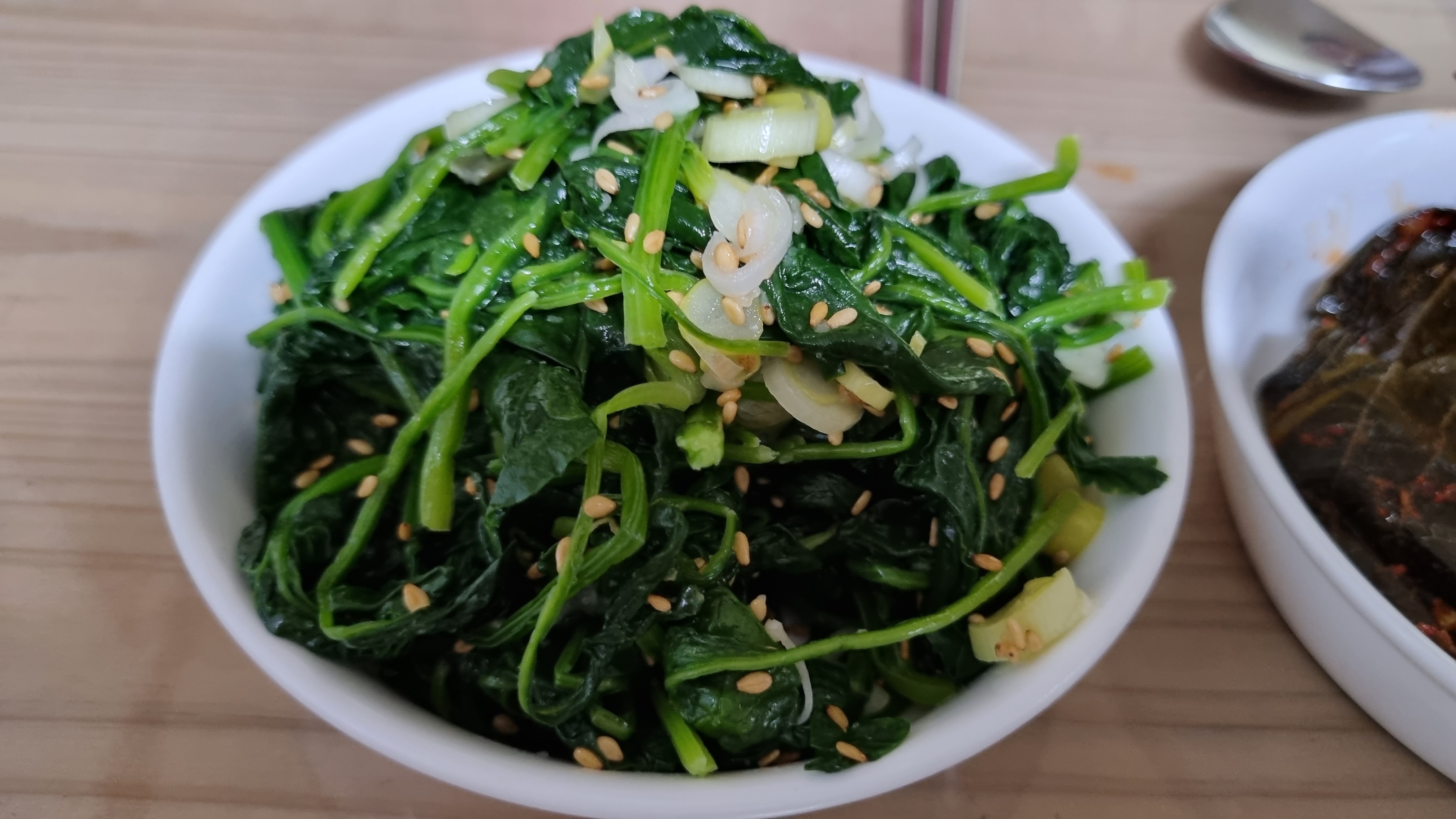 다리가 저릴 정도로 다듬고 다듬고 다듬었다. 그리고 완성한 무농약 시금치나물. 남은 시금치는 겉절이도 해 볼 생각이다.