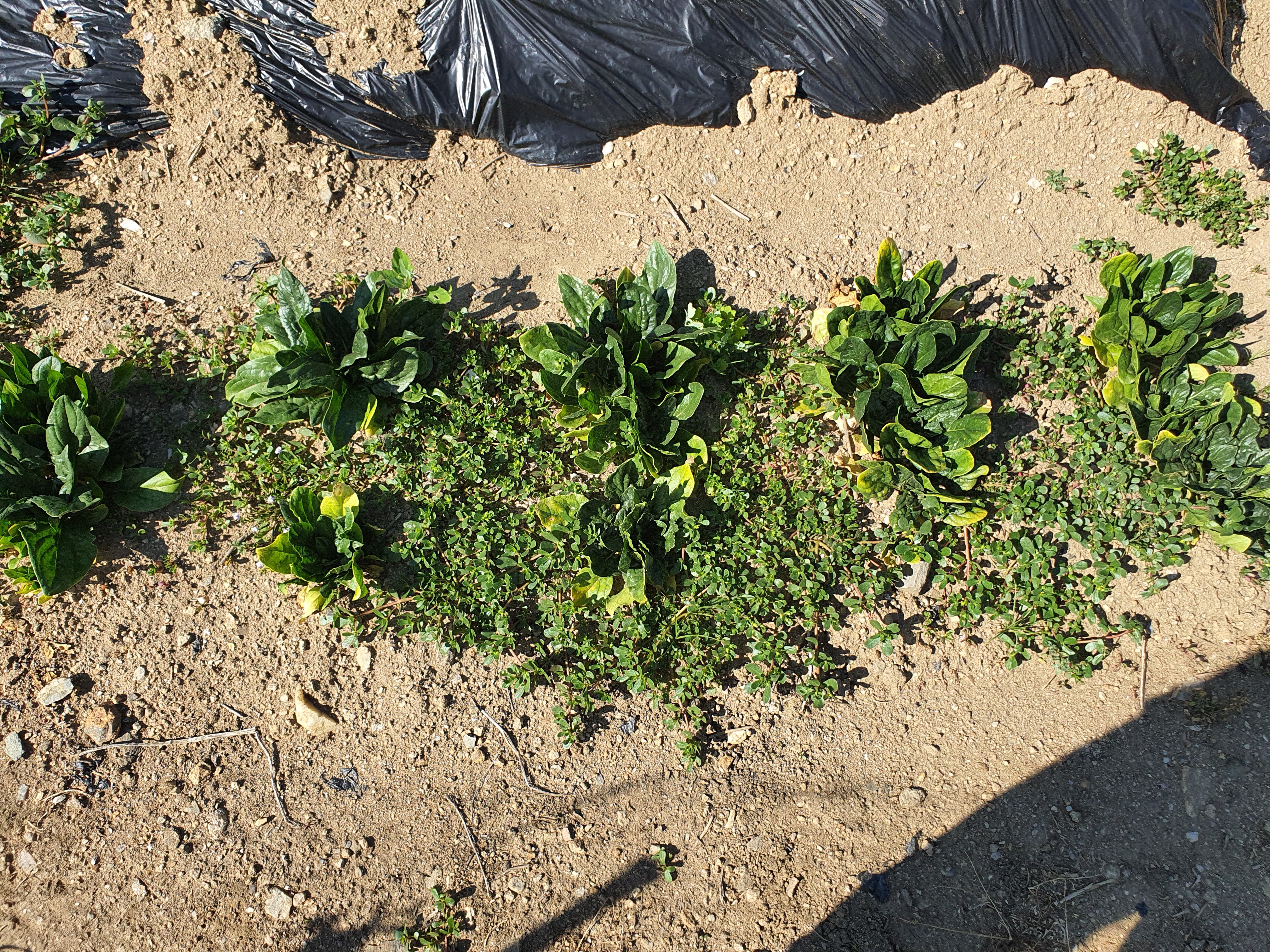 일주일이 지나고 시금치를 수확하려고 했다. 진짜 깜짝 놀라고 말았다. 위의 사진에서 시금치 주변에 풀들이 어마어마하게 자랐다. 크라는 시금치는 안크고 풀만 자라서 땅이 보이지 않을 정도다. 결국 시금치 수확은 못하고 땀 흘리며 풀만 뽑았다. 작물을 키우면 정말 풀과의 전쟁이다. 이 풀을 뽑지 않으면 땅의 양분을 풀이 다 뺏어가서 시금치가 잘 크지 않는다고 한다.