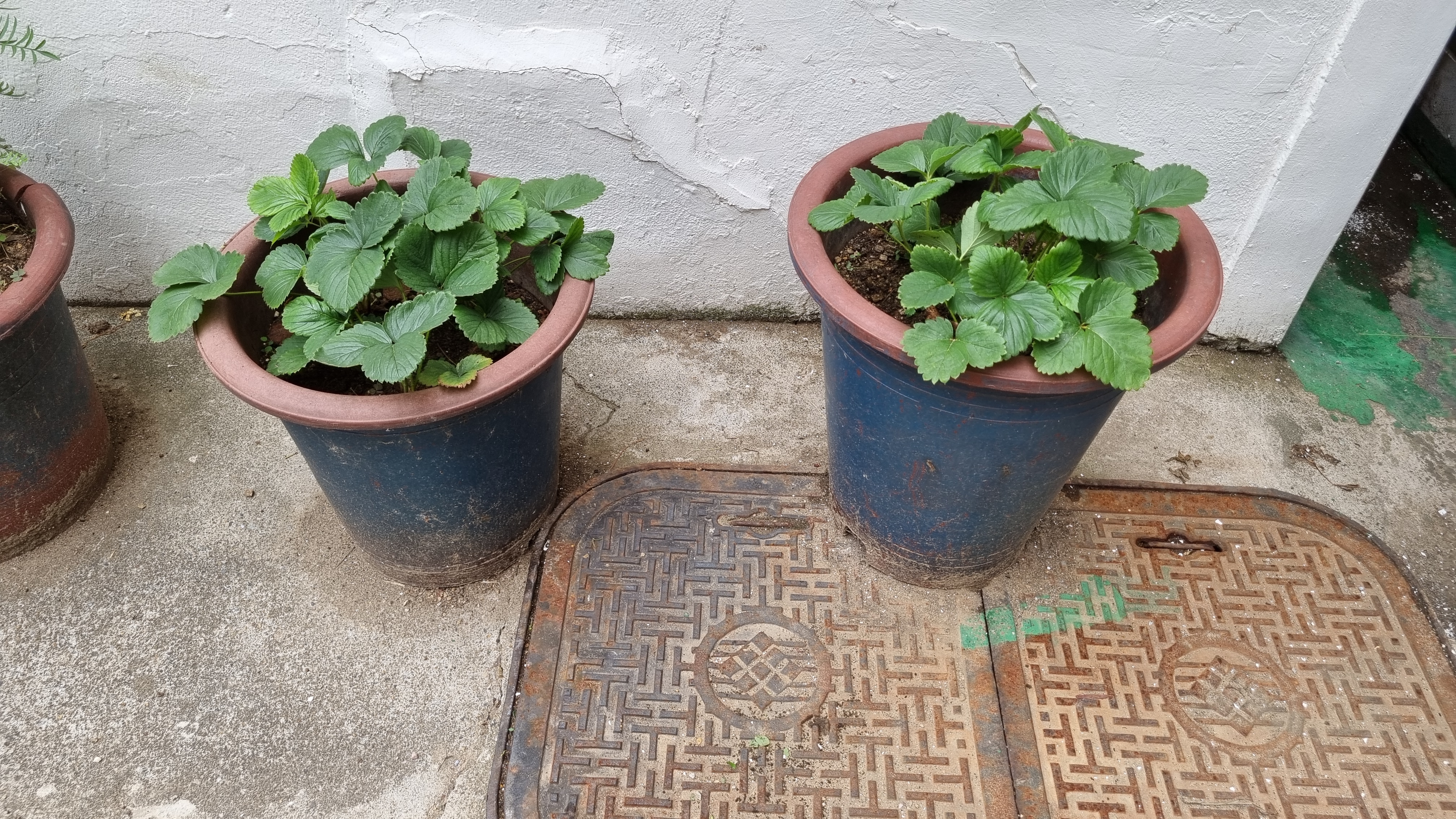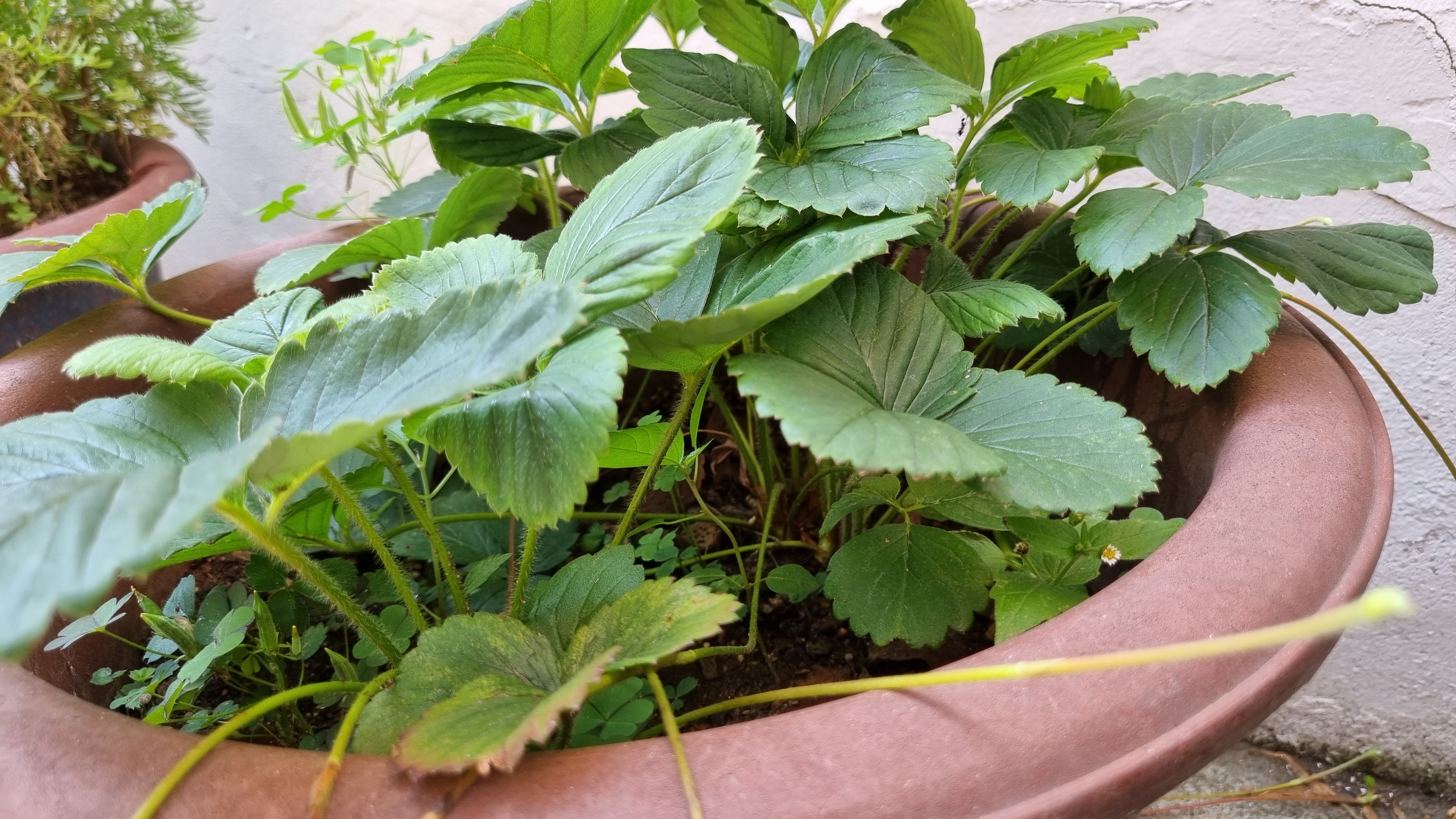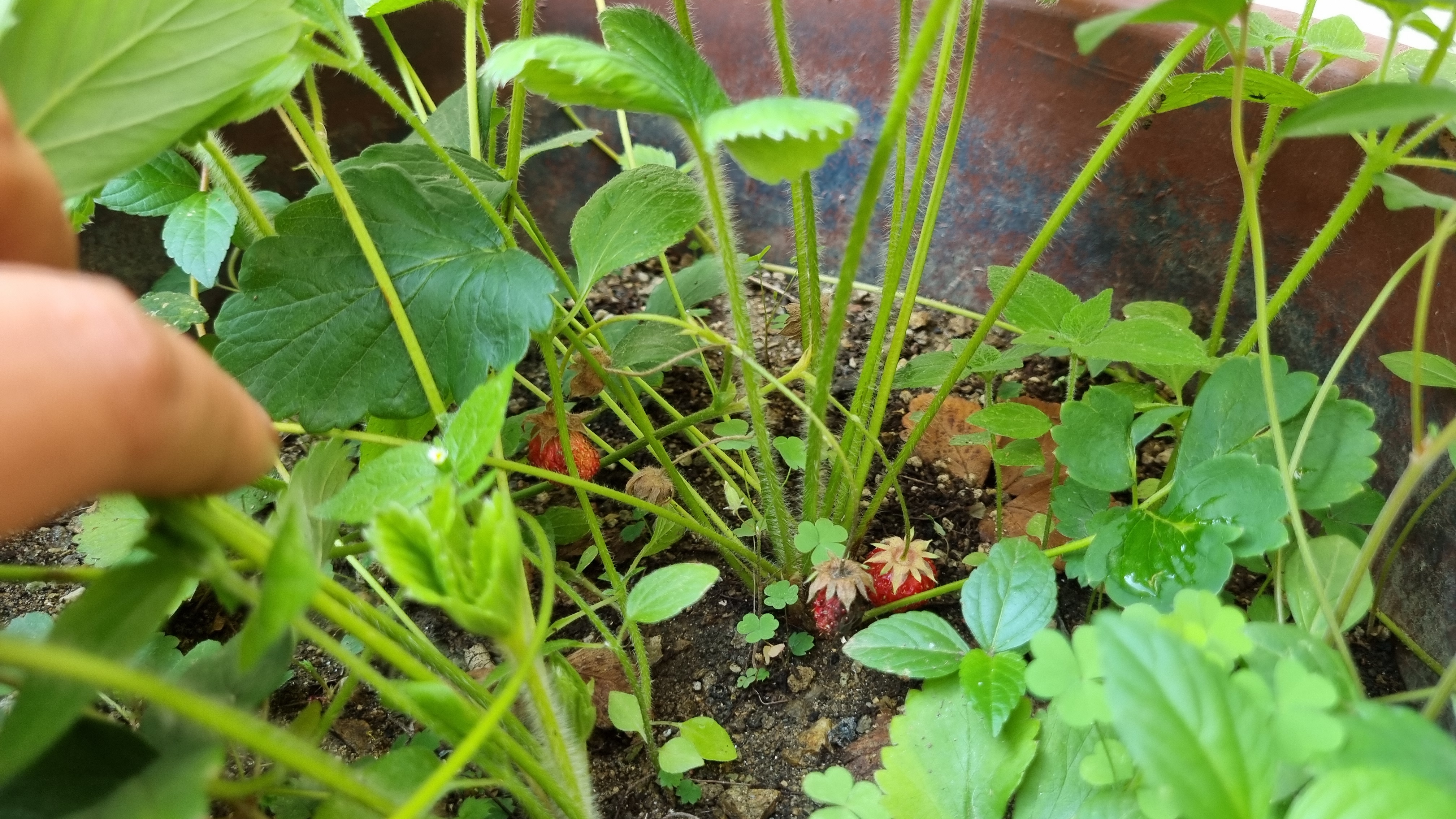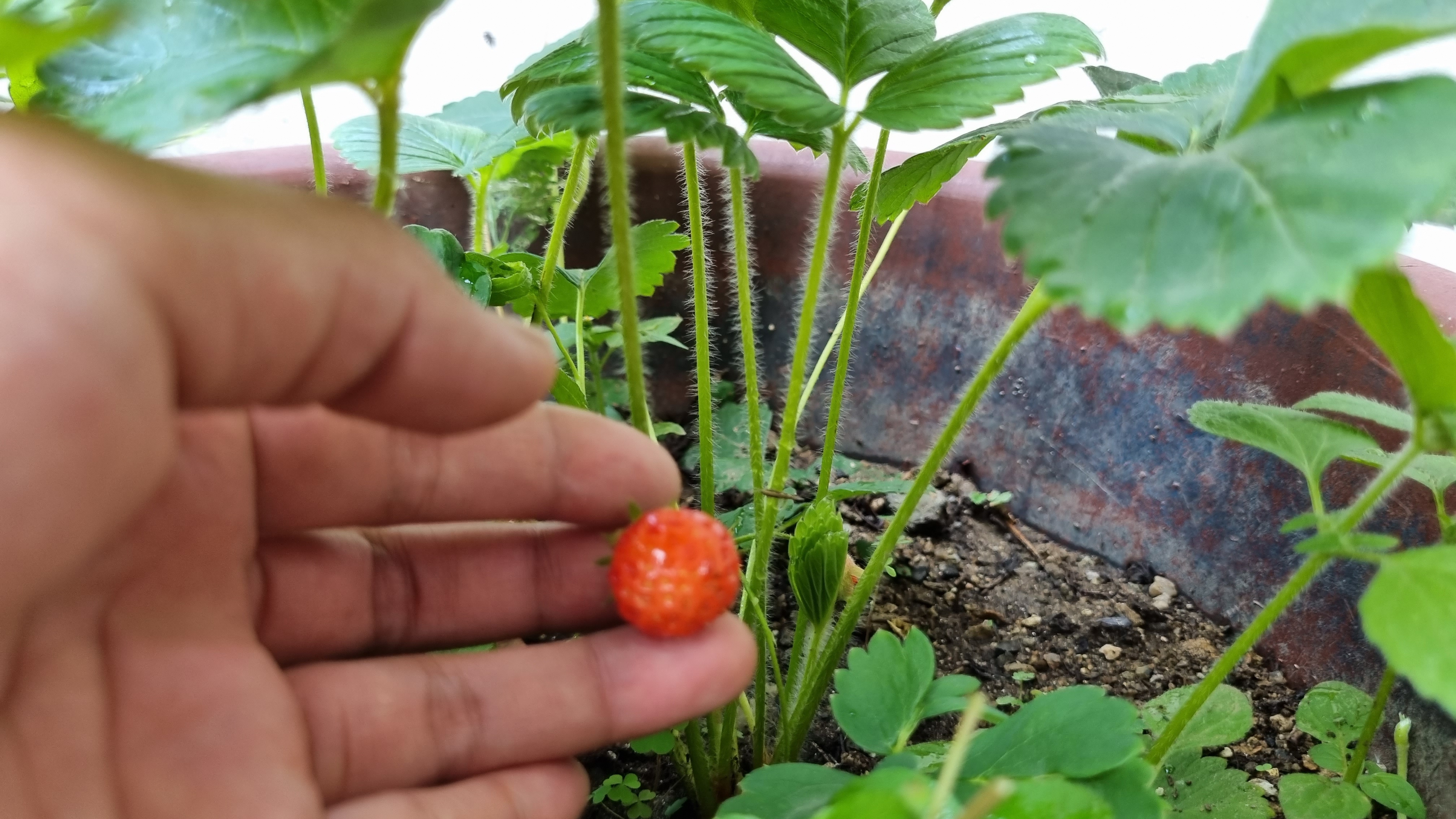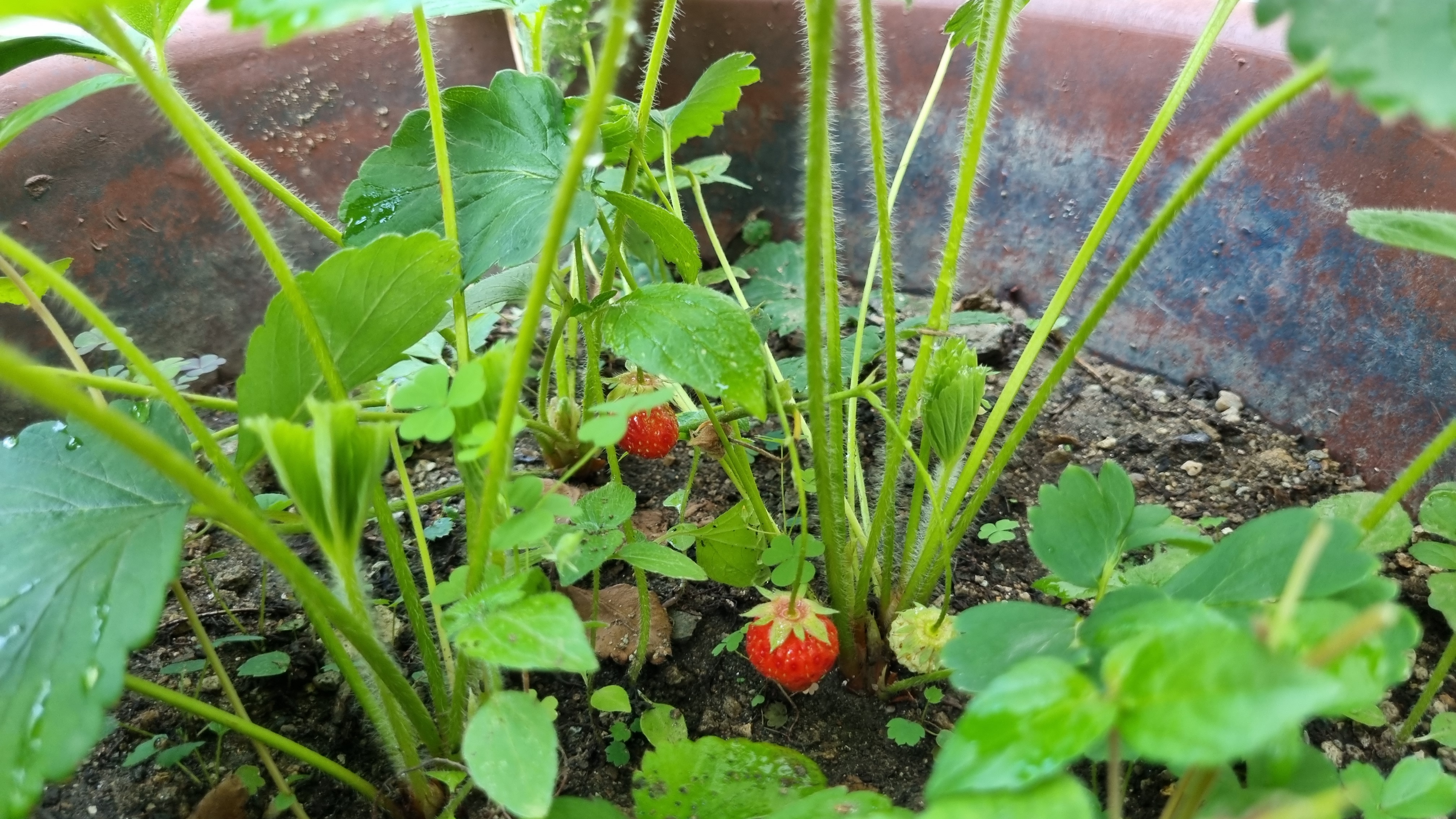 큰 화분에서 딸기가 3개 열렸지만 너무 작아서 수확하지 않았다. 그래서 그런지 시들어 버렸다. 못 먹는다.