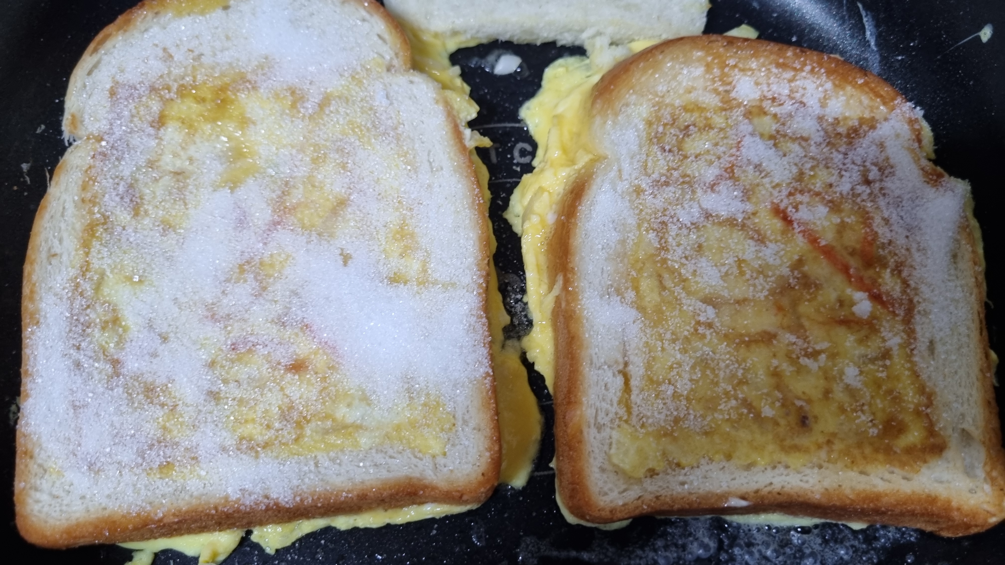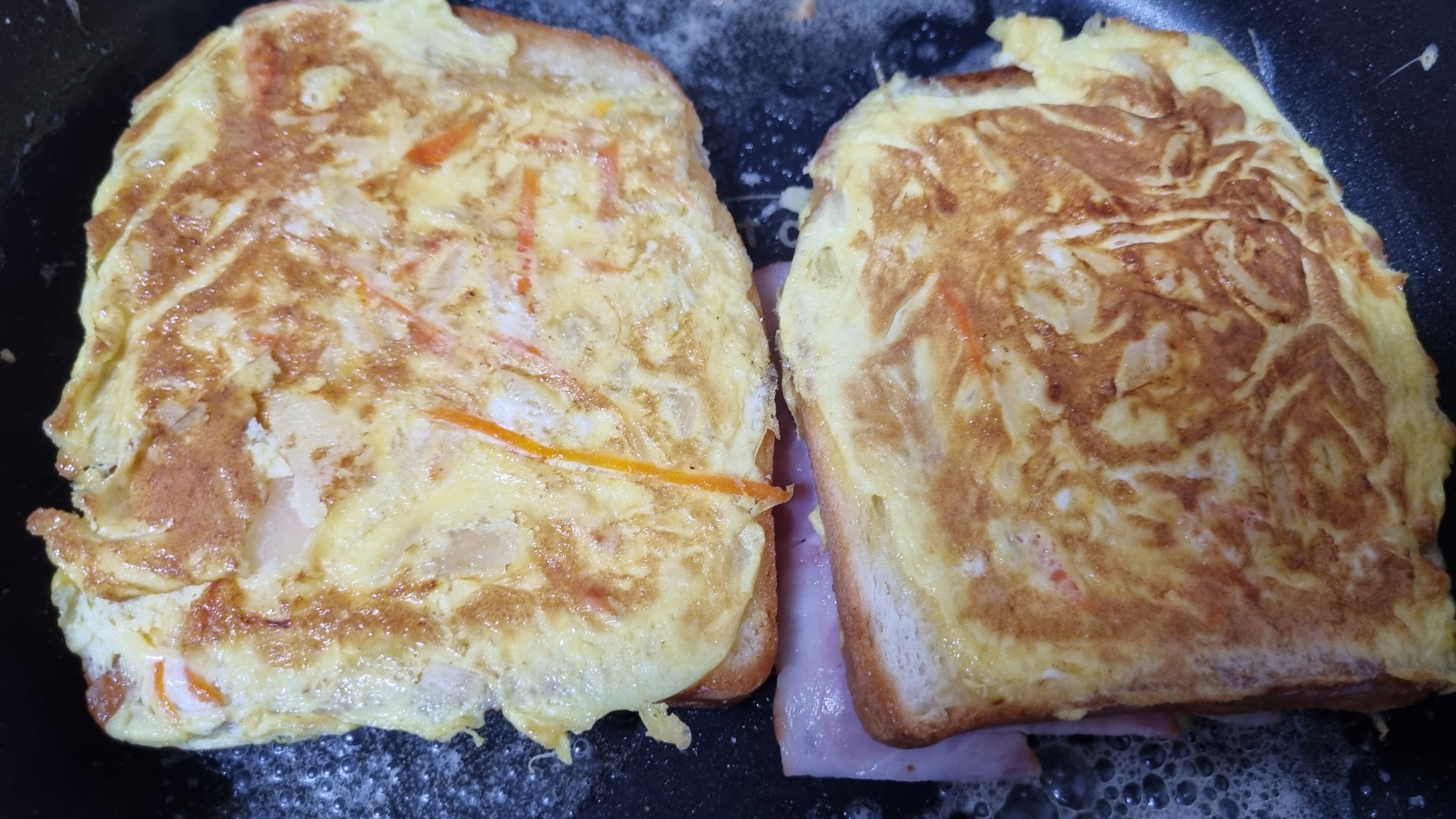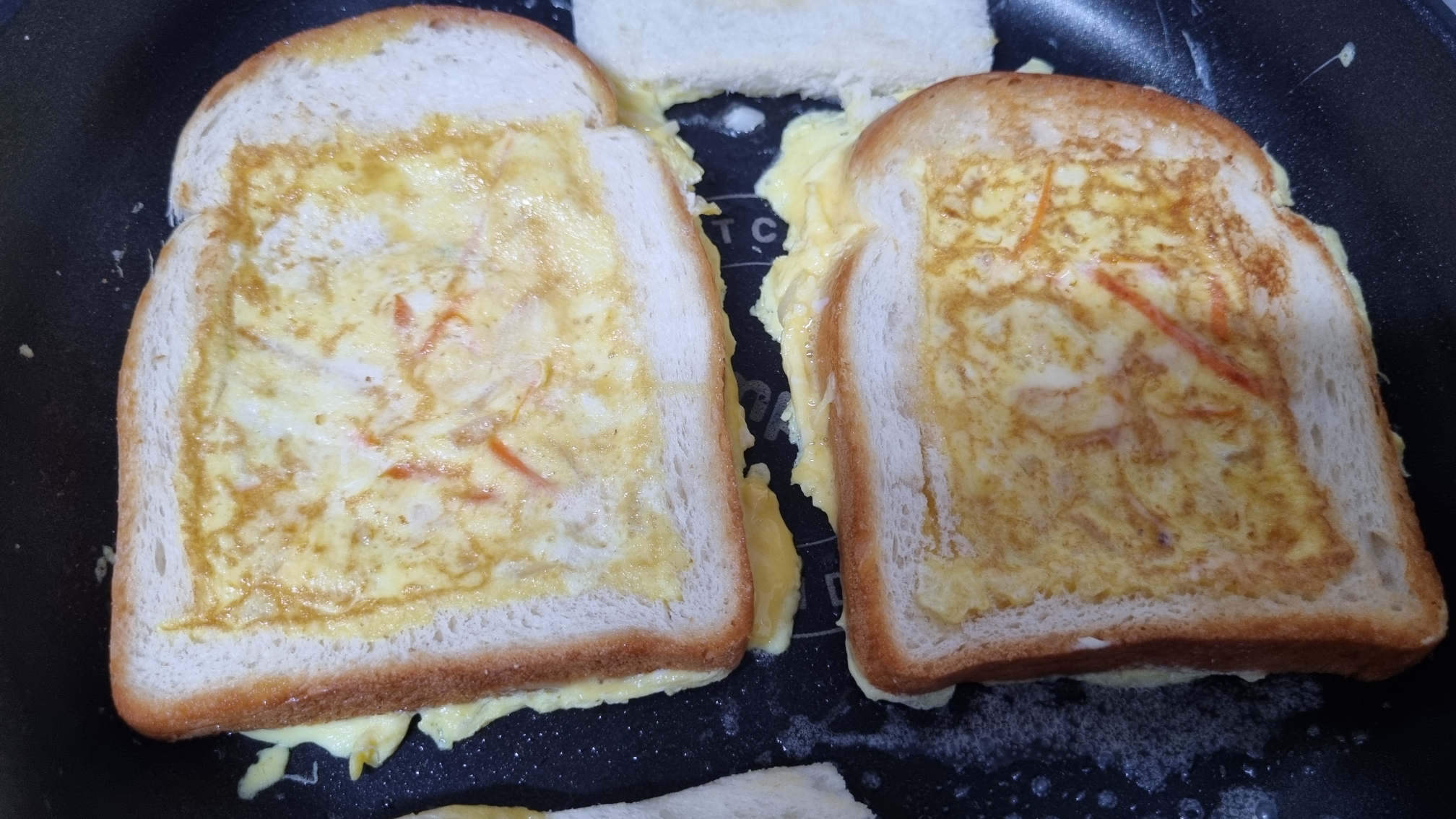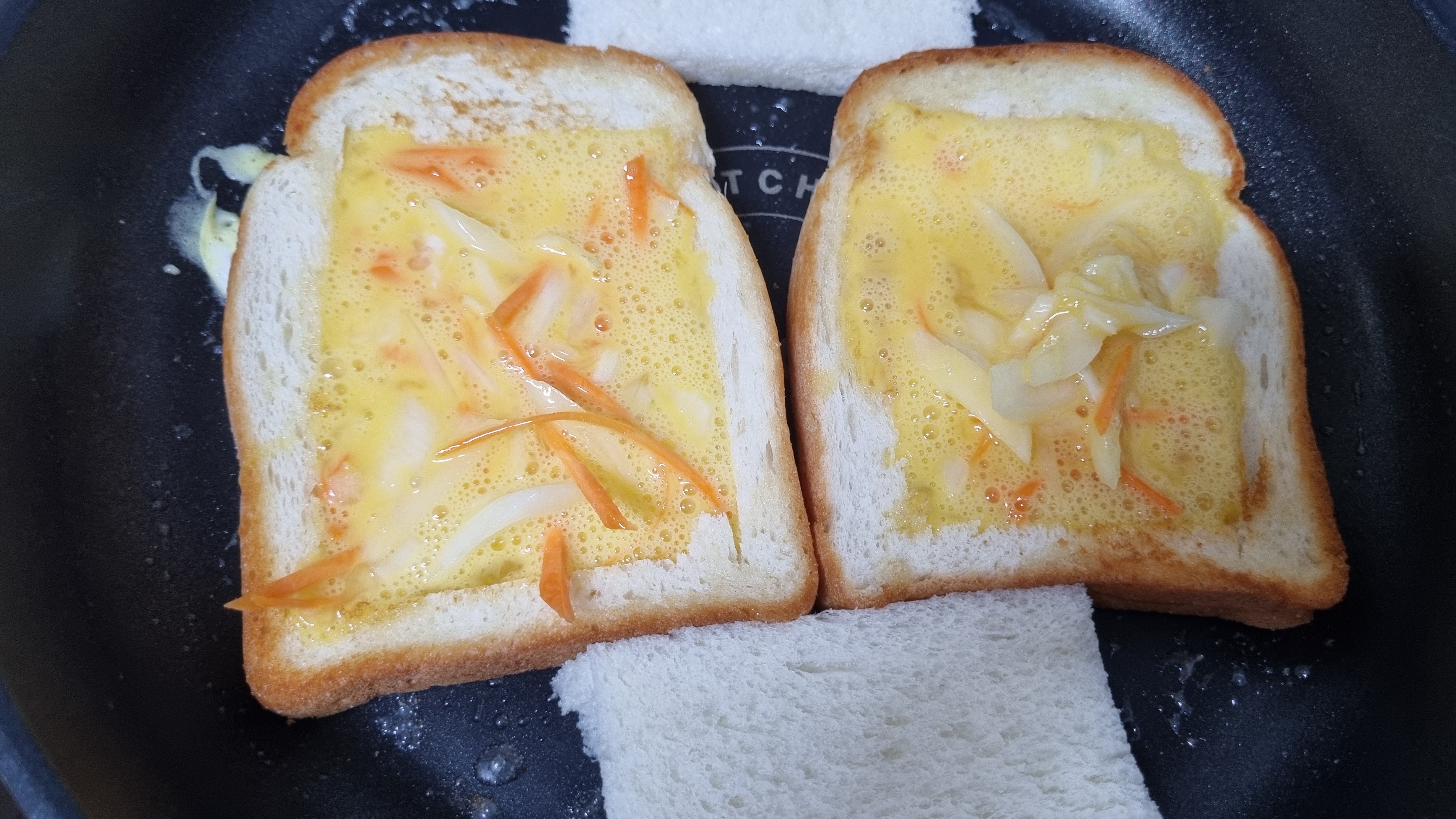식빵의 구멍 뚫린 부분에 야채와 섞은 계란물을 부었다. 그리고 앞, 뒤로 노릇하게 굽는다.