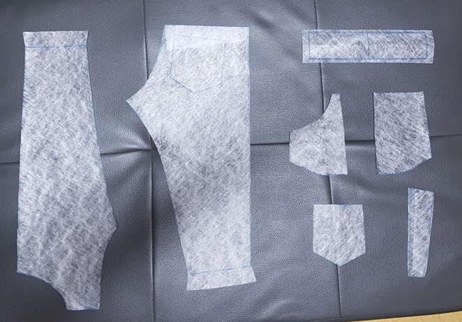 원단을 패턴과 같이 재단했다. 아래 사진은 바지 앞판 2장, 뒤판 2장, 요크 2장, 주머니 안감 2장, 뒷주머니 2장, 안주머니 2장이다. 안주머니도 같은 원단으로 사용할 경우 주머니 부분이 너무 두꺼워져서 불편하기도 하고 빨래도 잘 안 말라서 두께가 얇은 다른 원단으로 했다.