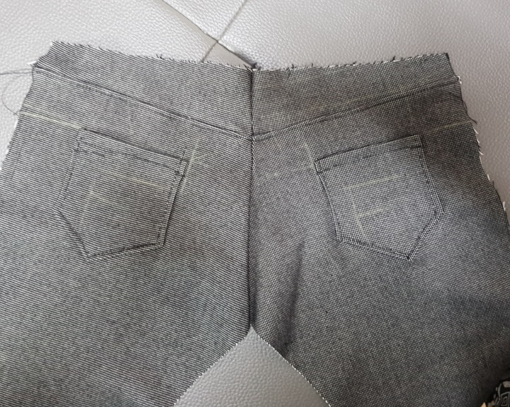 부랴부랴 남은 원단을 찾아 재단하고 요크 위에 덧대서 수습했다. 그리고 옆선을 재봉했다. 이제 길이가 맞는다.