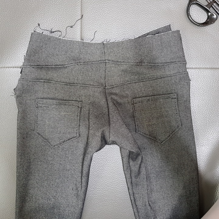 흠.... 주머니를 달고 밑아래를 재봉하고 옆선을 시침핀으로 고정하고 보니 뭔가 이상하다. 바지 앞판과 뒤판의 길이가 맞지 않는다. 바지 뒤판의 밑위가 너무 길어서 조금 재단했더니 이지경이다.