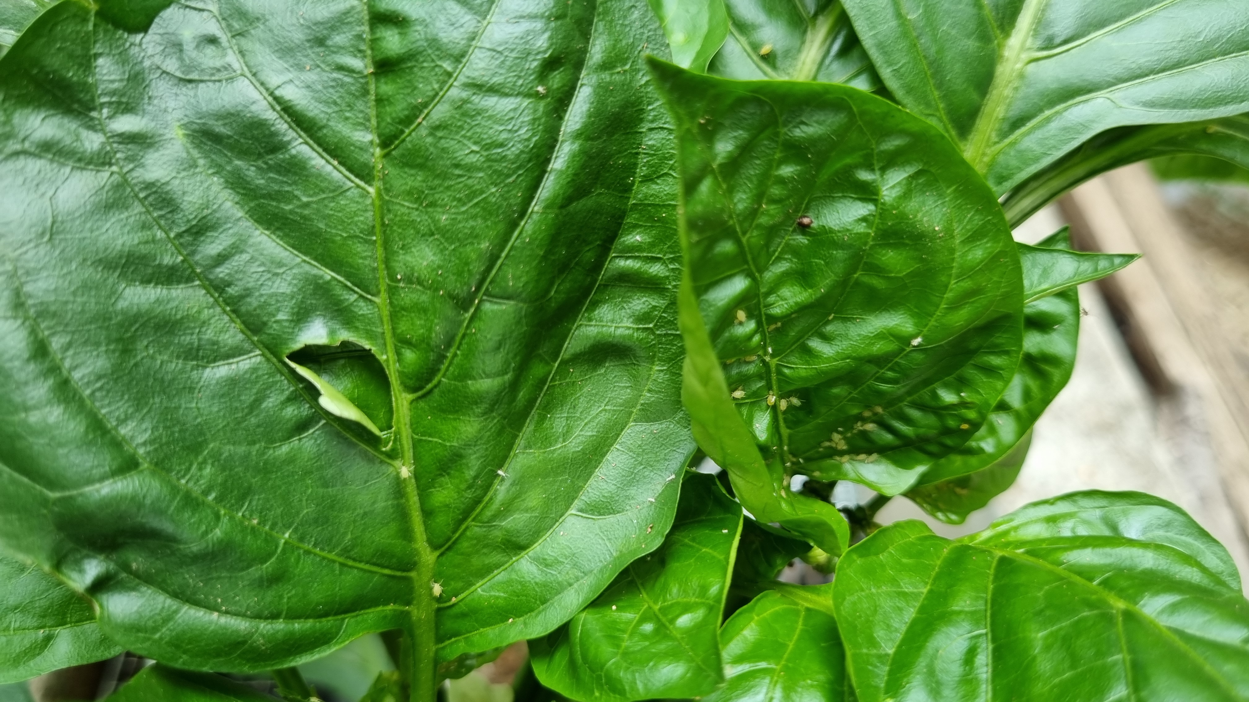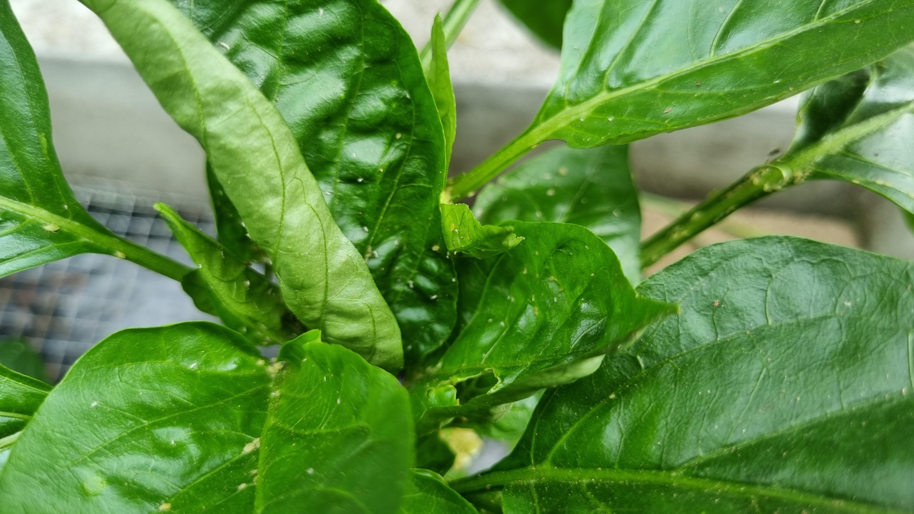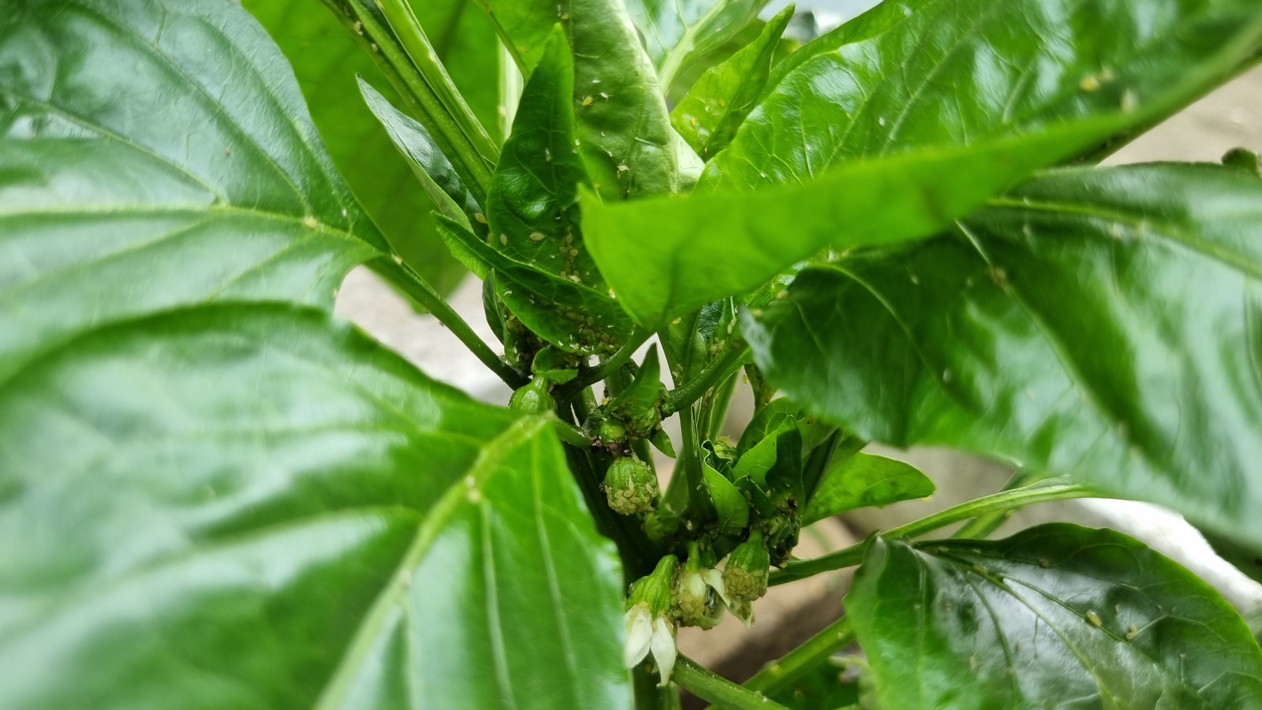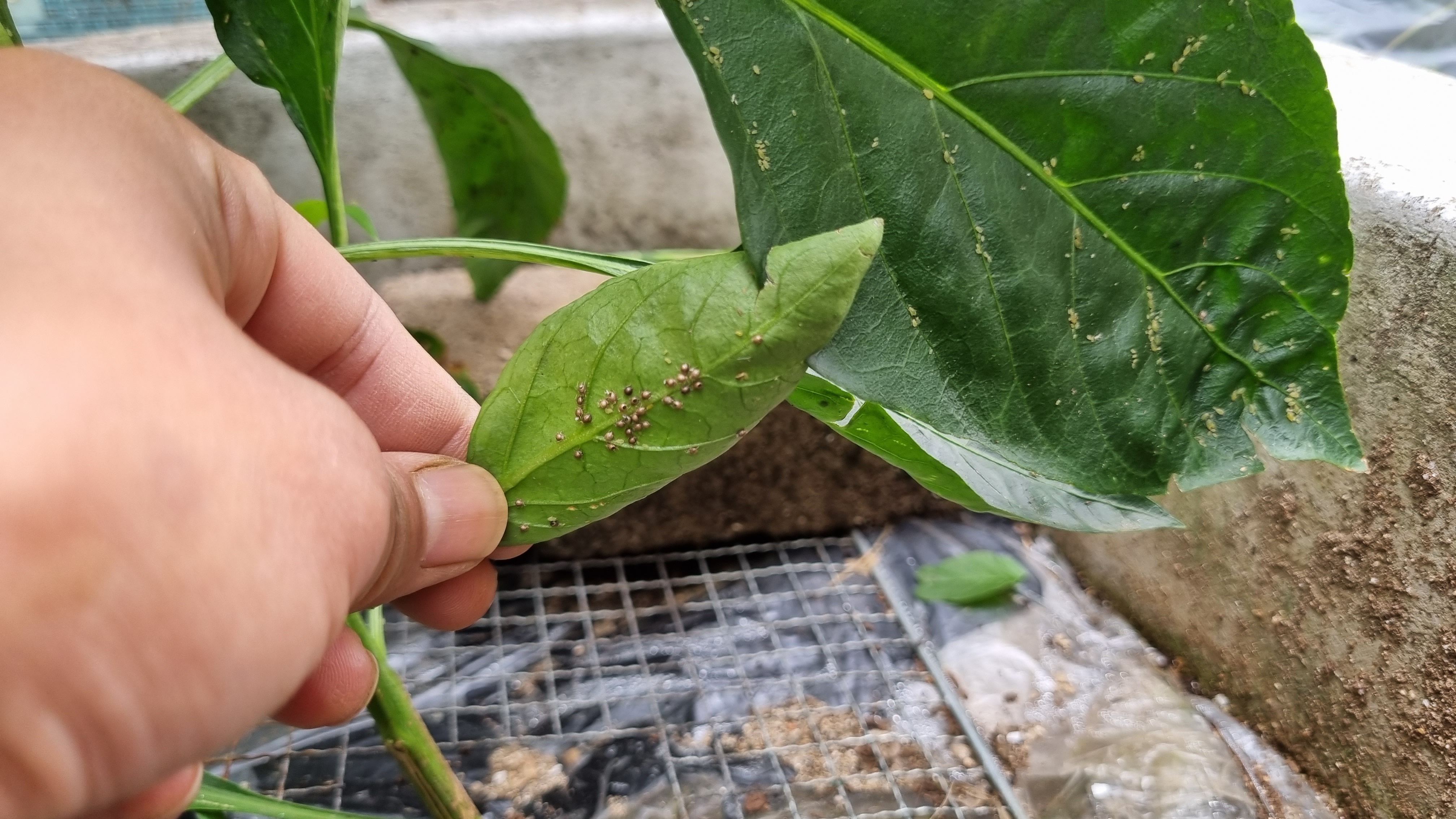 파프리카의 잎 뒷면에 진딧물의 흔적이 보인다. 사실 이것들이 검은색이었으나 많은 비를 맞더니 이렇게 변했다.