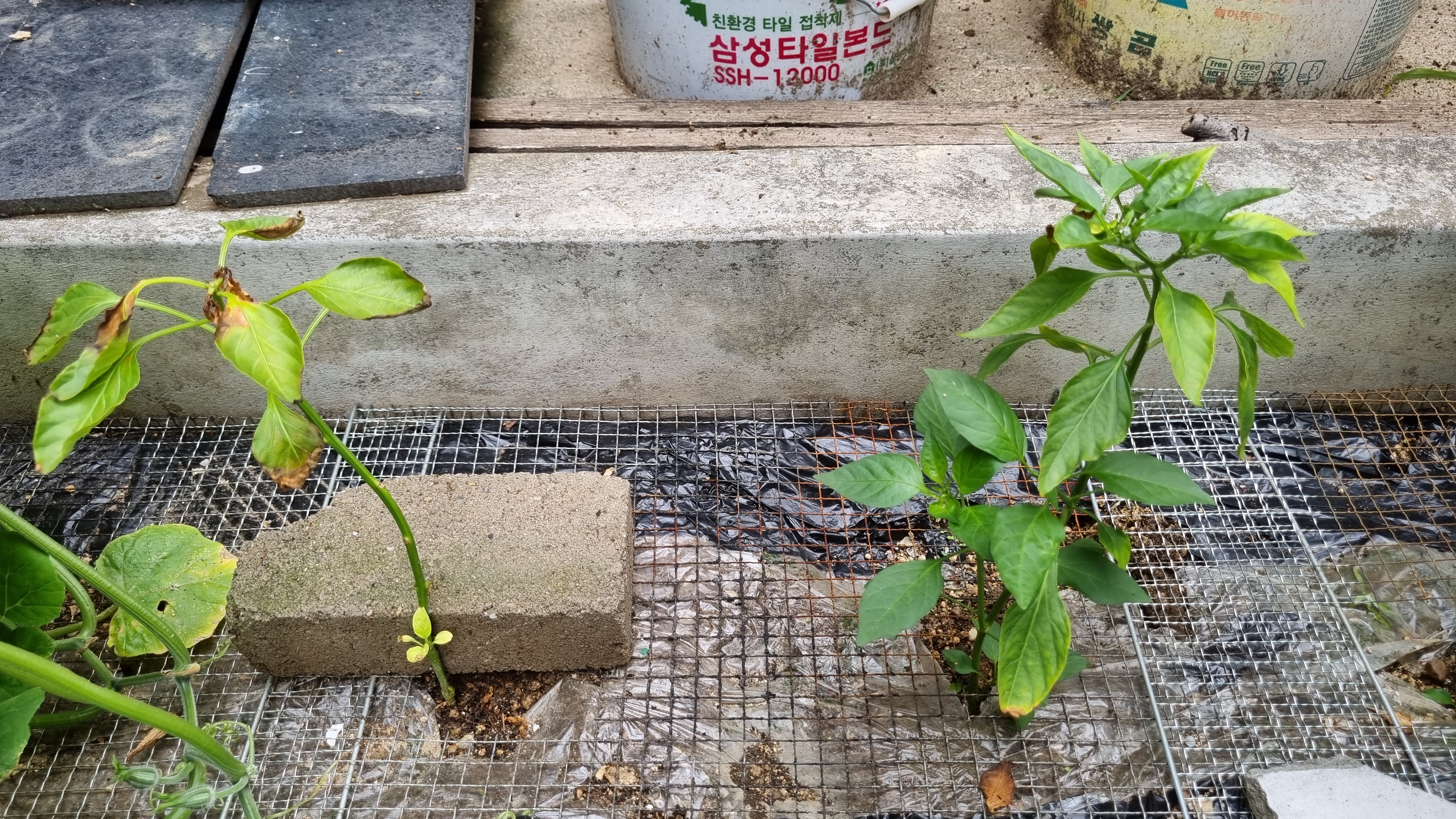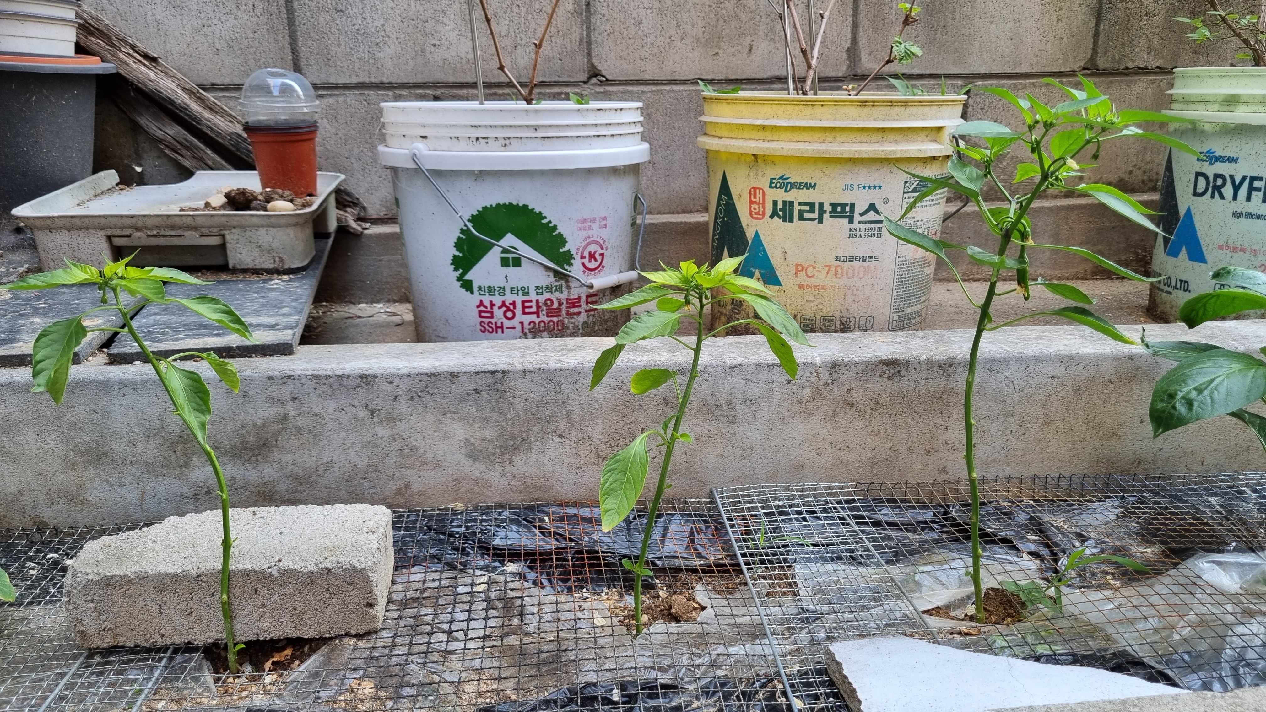 잘 크지 않는 고추 모종 2개는 그냥 뽑았다. 포기했다. 사실 어떻게 살려야 되는지도 잘 모르고. 약을 쓰기엔 지식도 너무 부족하고 가까운 곳에 종묘상도 없다.