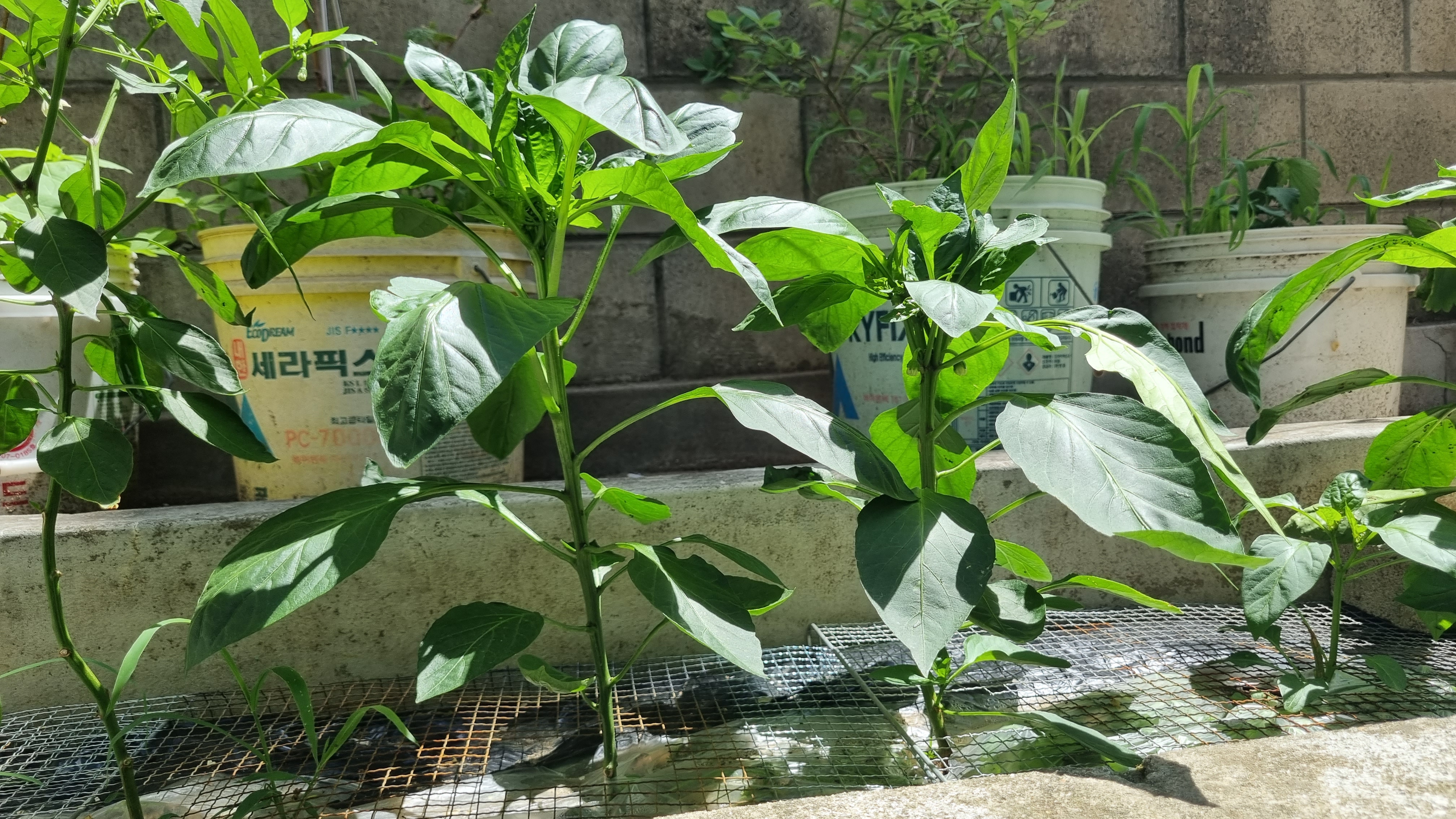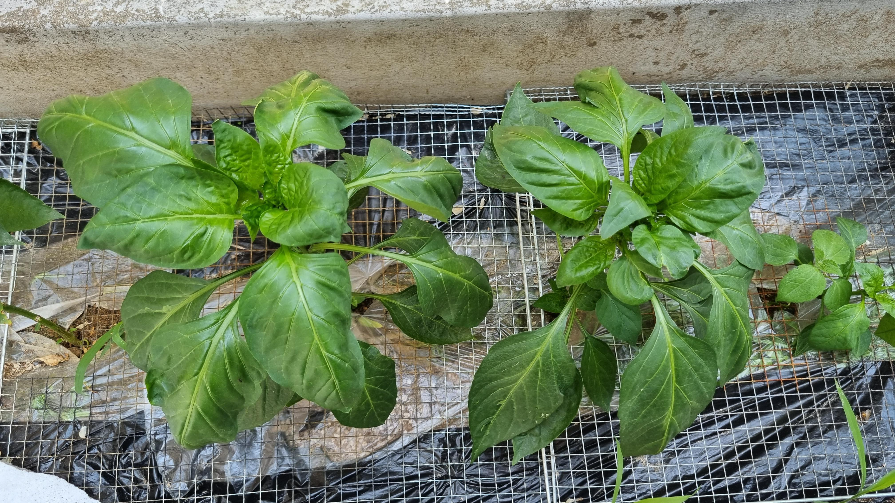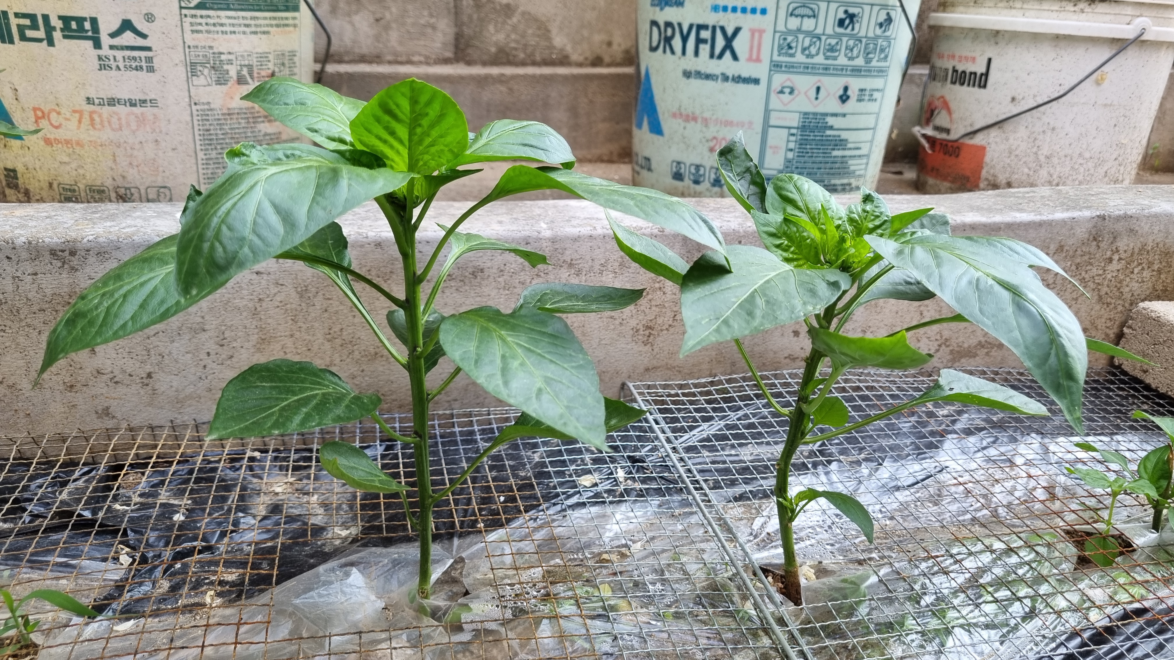 고추와 피망도 잘 자라고 있다. 하지만 왼쪽의 고추 모종 2개는 희망이 없어 보인다. 잘 자라지 않는다. 분명 병해충일 것 같은데... 정확한 원인은 모르겠다.