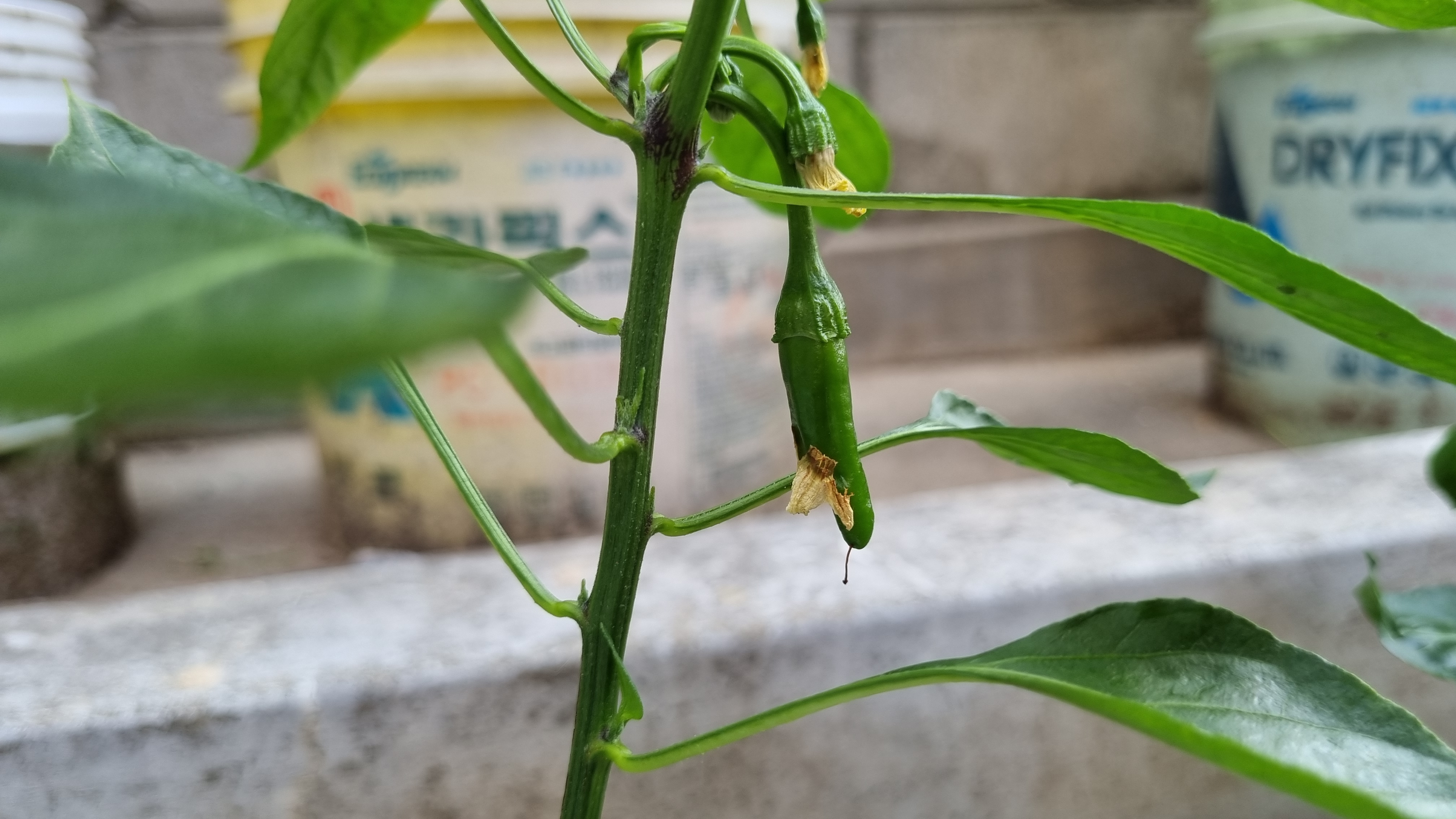 여전히 2개의 고추 모종은 절대로 잘 자라지 않는다. 슬슬 걱정이 된다. 잎들도 누렇게 변하고 시들하다. 병해충이라도 입은 걸까?