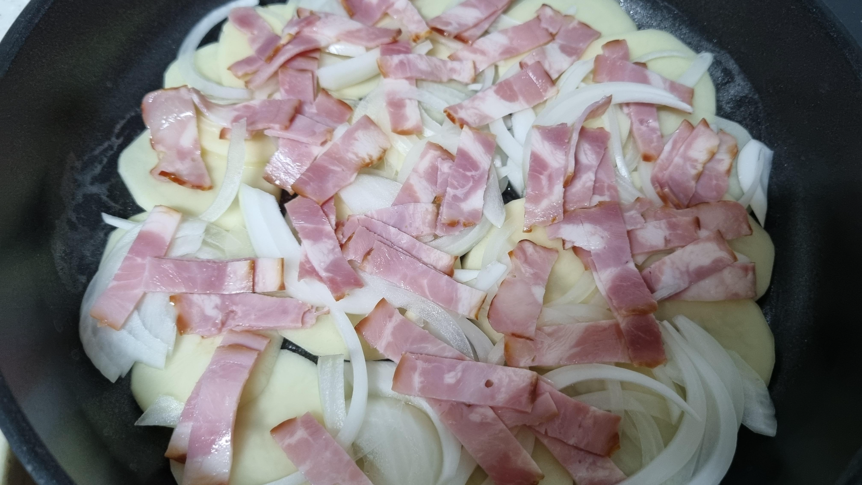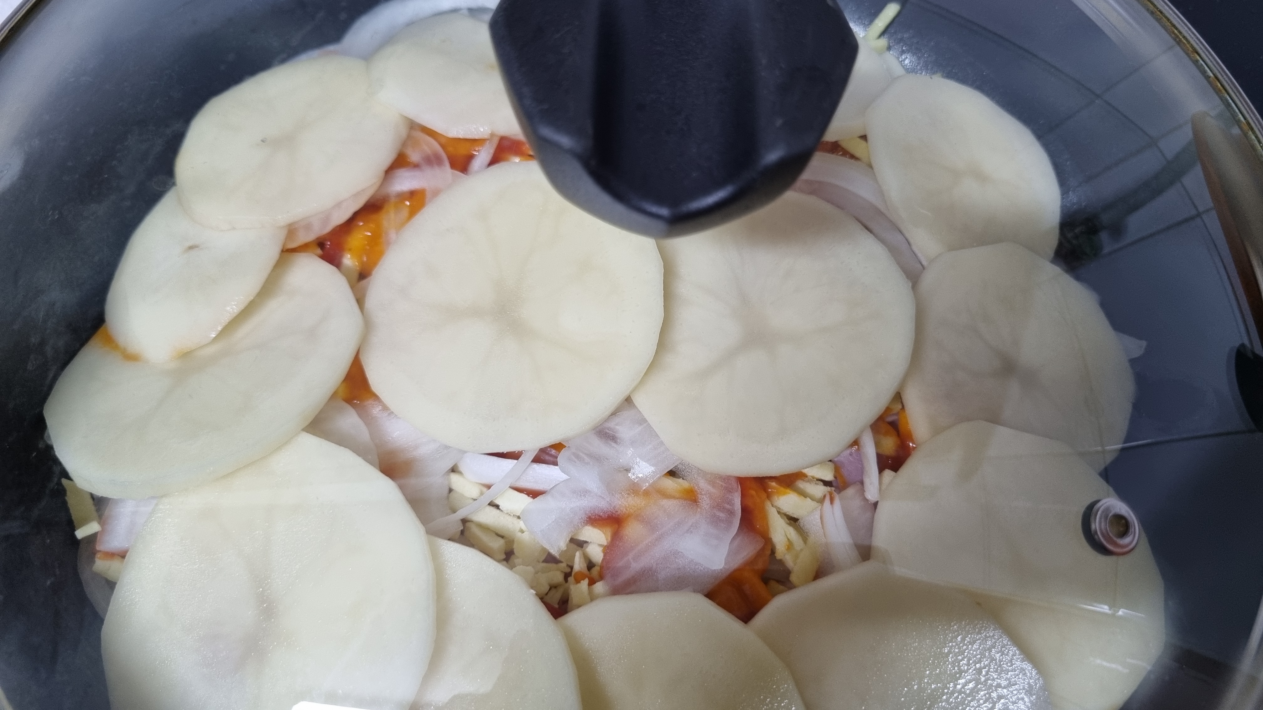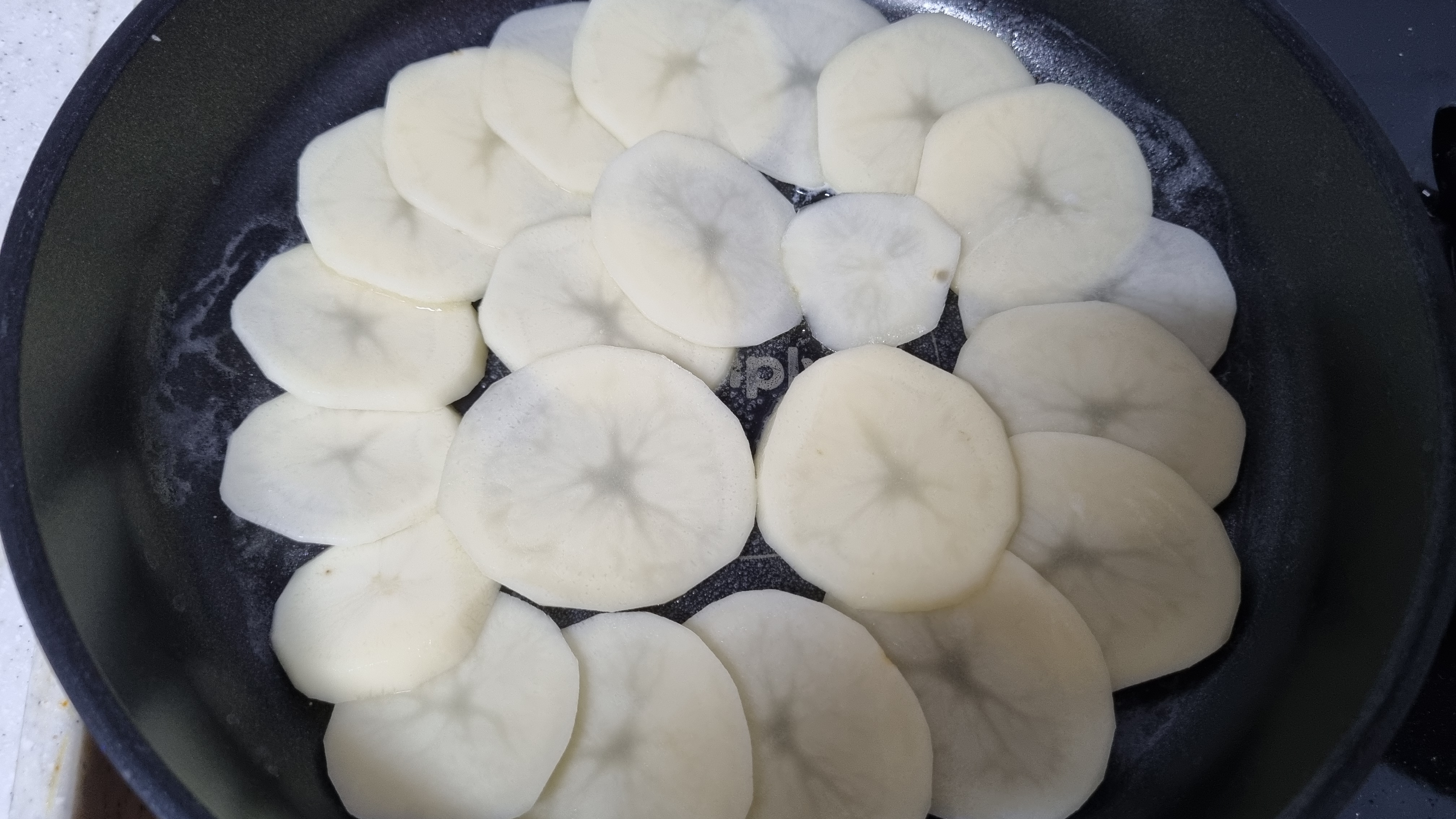 얇게 썬 감자를 팬이 가려지도록 올려놓는다. 빵을 대신한 감자다.