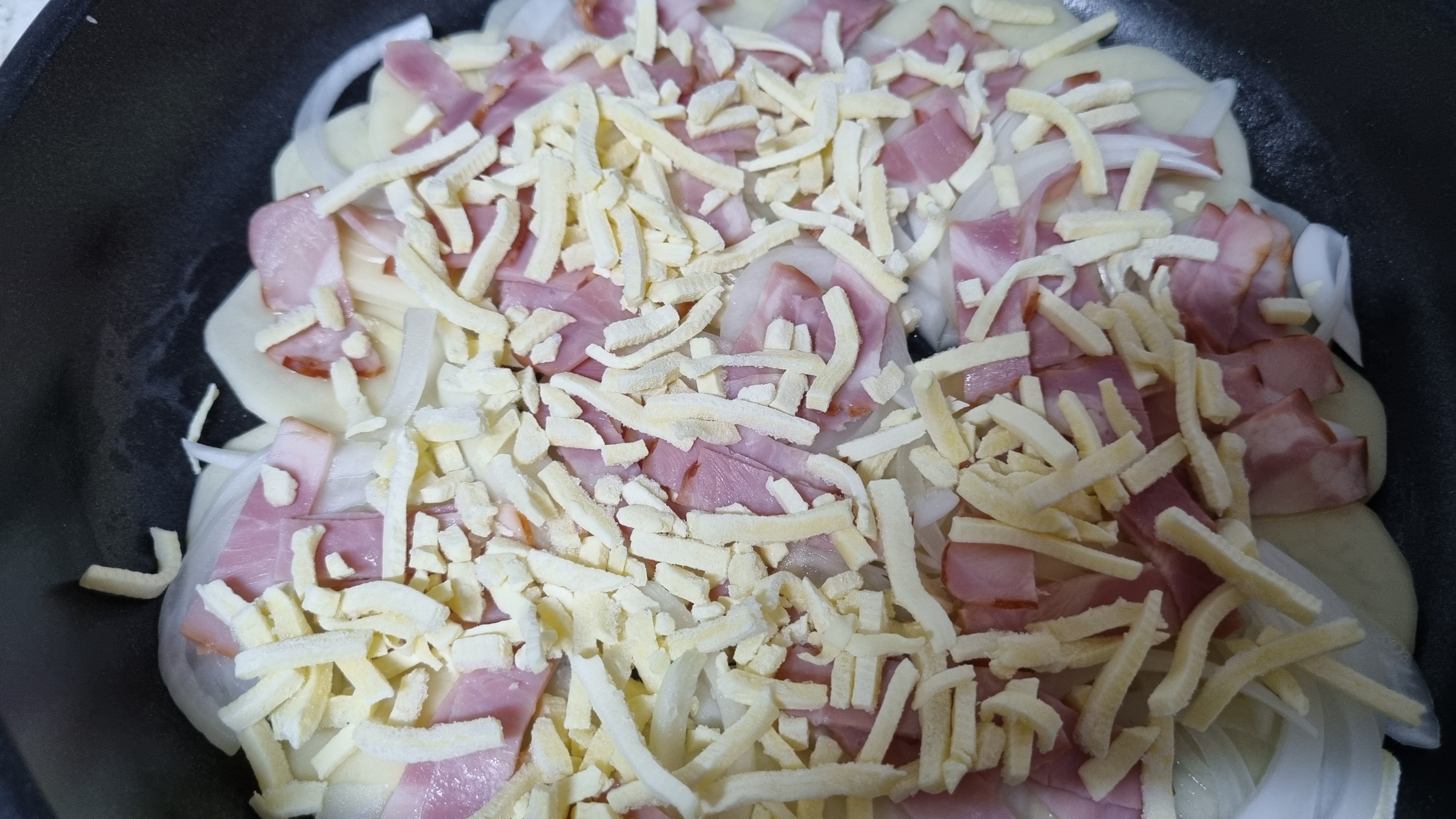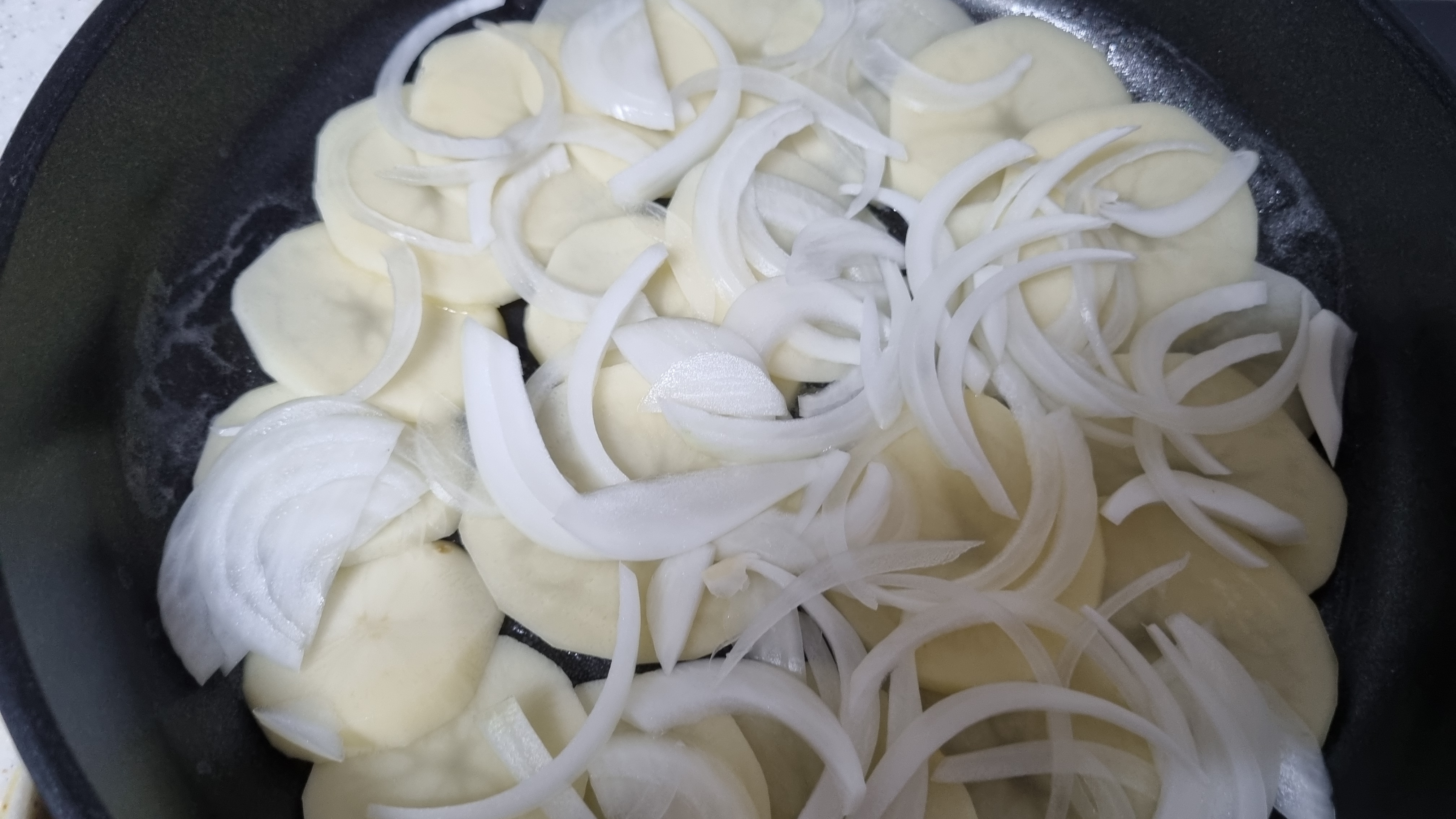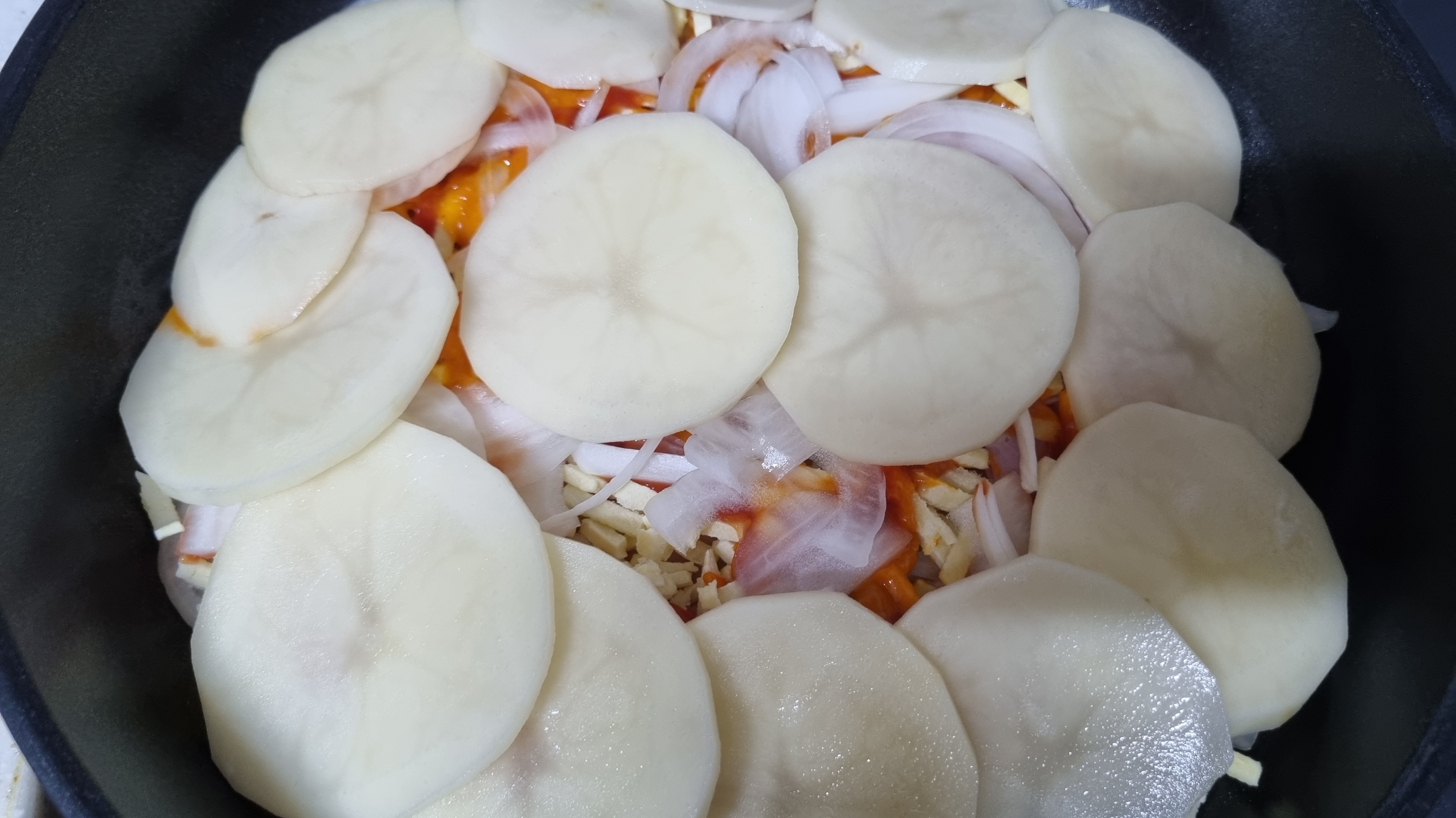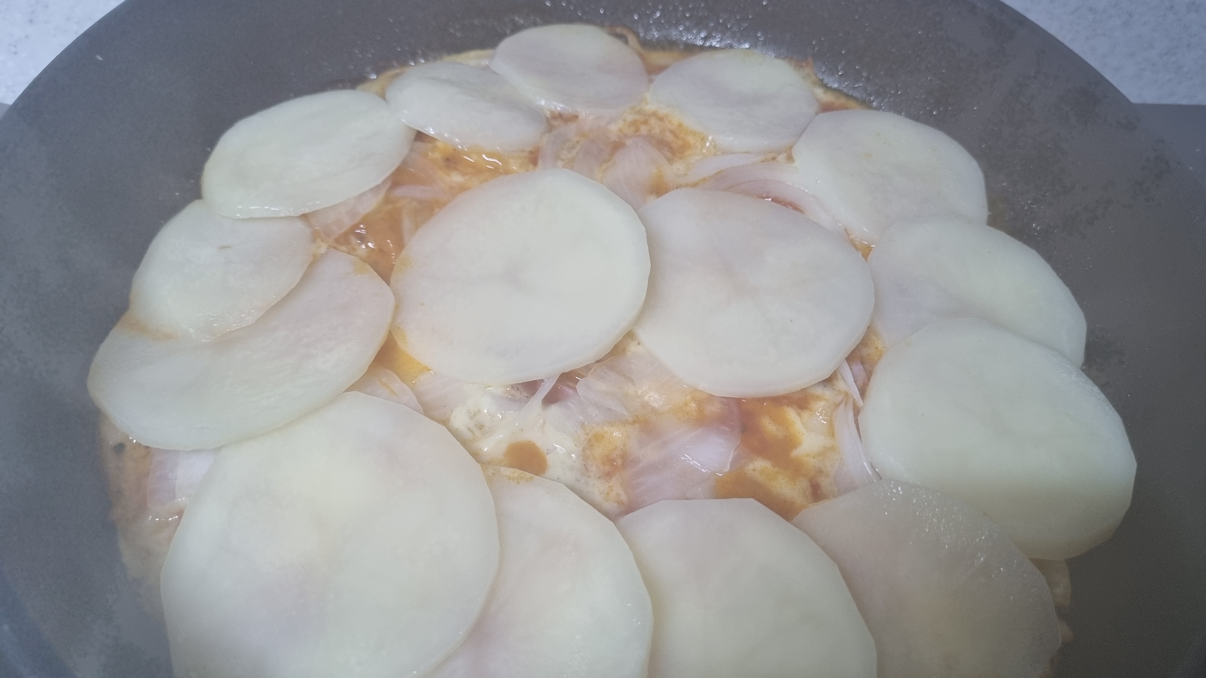 얇게 썬 감자를 팬이 가려지도록 올려놓는다. 빵을 대신한 감자다.