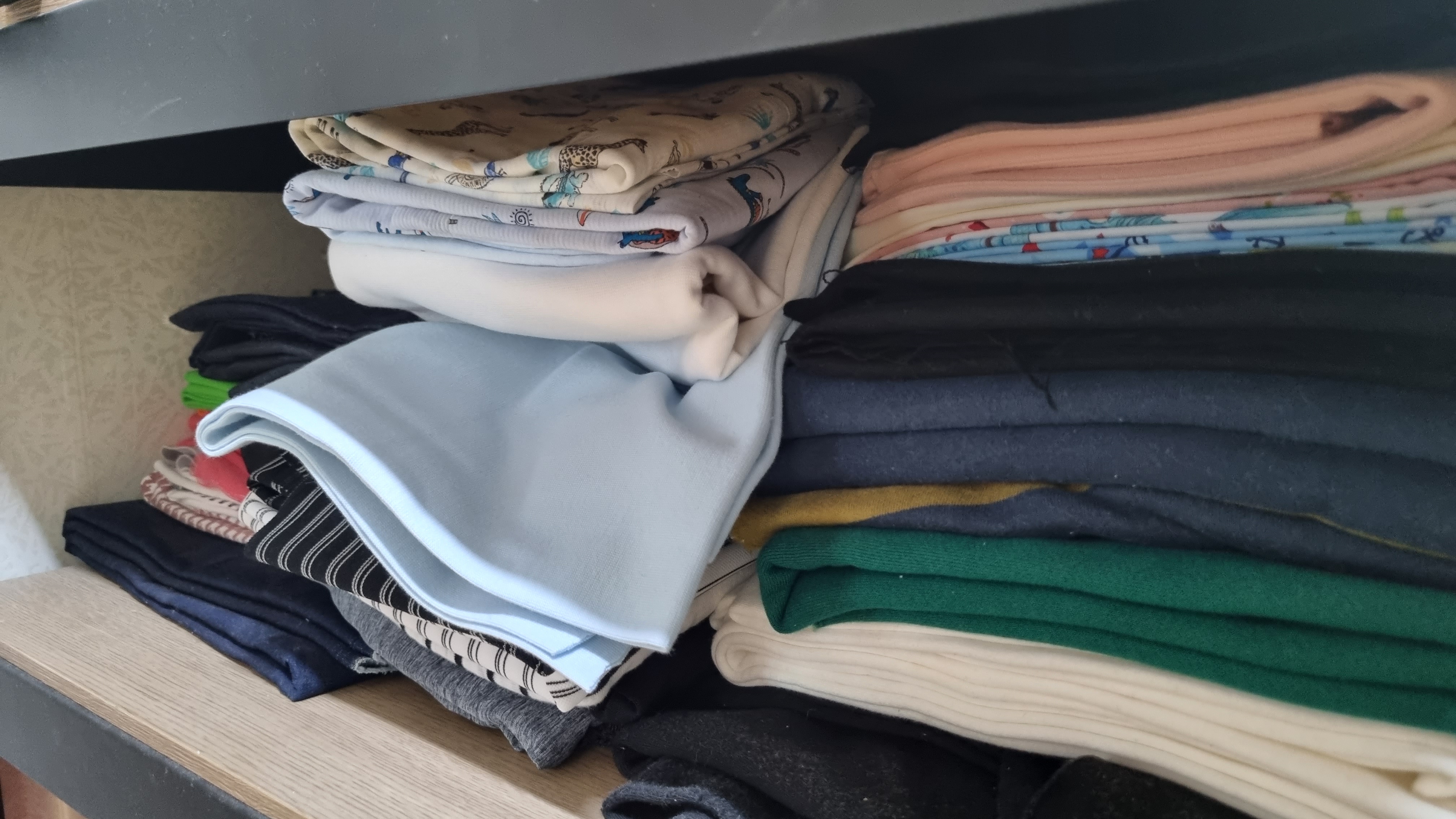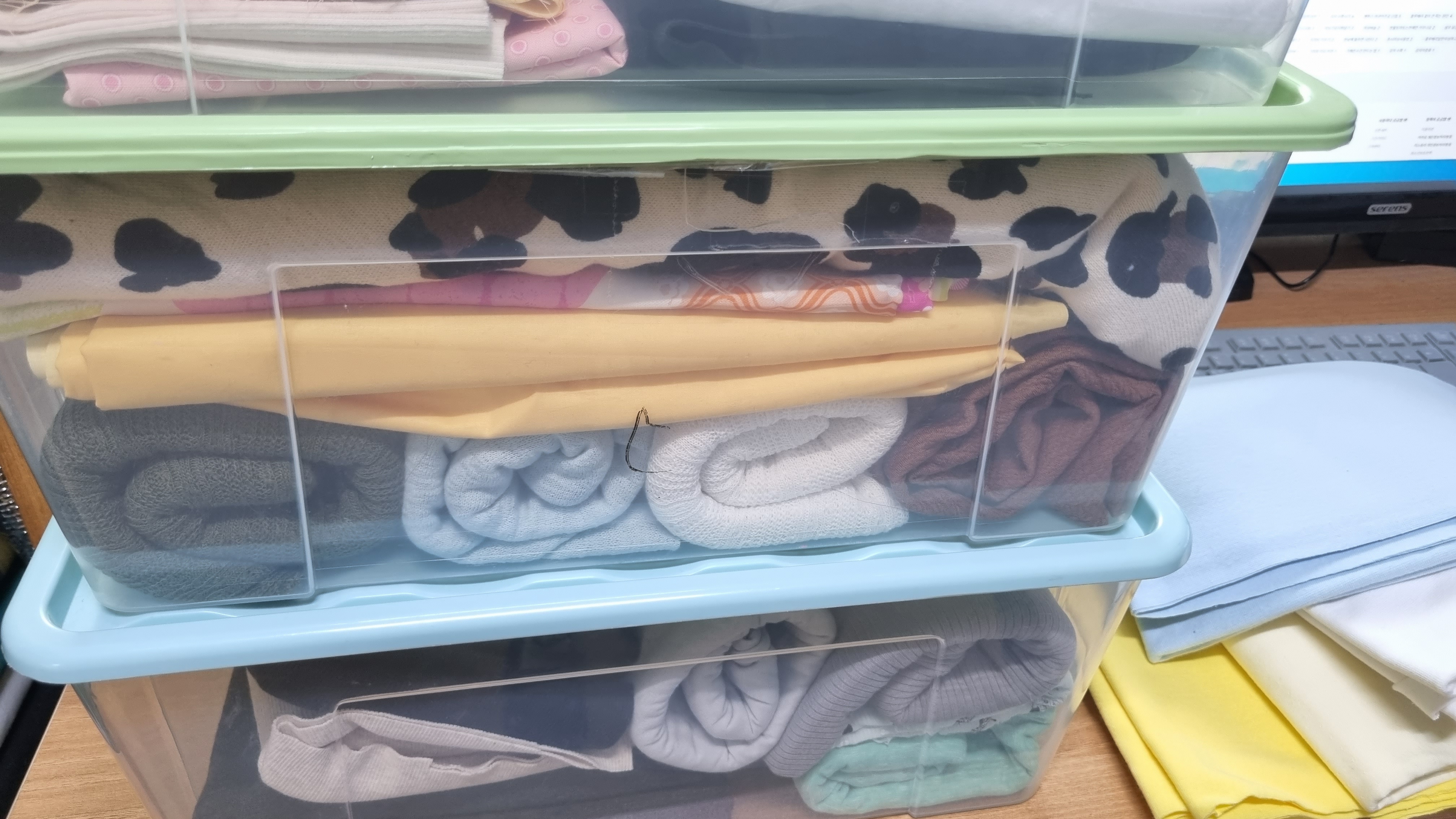 난 웬만하면 원단을 모으지 않는 편이다. 되도록이면 사둔 원단은 거의 소비하는 편인데 원단이 쌓인다. 색깔별로 시보리만 모아도 한가득이다. 아우~ 미쳐 진짜!! 이제 더 이상 쌓아 올릴 장소도 없다. 집이 좁다. 좁아.