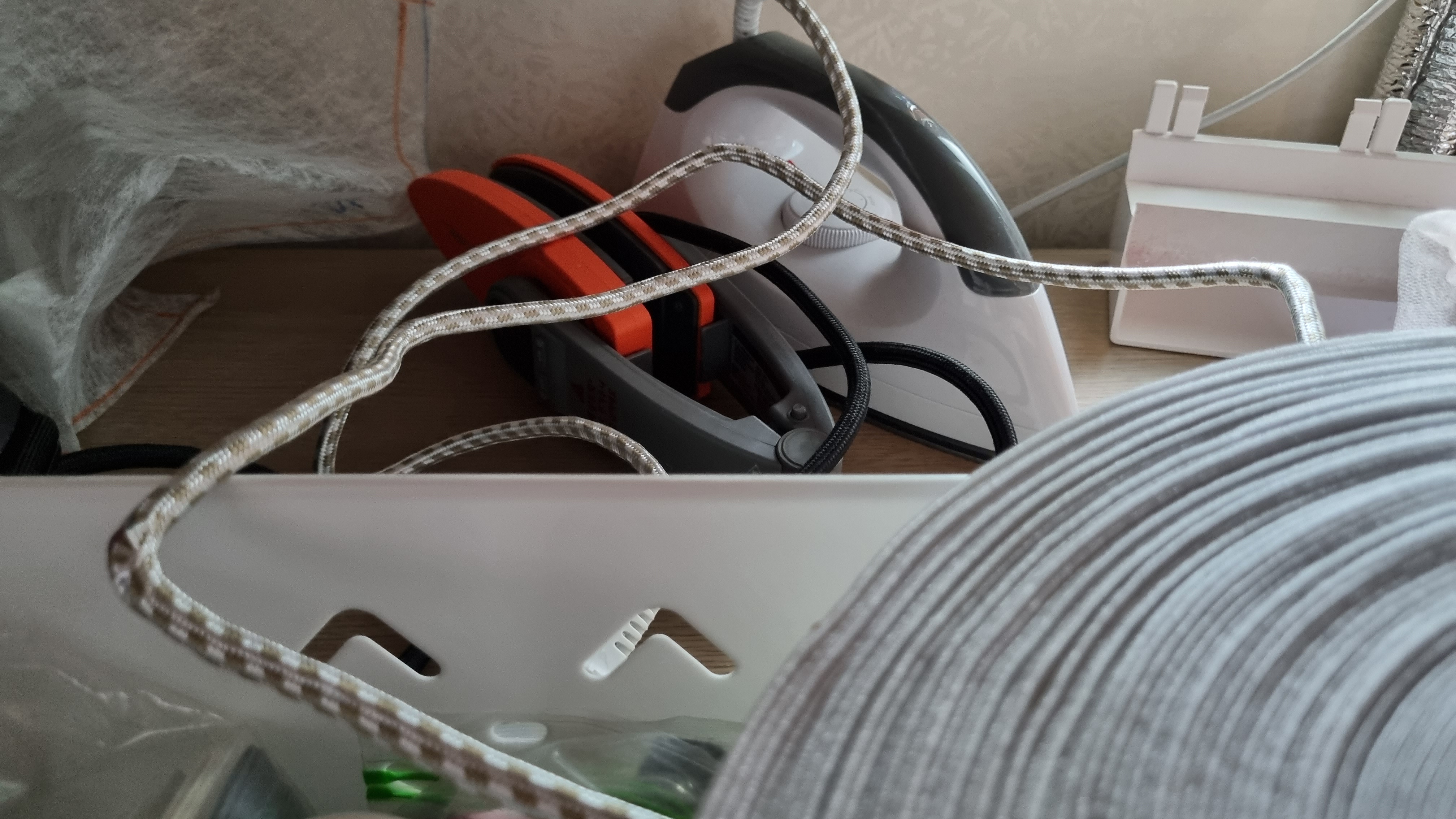 구석에 처박힌 다리미. 다림질을 하면 확실히 재봉틀 하기도 편하다. 특히 목둘레, 소매 둘레, 밑단은 최대한 다림질을 하는 게 미싱 하기 편하다. 하지만 어느 순간 재봉틀이 익숙해지면서 다림질을 하지 않게 됐다.
