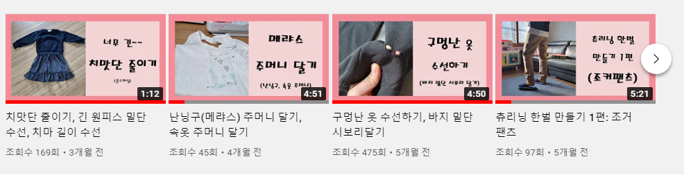딱히 재봉틀을 가르쳐주는 학원도 없고 그나마 재봉틀을 배우려면 문화센터에 가야 된다. 집콕 취미를 배우러 밖으로 나가는 일은 꽤 귀찮은 일이다. 미싱을 배우기 위해 유튜브 영상을 검색했다. 역시 고수님의 유튜브 영상은 참 쉽고 빠르게 예쁜 옷이 완성된다. 그러나, 내가 본 유튜브 영상도 많은 시간에 걸쳐 편집되어 올라왔다는 사실을 그때는 미처 생각하지 못했다.
