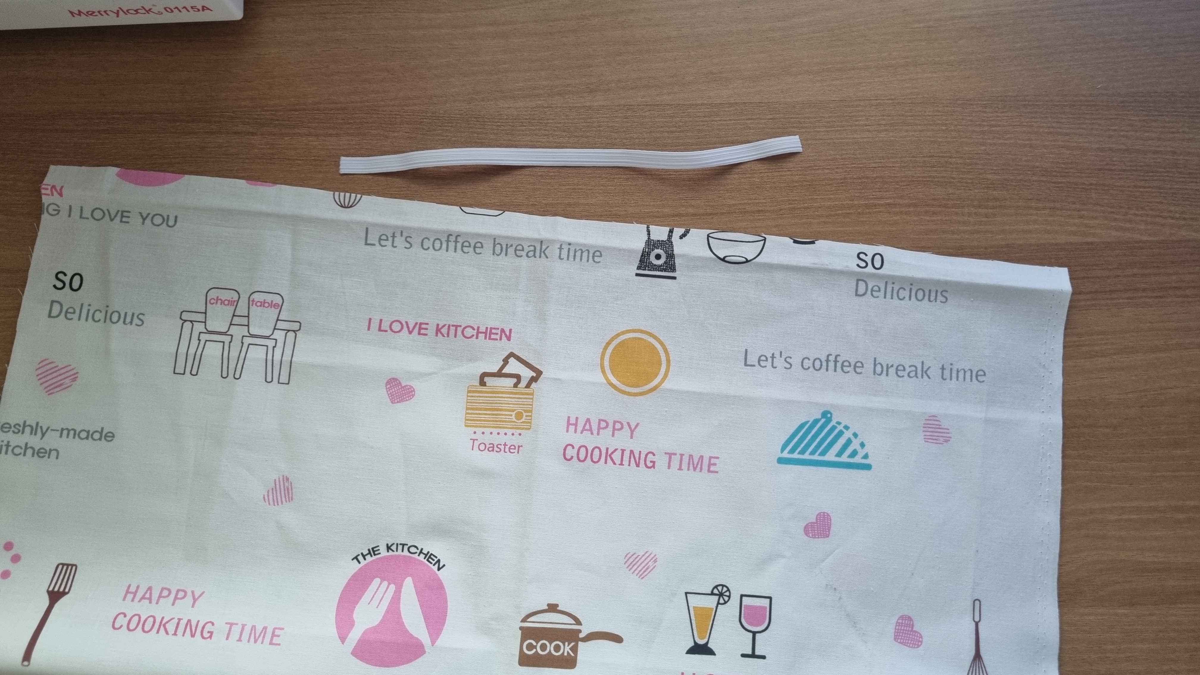 원단에 고무줄을 박기 위해서 위의 사진과 같이 원단과 고무줄을 준비했어요. 고무줄은 약 20cm, 원단은 약 40cm 정도 크기예요. 원단의 길이가 고무줄의 2배가 되어야 주름이 예쁘다는 불편의 법칙이 있어요. 그냥 저의 생각이에요.