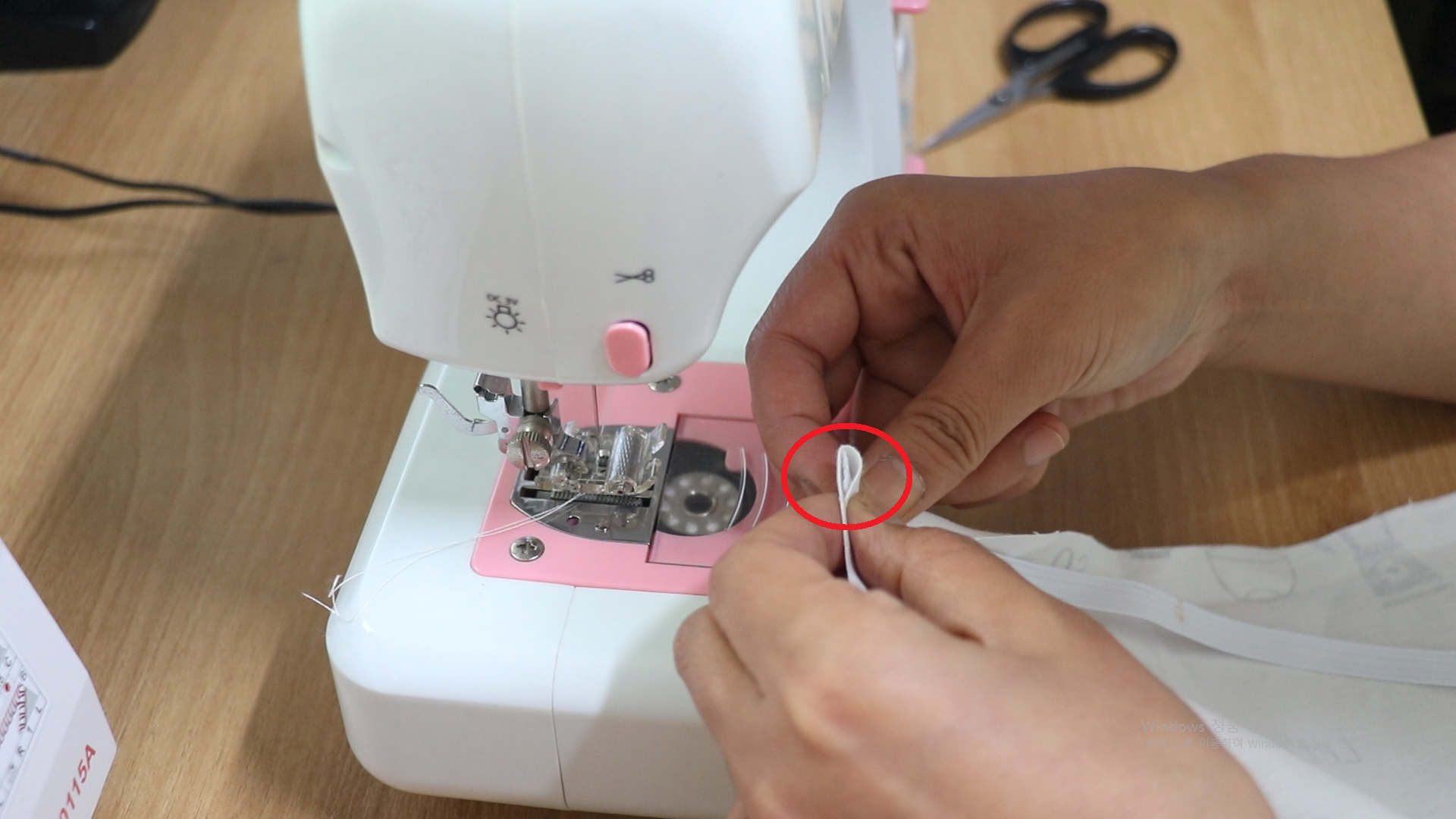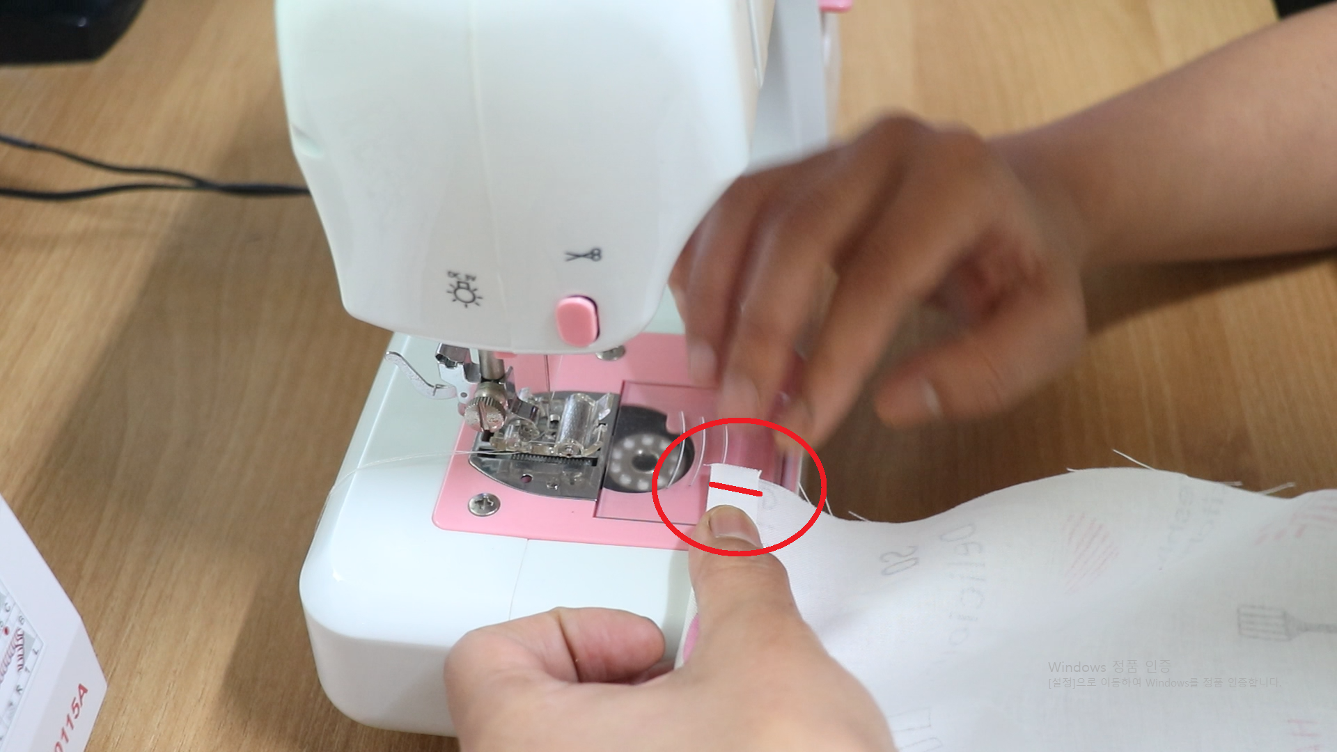 먼저 위의 사진에서 빨간 동그라미 부분과 같이 원단 끝과 고무줄 끝을 맞춰요.