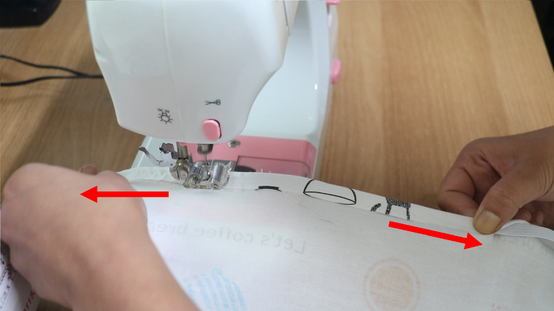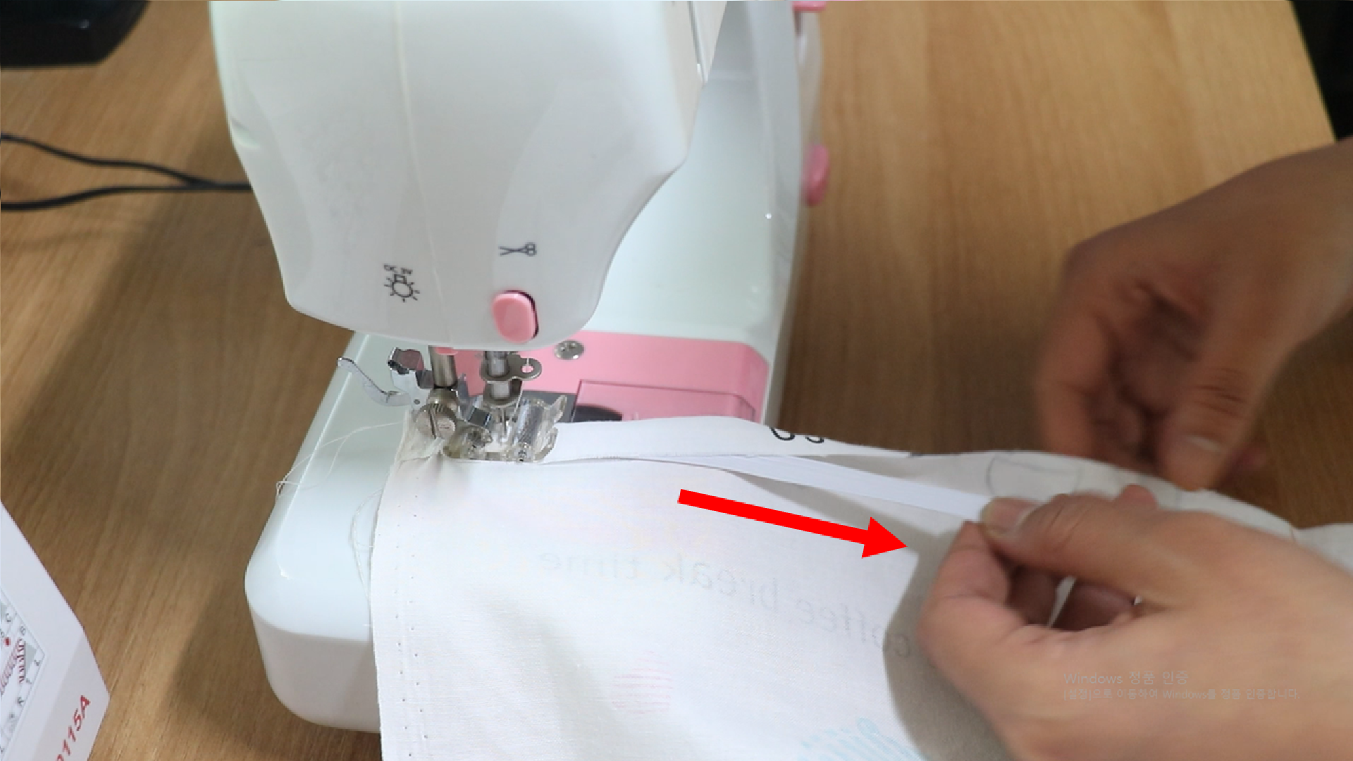 고무줄을 원단과 같이 박으면서 주름이 생기게 하려면 고무줄을 당기면서 박아야 해요. 위의 사진과 같이 고무줄을 쭉쭉 당기면서 박아요.