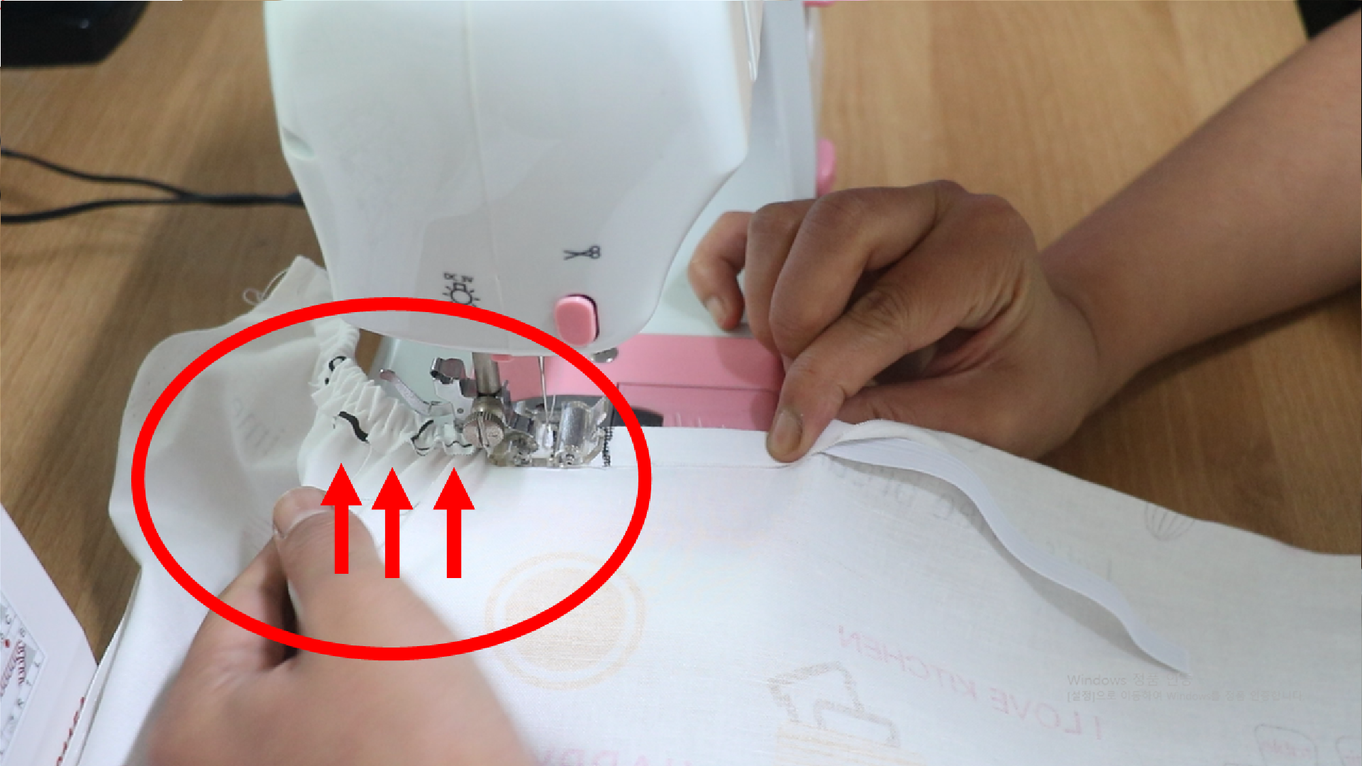 고무줄을 원단과 같이 박으면서 주름이 생기게 하려면 고무줄을 당기면서 박아야 해요. 위의 사진과 같이 고무줄을 쭉쭉 당기면서 박아요.